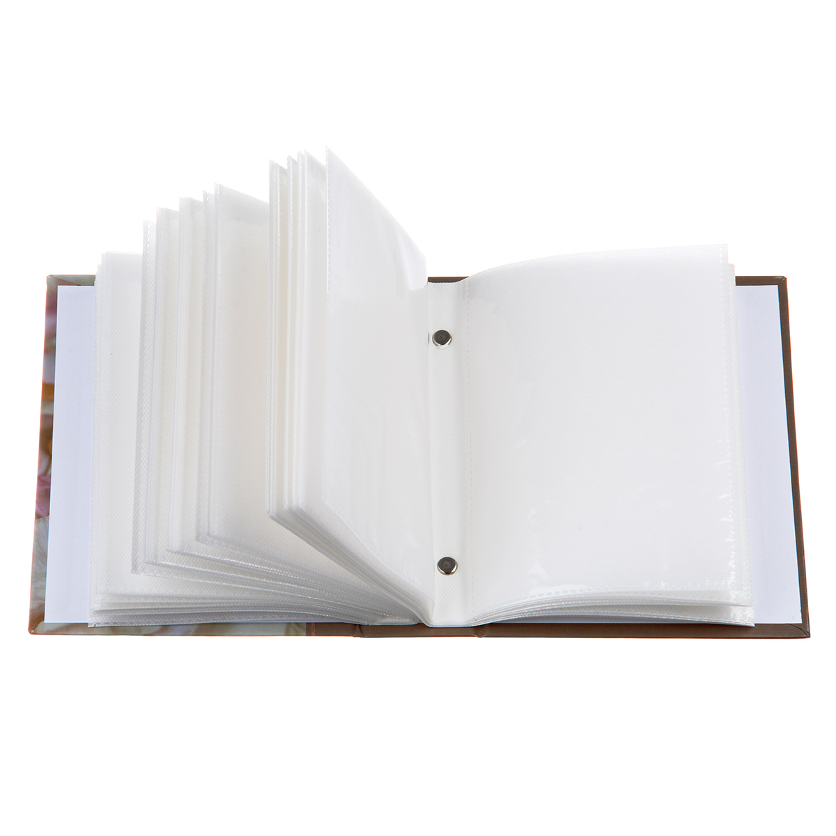 Стильный и красивый альбом вмещает в себя 100 фотографий формата 10х15 см. Пластиковые кармашки, 50 листов, скрепленных болтами, по одной фотографии на странице.