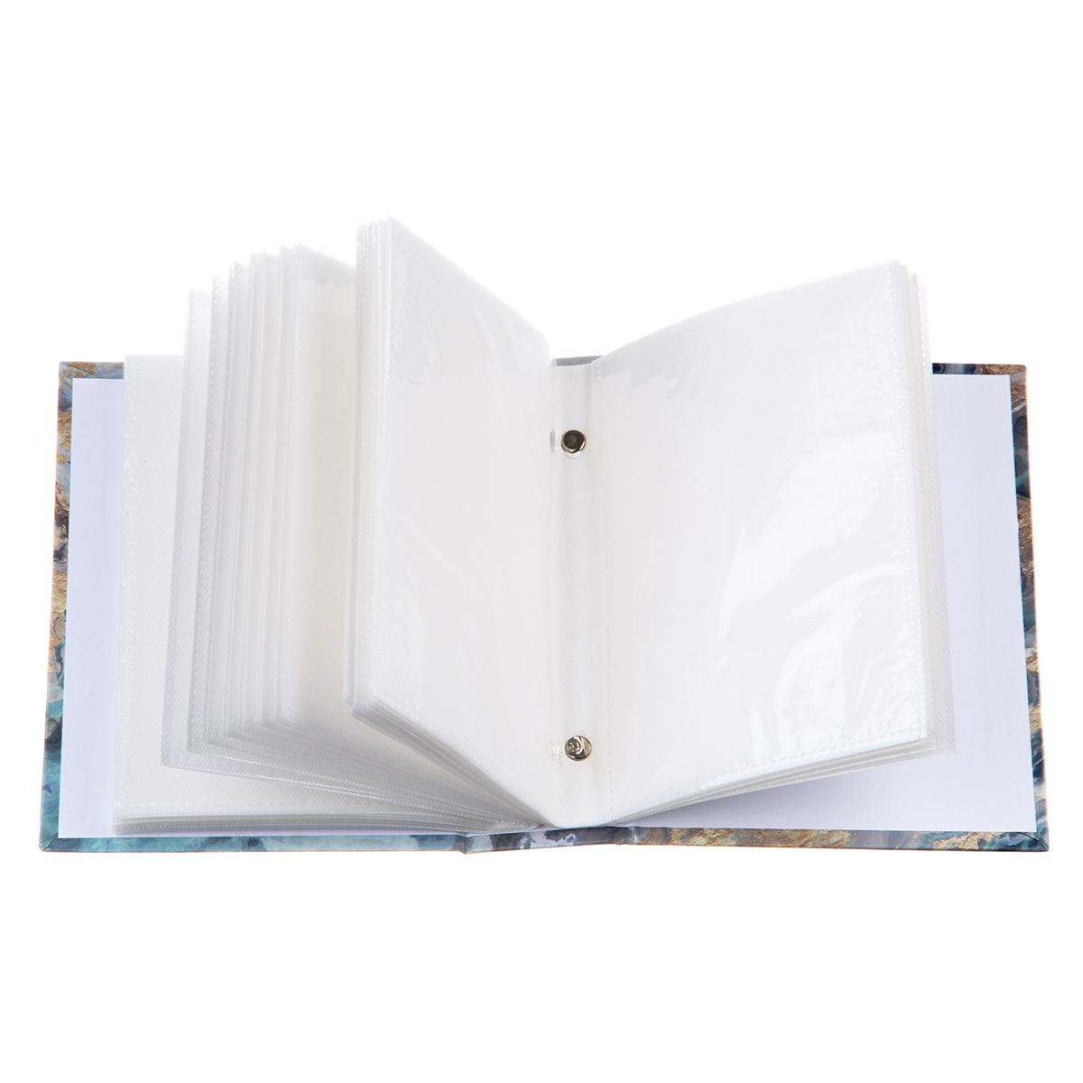 Стильный и красивый альбом вмещает в себя 100 фотографий формата 10х15 см. Пластиковые кармашки, 50 листов, скрепленных болтами, по одной фотографии на странице.