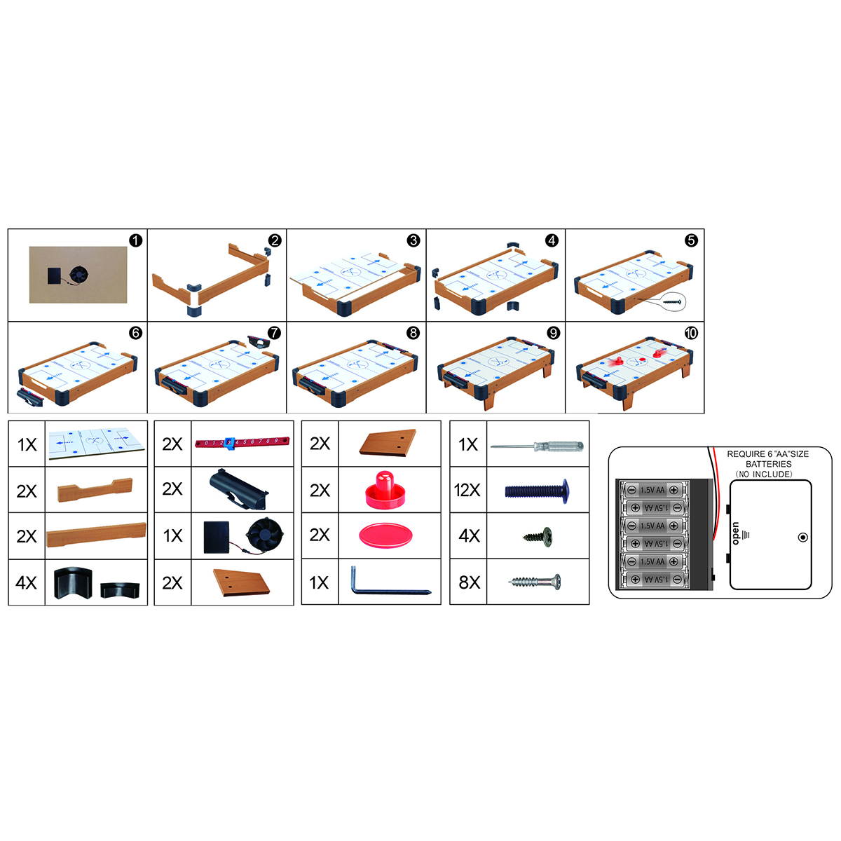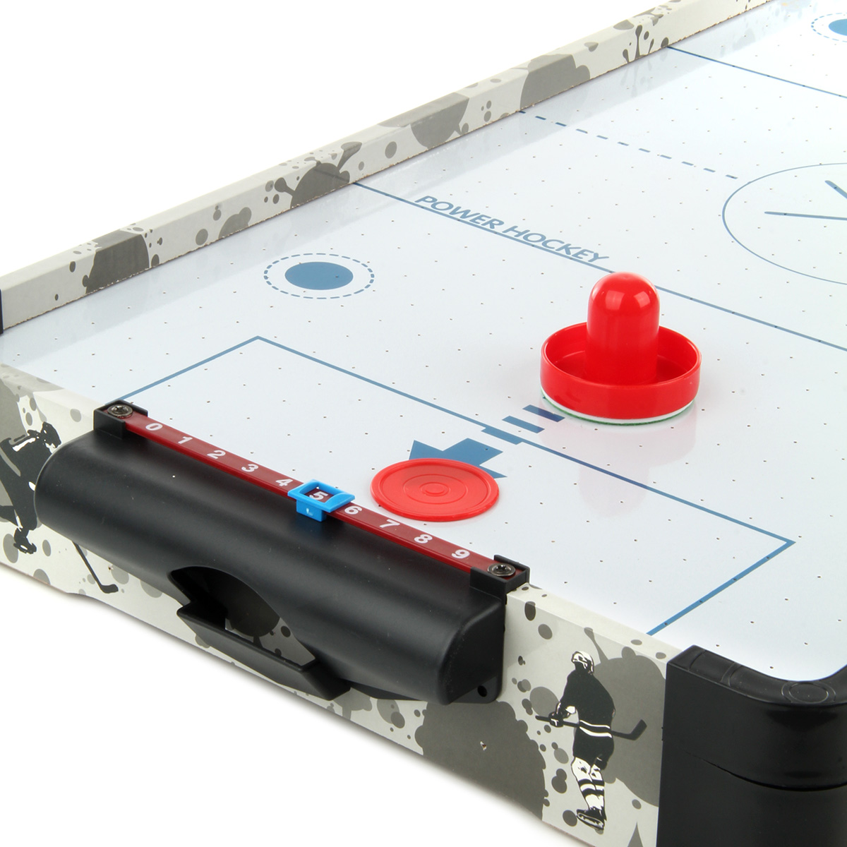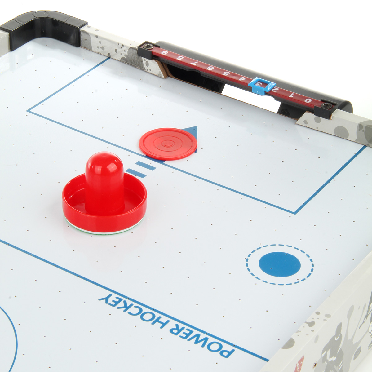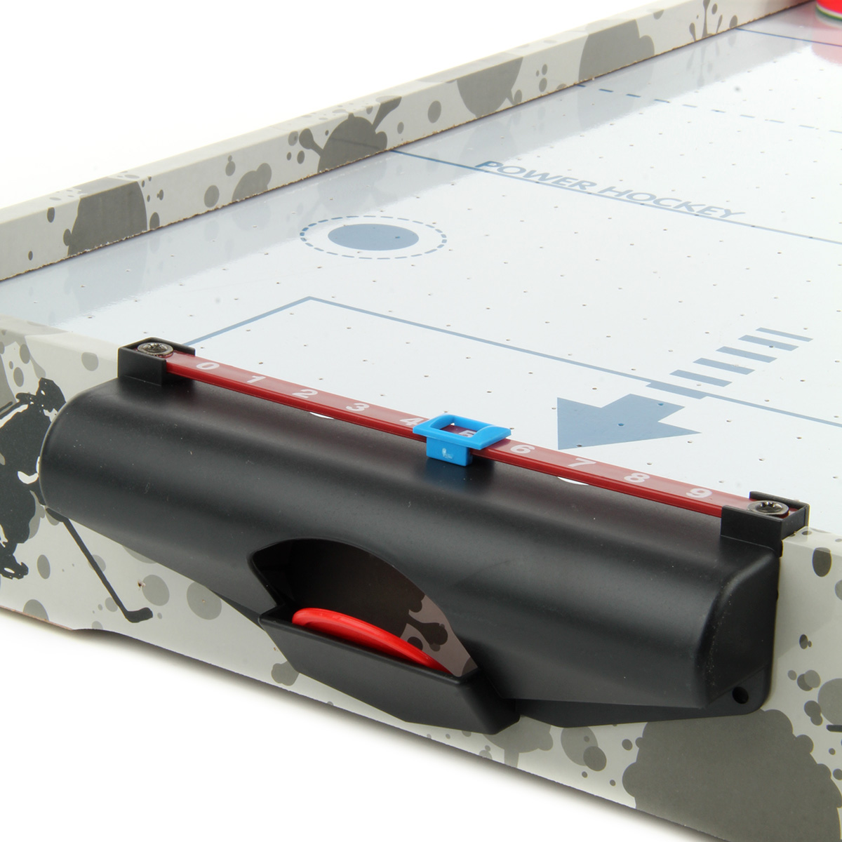 В комплекте детали для сборки игровой площадки, 2 биты, 2 шайбы, ключ. Передвигаем боковые бегунки, считаем очки. С внутренней стороны аэрохоккея есть вентилятор, нагоняет воздух для лучшего скольжения шайбы.