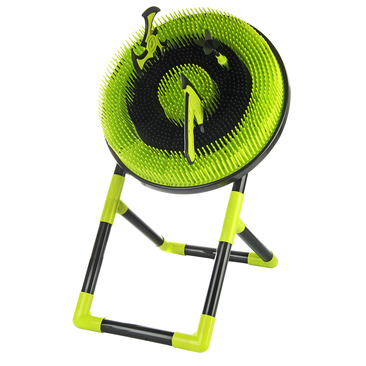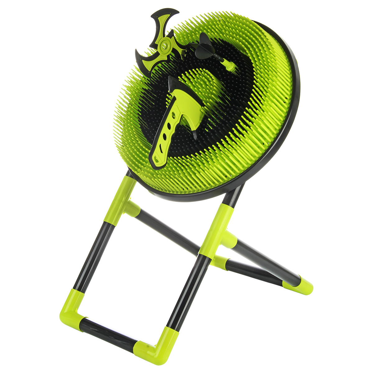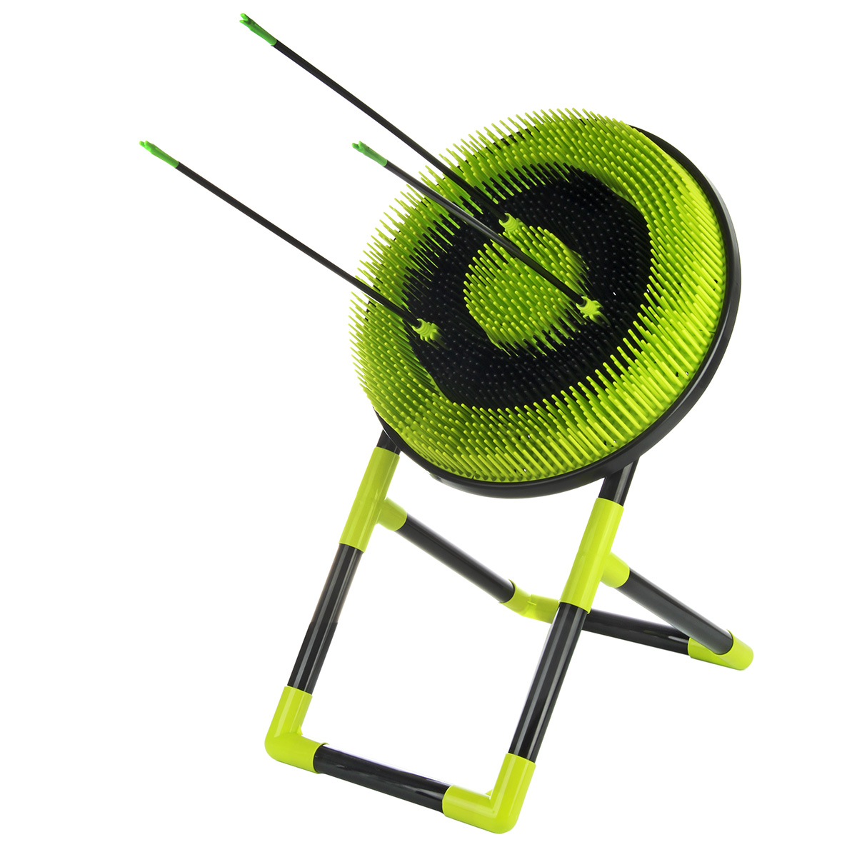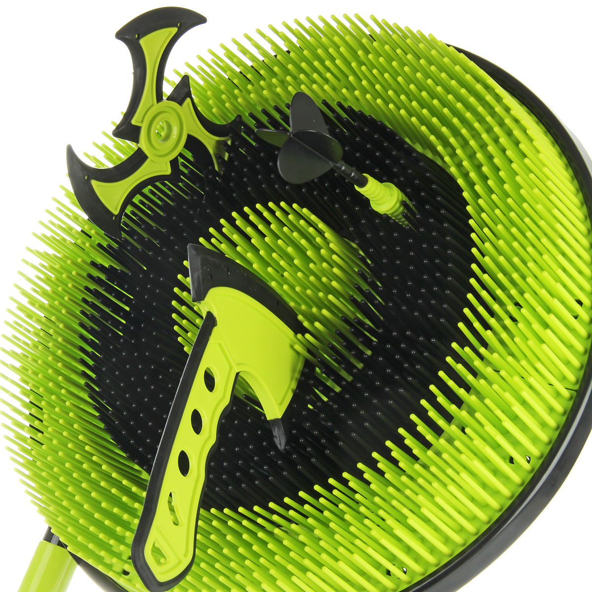 У мишени прорезиненные ворсинки язычки, после броска все предметы в них застревают. Круглую мишень можно отсоединить от подставки.