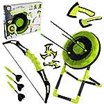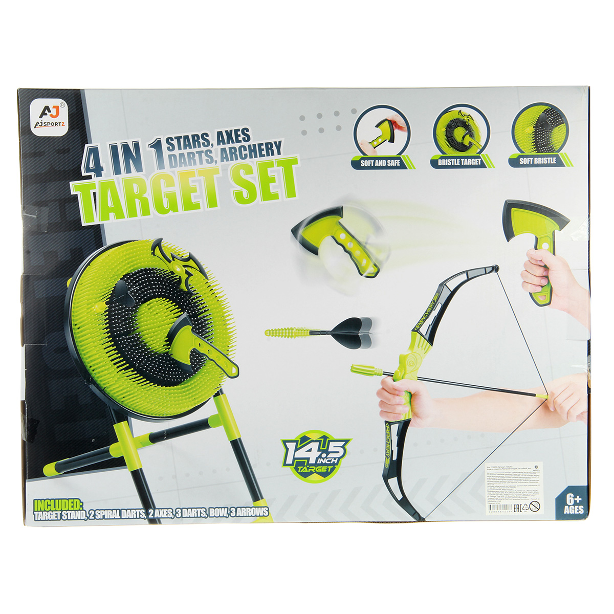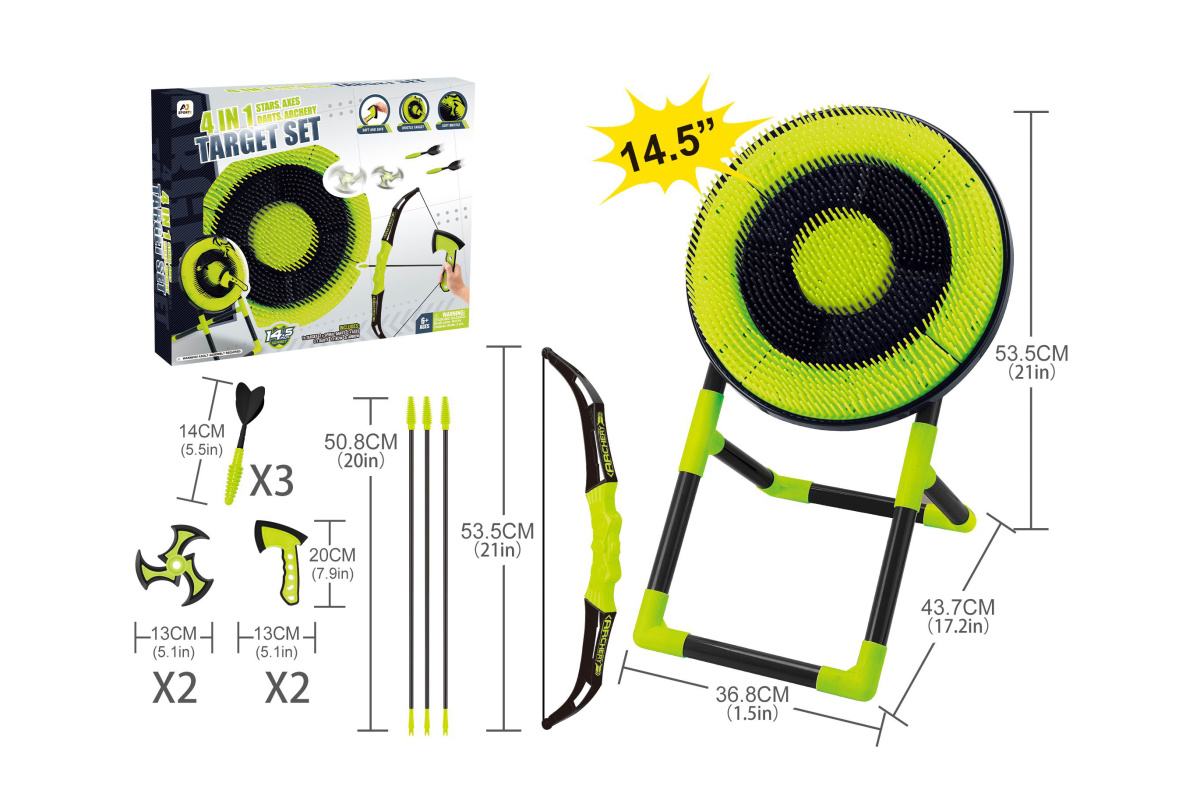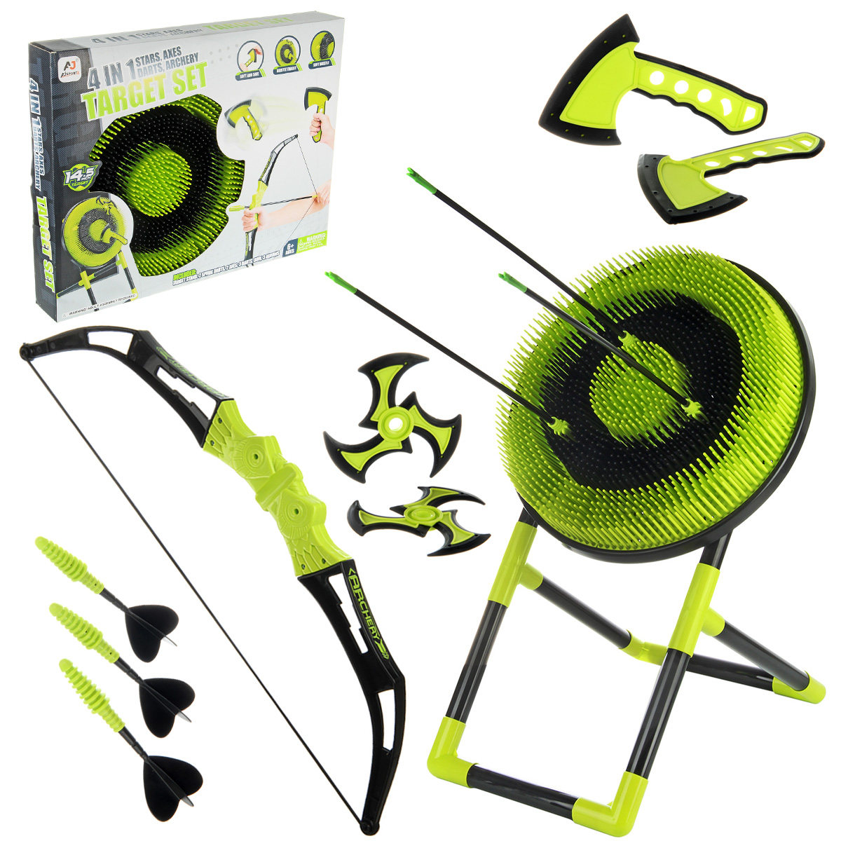 В наборе детали для сборки мишени, лук, 3 стрелы, 3 дротика, 2 топорика, 2 сюрикена.
