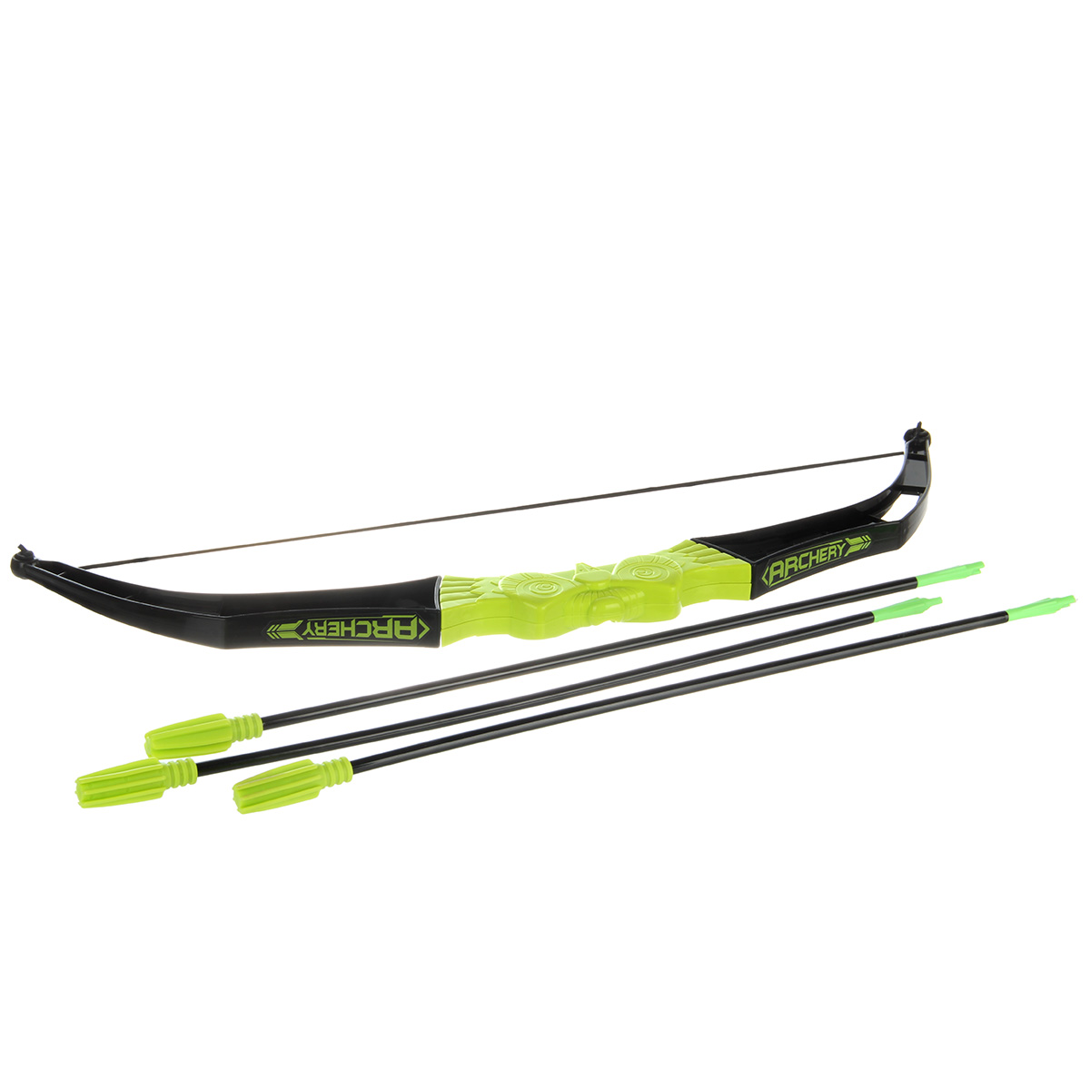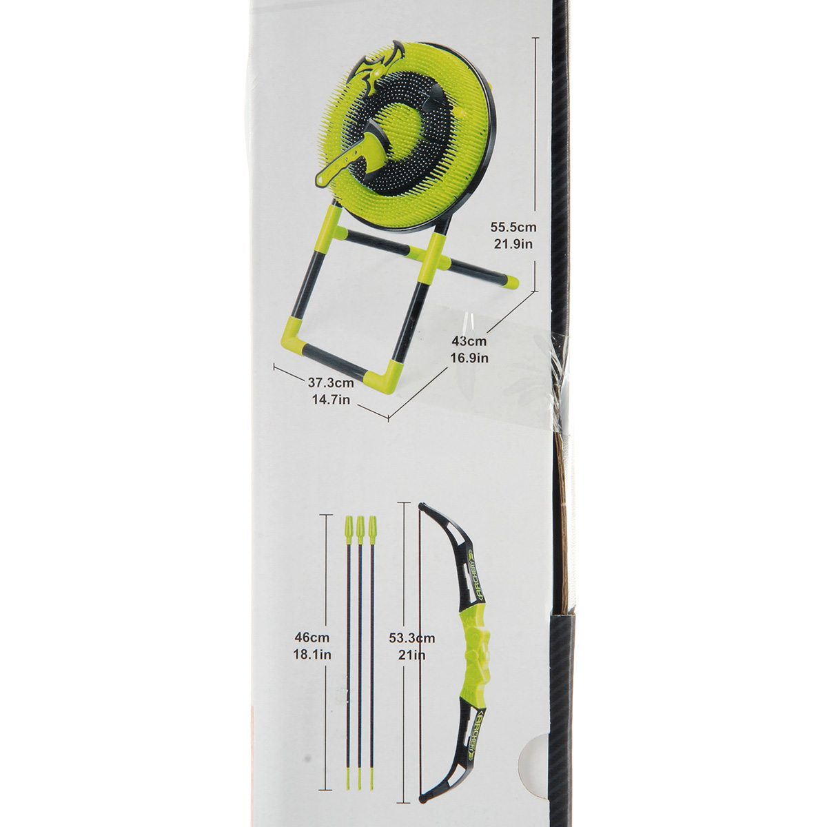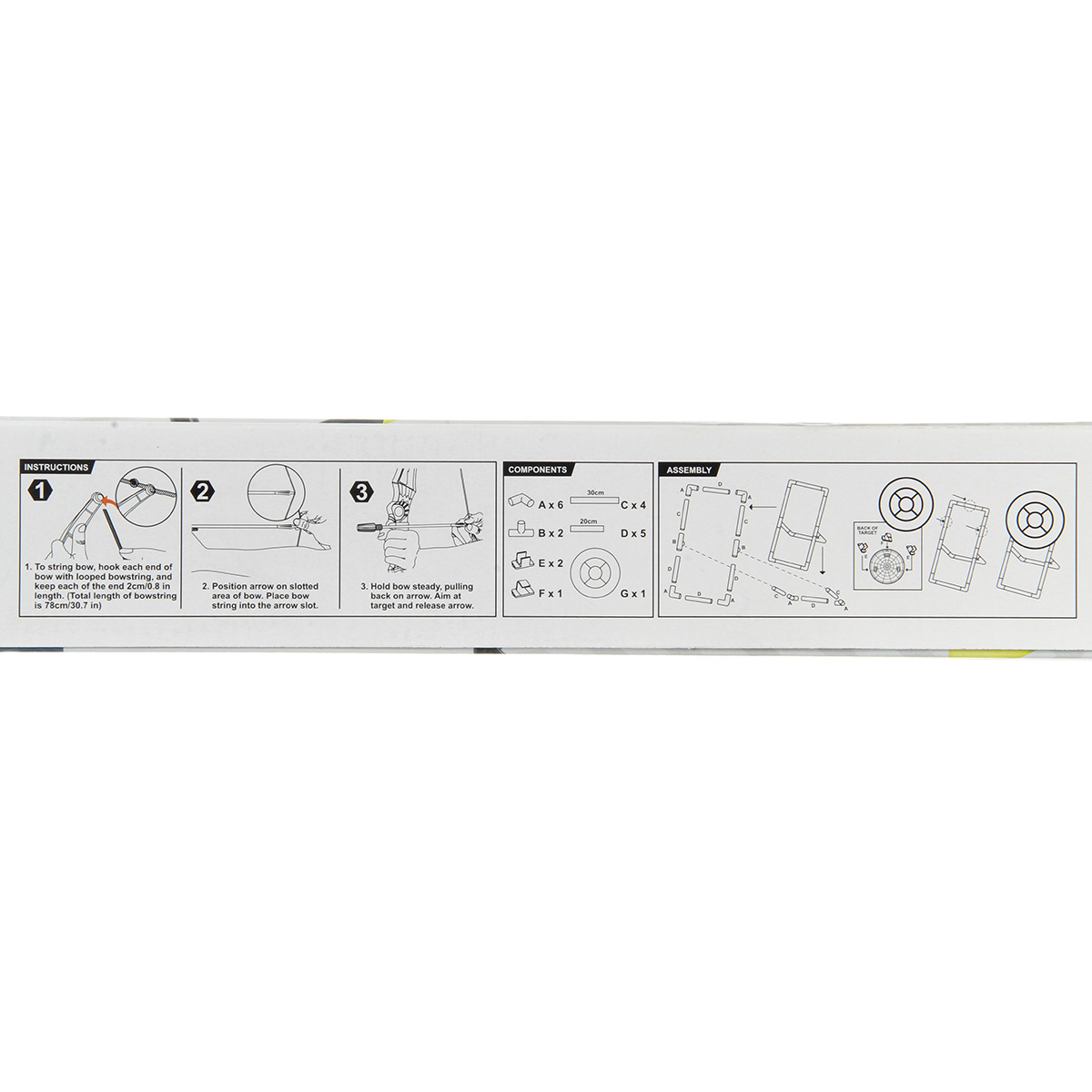 В наборе детали для сборки мишени, лук, 3 стрелы, 3 дротика, 2 топорика, 2 сюрикена.