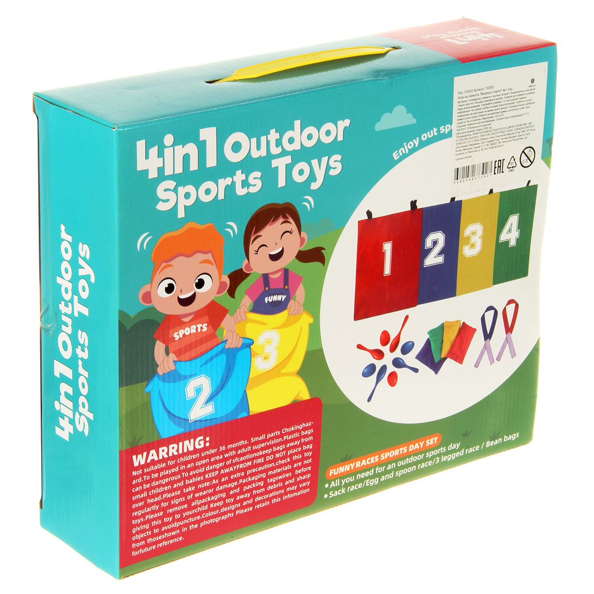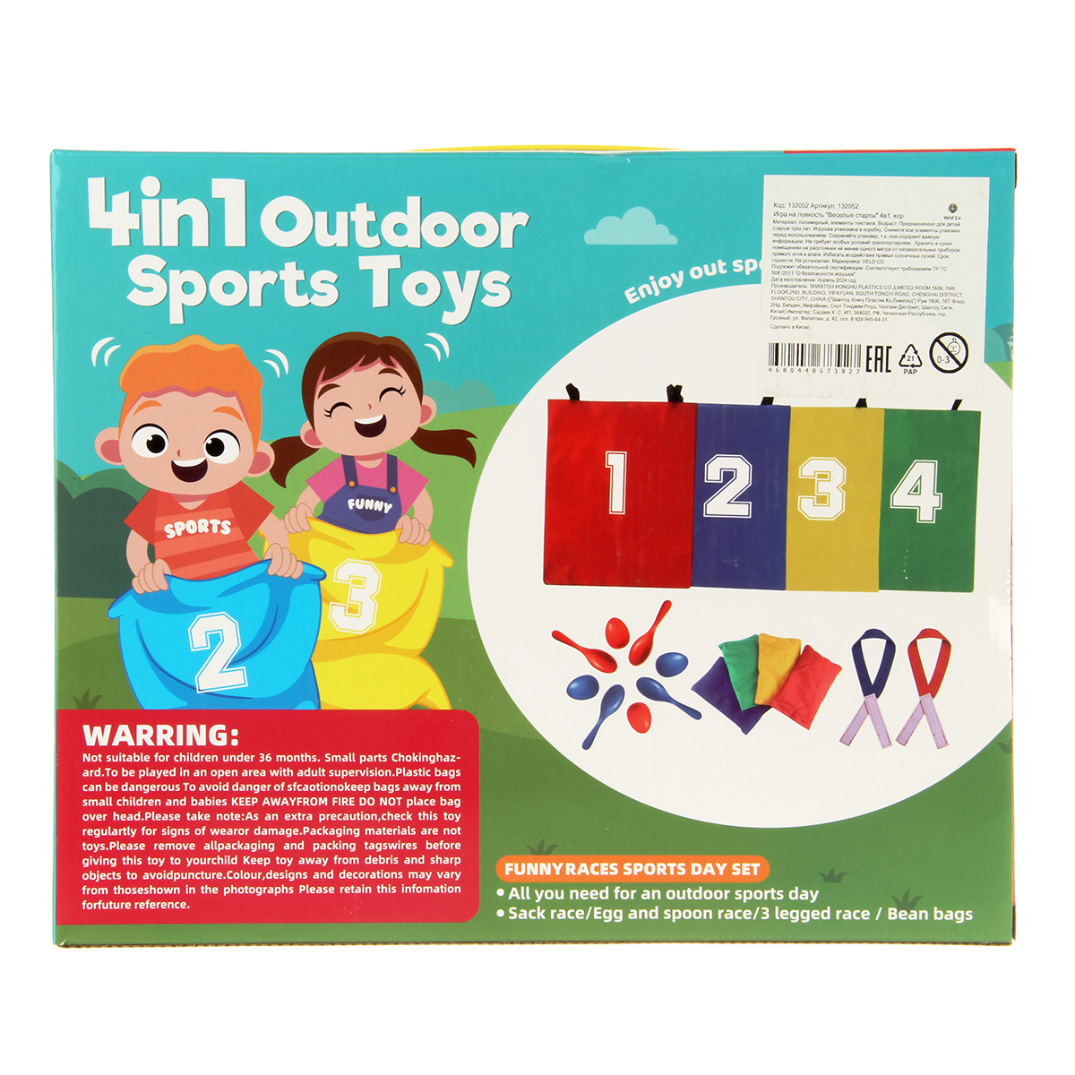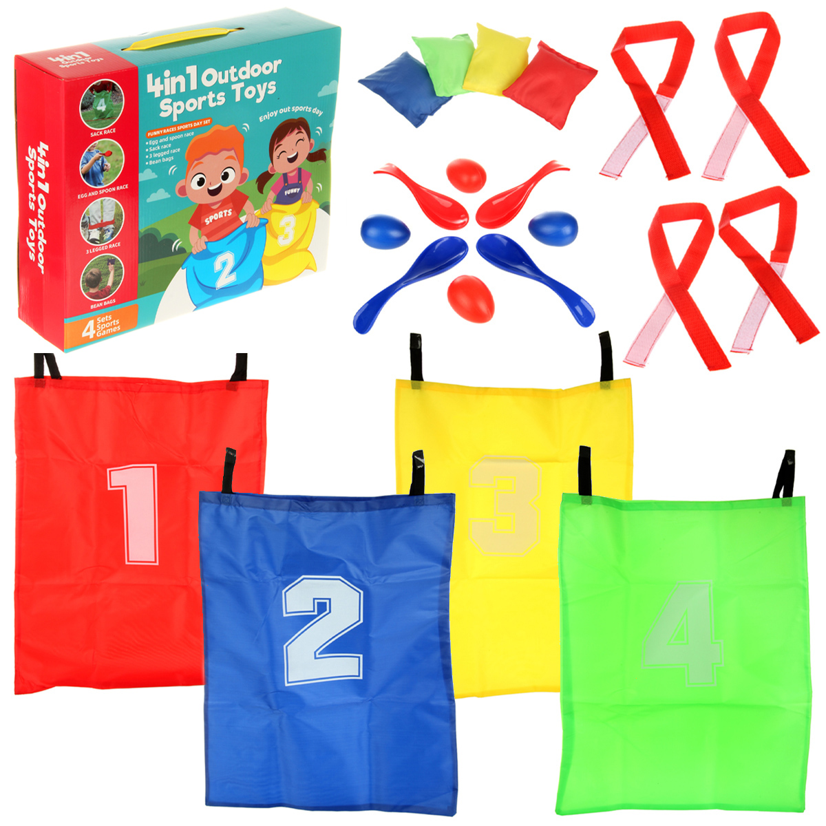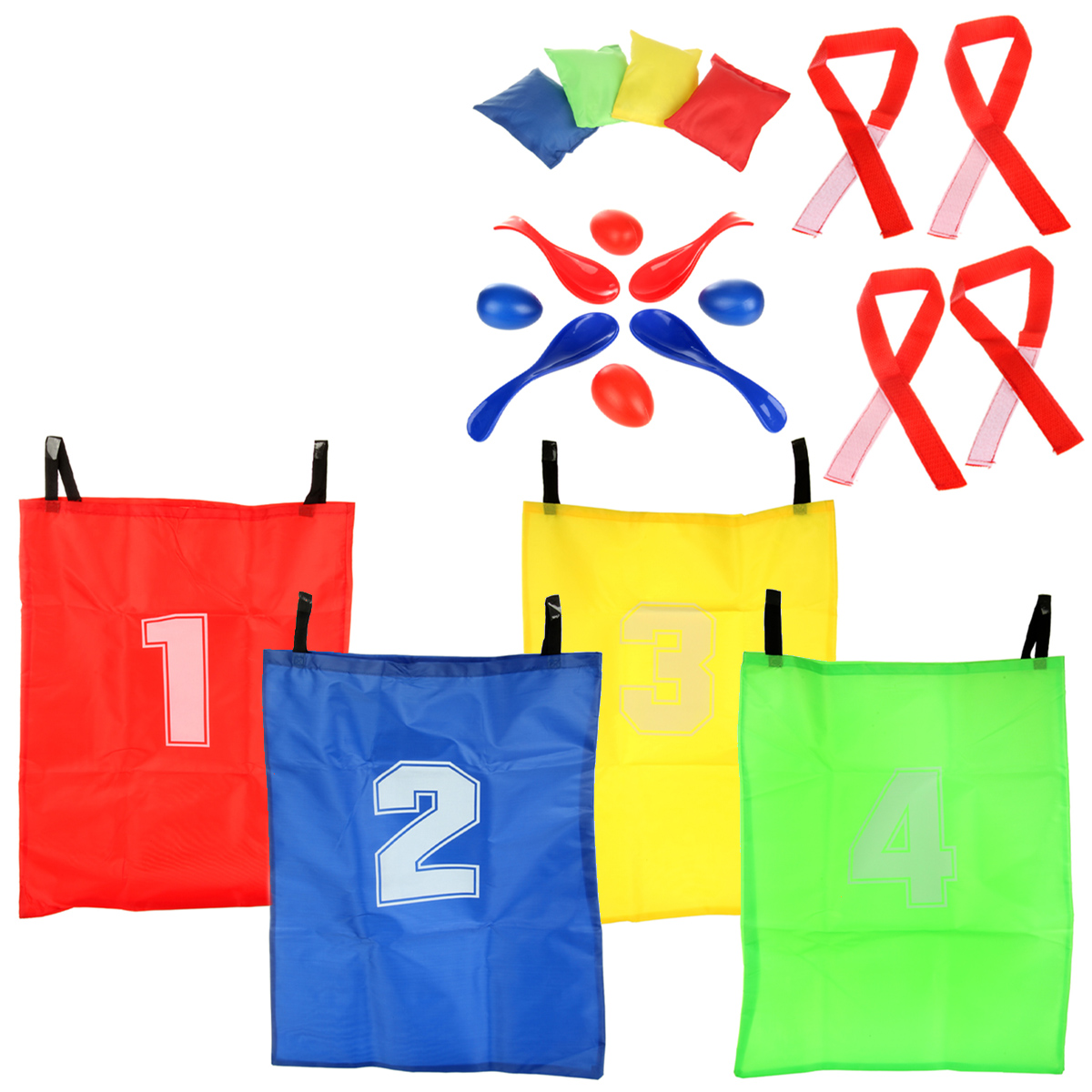 В наборе 4 мешка для бега, 4 мешочка для метания, 4 ложки, 4 яйца, 4 лямки для ног.