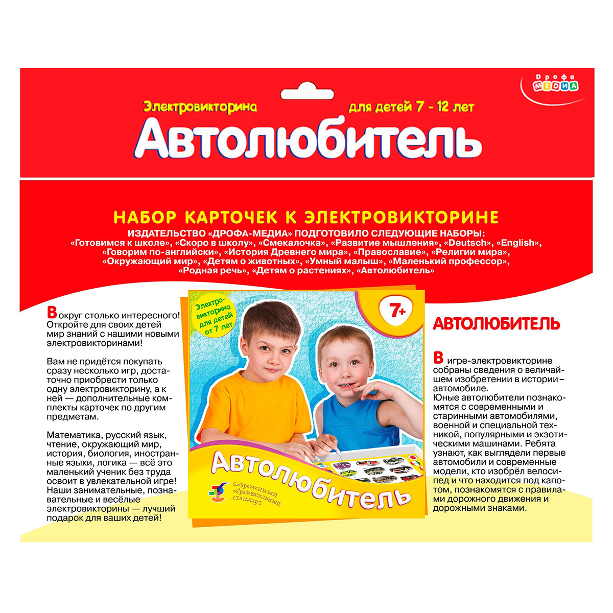 Дополнительный набор карточек к любой электровикторине в коробке. К любой нашей электровикторине подходят наборы карточек от других игр этой серии. Поэтому, если у вас уже есть одна электровикторина, то покупать другие игры этой серии в коробках не нужно, достаточно приобрести дополнительные наборы карточек к уже имеющейся игре. В игре-электровикторине собраны сведения о величайшем изобретении в истории — автомобиле. Юные автолюбители познакомятся с современными и старинными автомобилями, военной и специальной техникой, популярными и экзотическими машинами. Ребята узнают, как выглядели первые автомобили и современные модели, кто изобрёл велосипед и что находится под капотом, познакомятся с правилами дорожного движения и дорожными знаками. ТЕМЫ КАРТОЧЕК: Найди части автомобиля Что находится под капотом автомобиля? Что находится на приборной доске перед водителем? Как называется тип кузова? Как выглядели первые машины? Как выглядели первые автомобили? Как выглядели автомобили в начале ХХ века? Какие маш