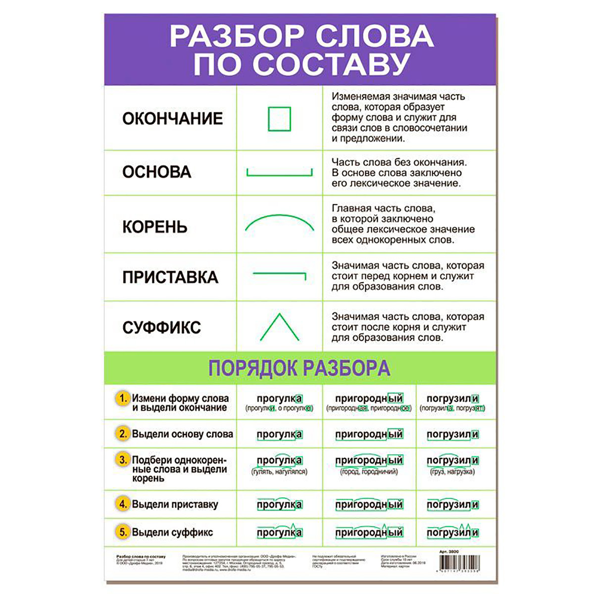 Плакат даёт представление о частях слова, приводит их определение, показывает графическое обозначение. Приведён порядок разбора по составу существительного, прилагательного и глагола. Рекомендуется использовать в качестве наглядного пособия дома и в школе. Возраст: от 7 лет.