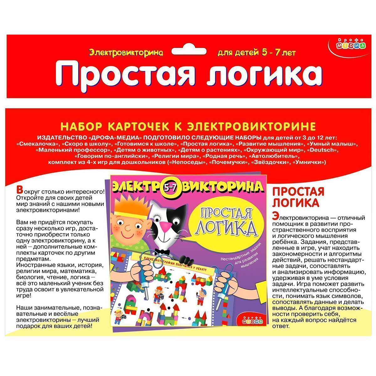 Дополнительный набор карточек к любой электровикторине в коробке. К любой нашей электровикторине подходят наборы карточек от других игр этой серии. Поэтому, если у вас уже есть одна электровикторина, то покупать другие игры этой серии в коробках не нужно, достаточно приобрести дополнительные наборы карточек к уже имеющейся игре. Электровикторина "Простая логика" – отличный помощник в развитии пространственного восприятия и логического мышления ребёнка. Задания, предствленные в игре, учат находить закономерности и алгоритмы действий, решать нестандартные задачи, сопоставлять и анализировать информацию, удерживая в уме условия задачи. Игра поможет развить интеллектуальные способности, понимать язык символов, сопоставлять данные и делать выводы. А благодаря возможности проверить себя, на каждый вопрос найдётся ответ. В комплекте: 10 двусторонних карточек, правила с ответами. Возраст: 5—7 лет. Внимание! Набор карточек не является самостоятельной игрой, а служит дополнением к электровикторине в коробке.