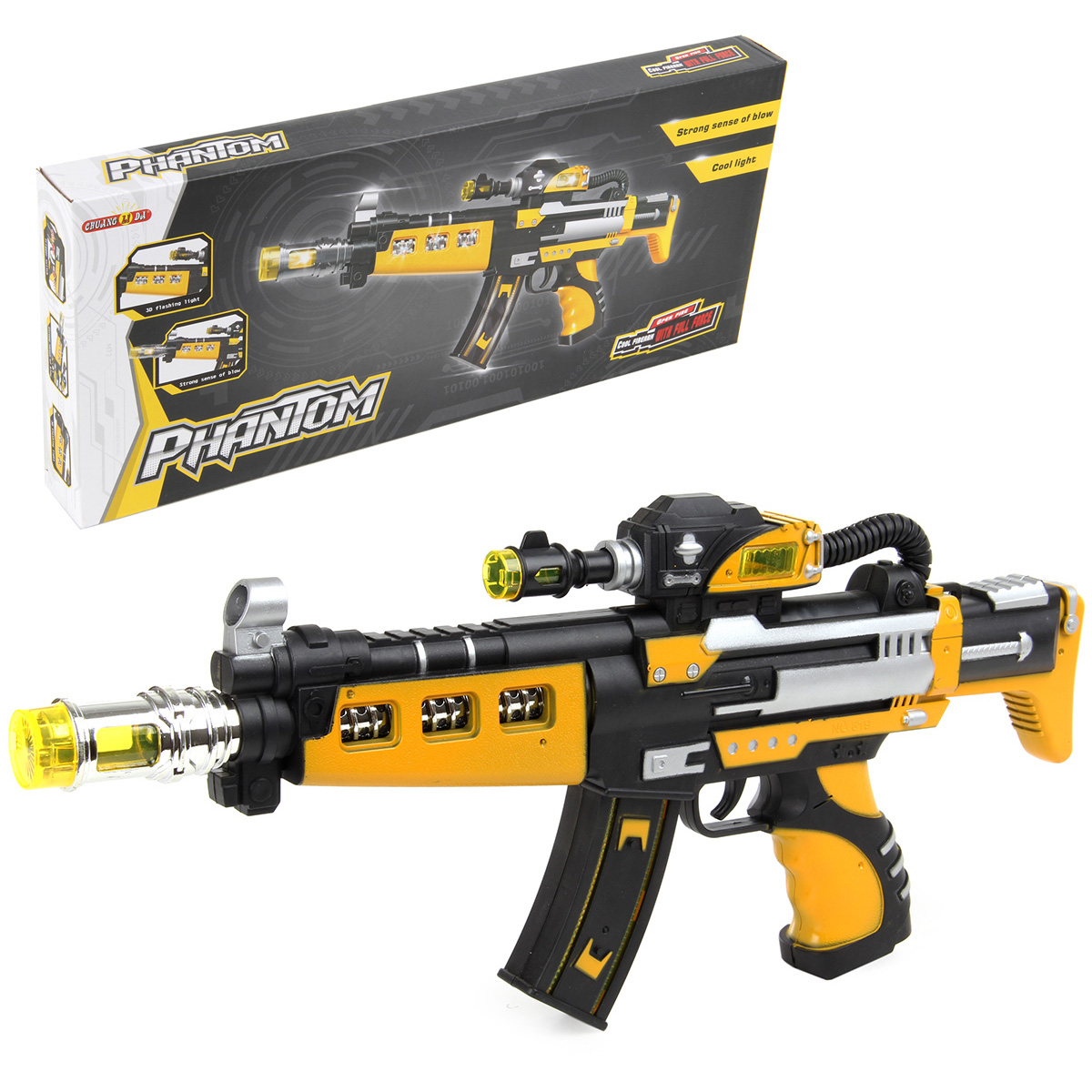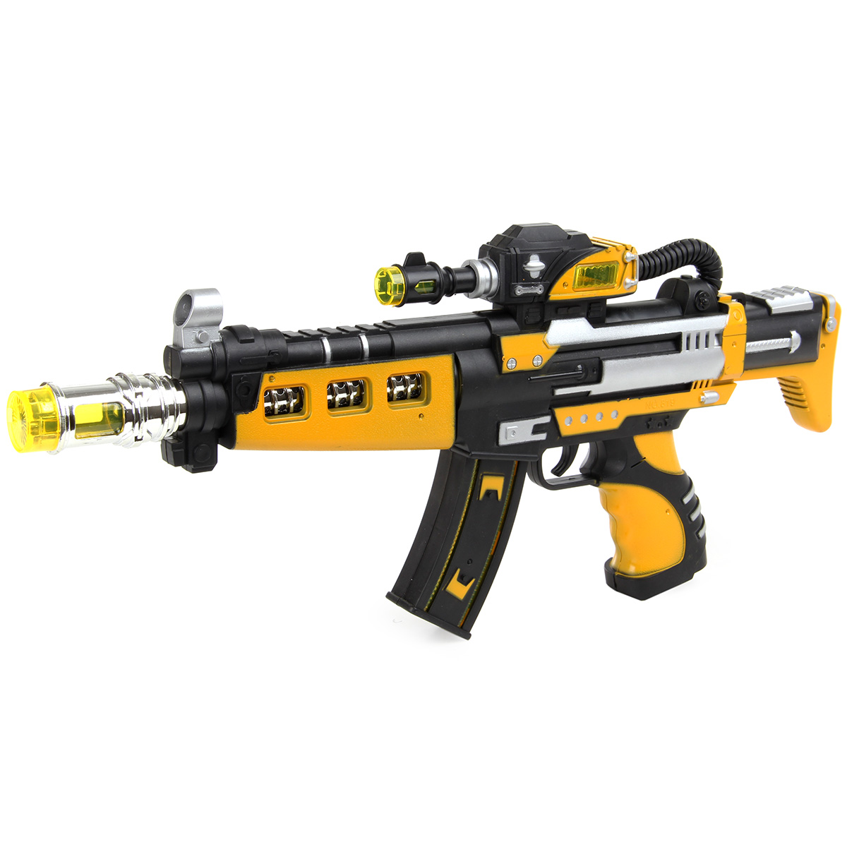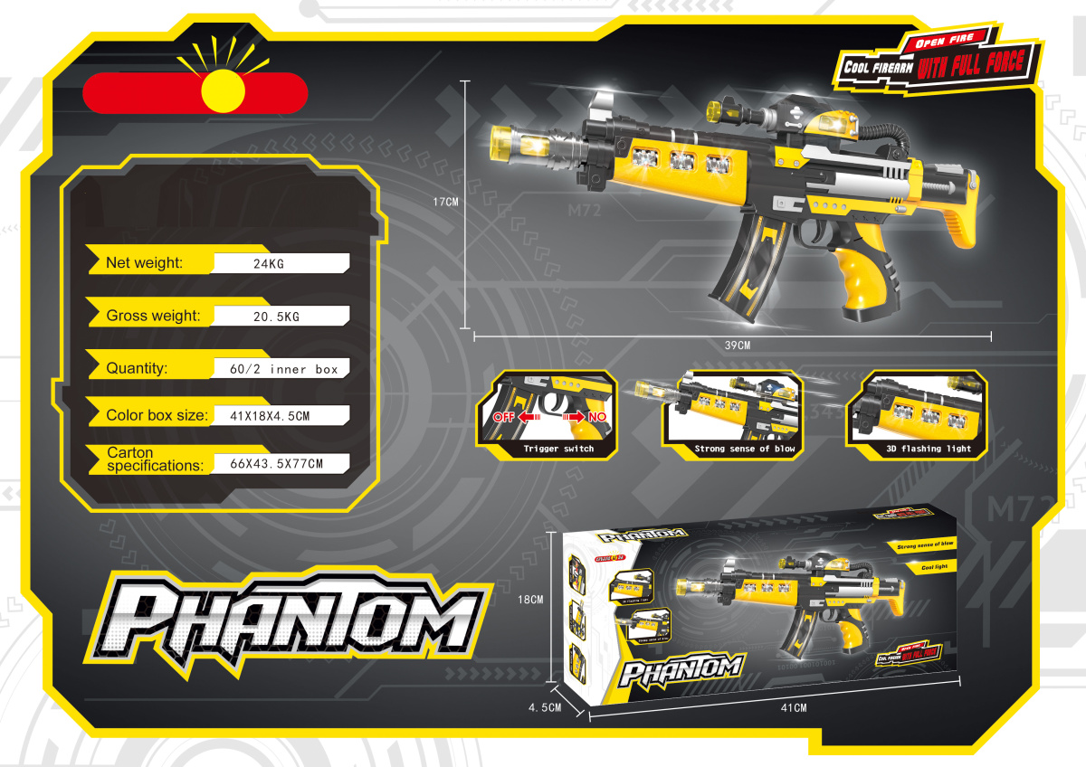 Ни одна игра в войнушку или секретных шпионов не обойдется без этого стильного и очень крутого оружия! Автомат издает звуки, его дуло, ствол, прицел и магазин подсвечиваются разными цветами, а в темноте он способен заменить фонарик, настолько ярко он светит! Автомат можно поставить на ровную поверхность, не боясь, что он упадет. Игрушка развивает меткость, ловкость, внимание, воображение, предрасполагает к сюжетно-ролевым играм, улучшает координацию движений. С ней можно совершенствовать не только физические данные ребенка, но и учить его тактике, стратегии и хитрости. Игрушка сделана из прочной и высококачественной пластмассы. Работает от 3 батареек АА, в комплект не входят. Размеры игрушки: 39*3,5*17 см. Размеры коробки: 40,5*4*17,5 см.