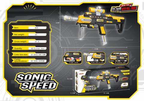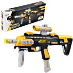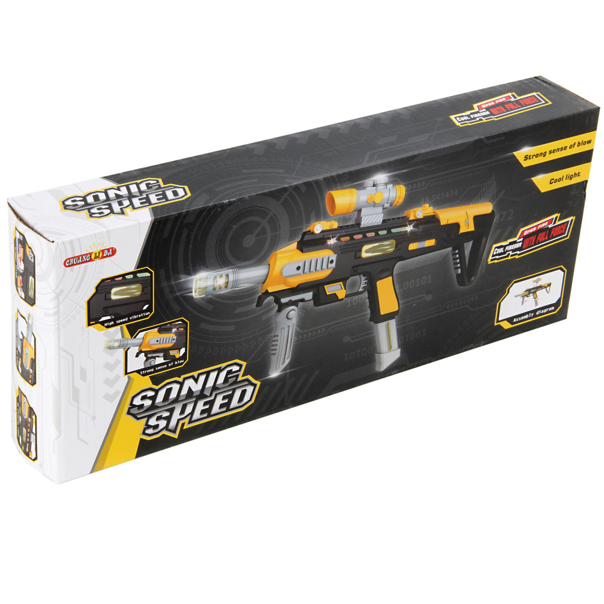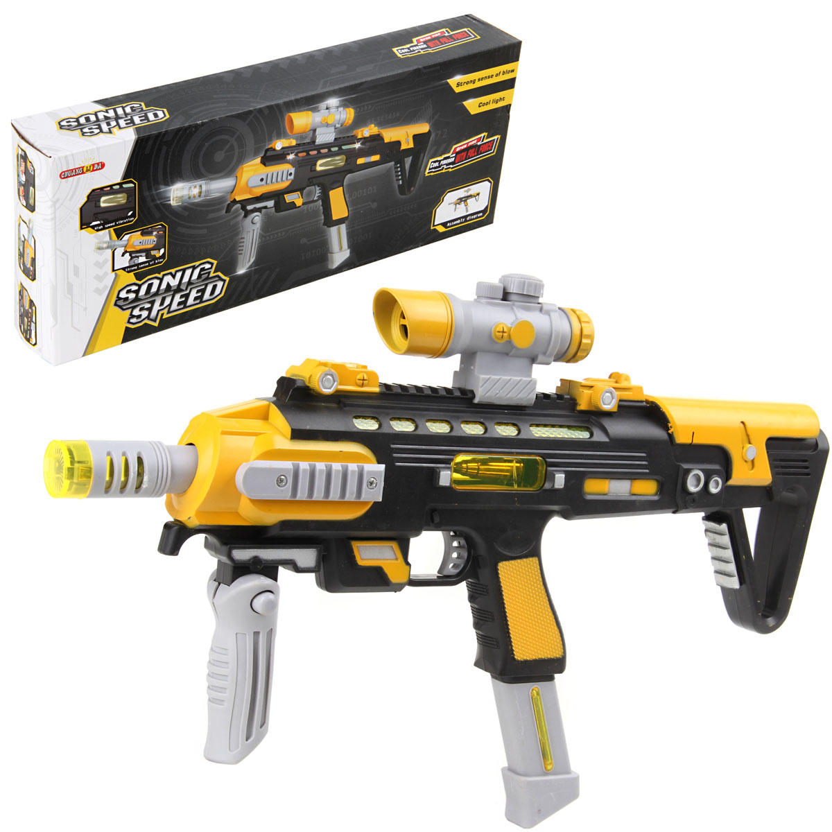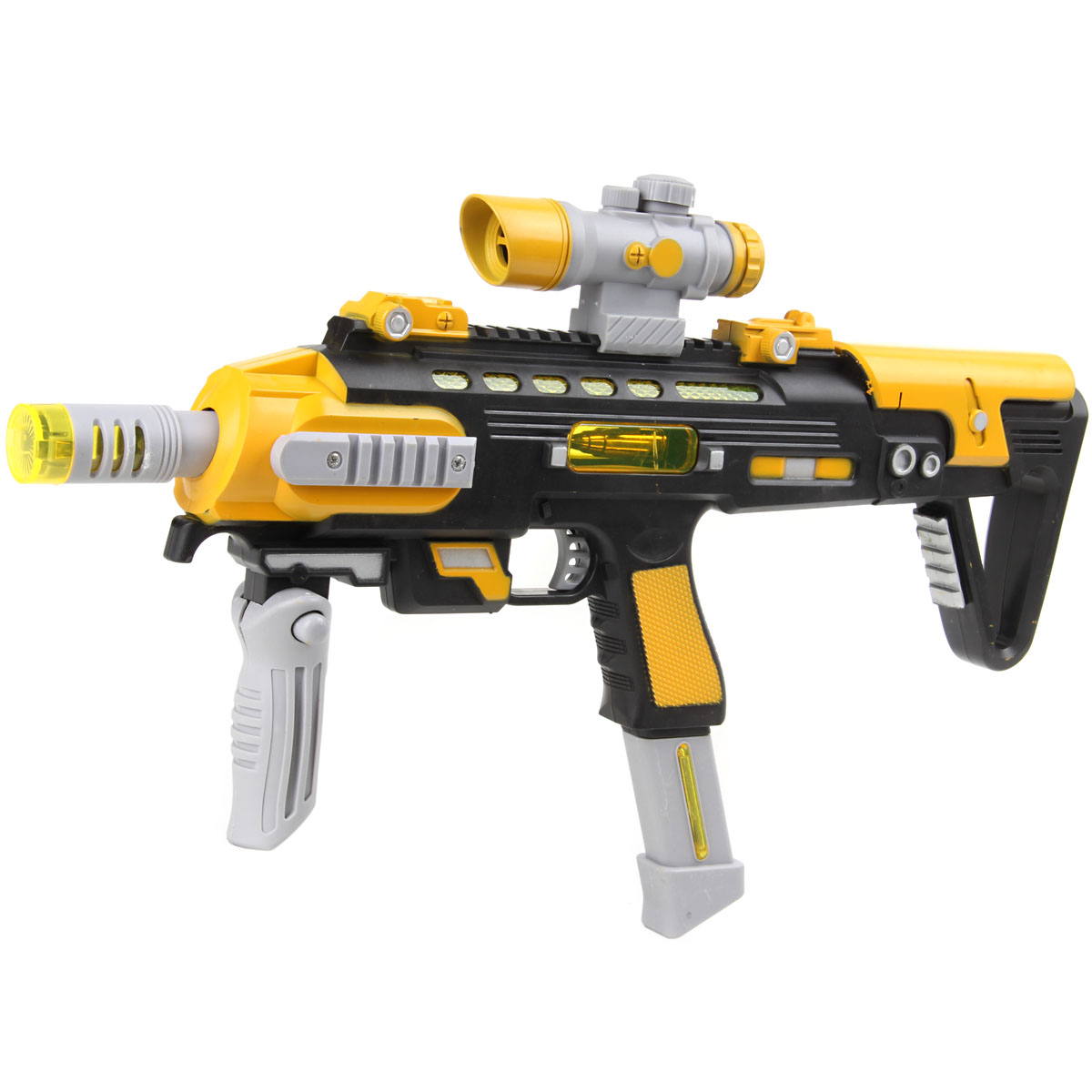 Детское оружие на батарейках для увлекательных игр. Игрушка оружие со светом и звуком оформлена в красивом дизайне, удобная рукоять, подарочная упаковка. Игрушечное оружие сделано из прочных и долговечных материалов, прослужит много лет. При нажатии на спусковой крючок издает звуки стрельбы, подсвечиваются магазин, вставки на стволе, вставка с патроном, дуло. Дуло и патрон двигаются вперед и назад, вибрация. Прицел снимается, в прицеле нет линз. Магазин вынимается. При нажатии на кнопку опускается серая ручка под стволом. Игрушка работает от 3 батареек АА, не входят в комплект. Батарейки вставляются в отсек рядом с прикладом. Полимер. Размеры игрушки с магазином и прицелом 37х5х24 см. Размеры коробки 37х6х15 см.