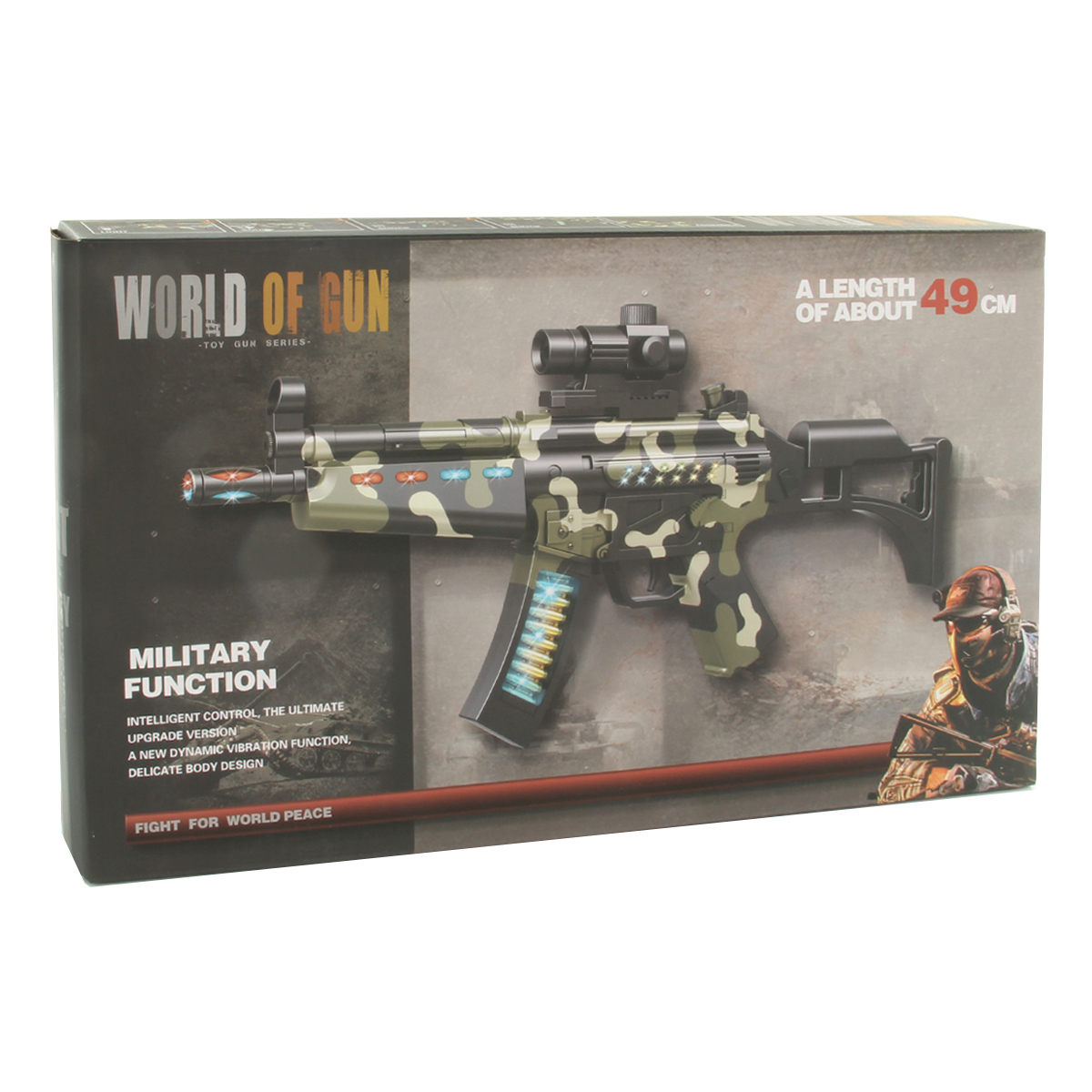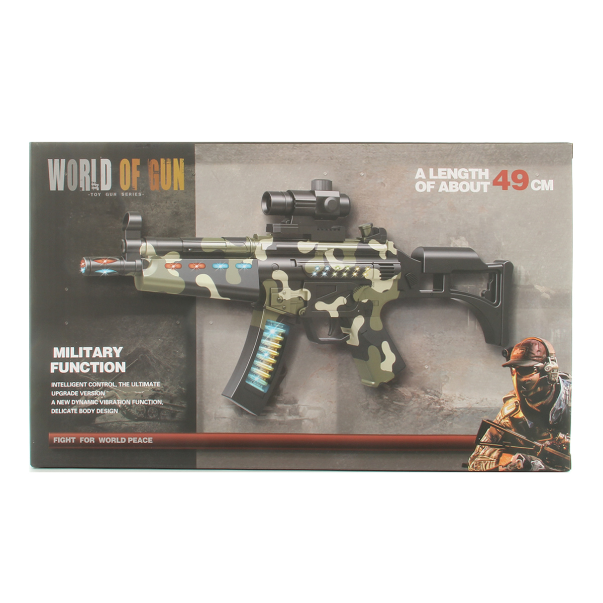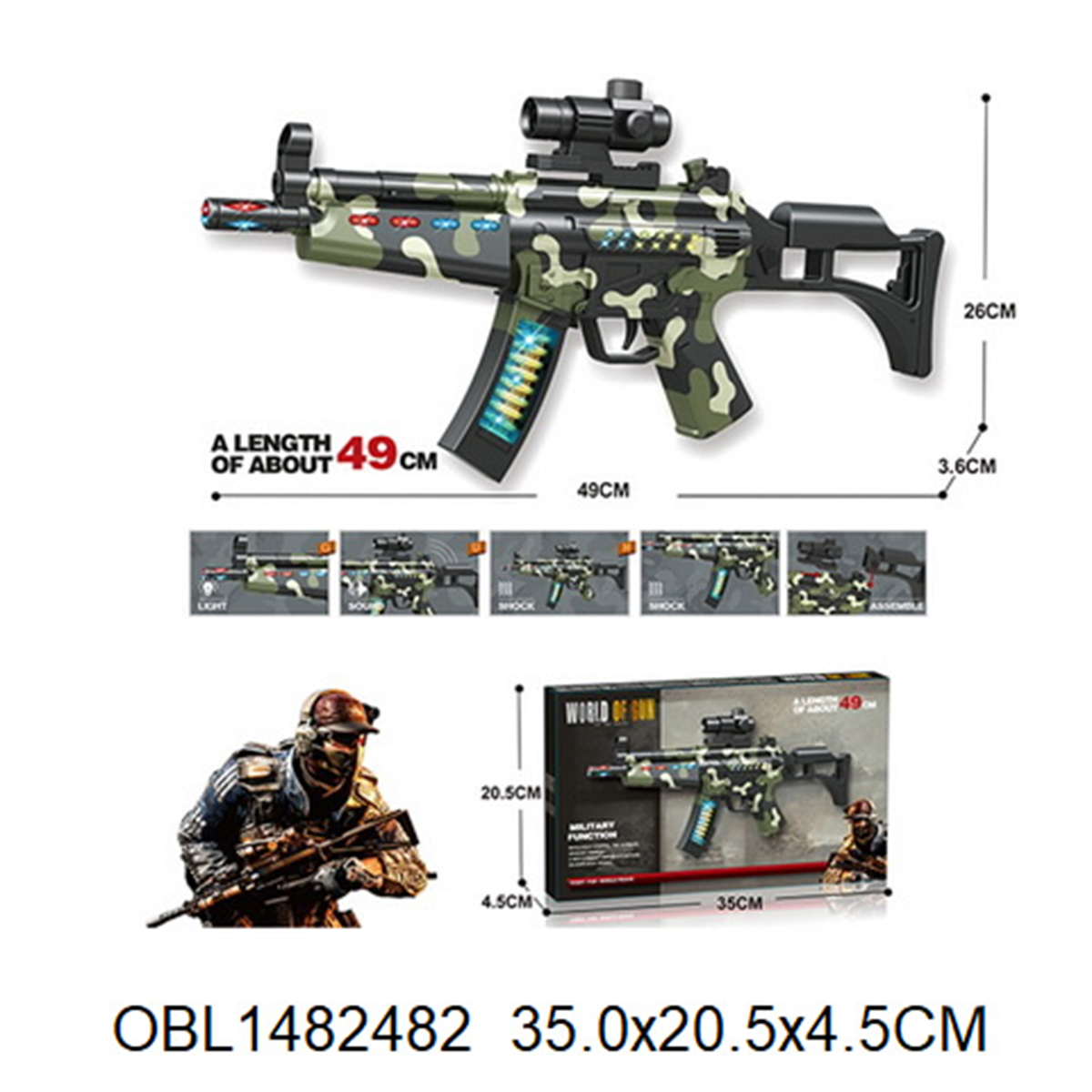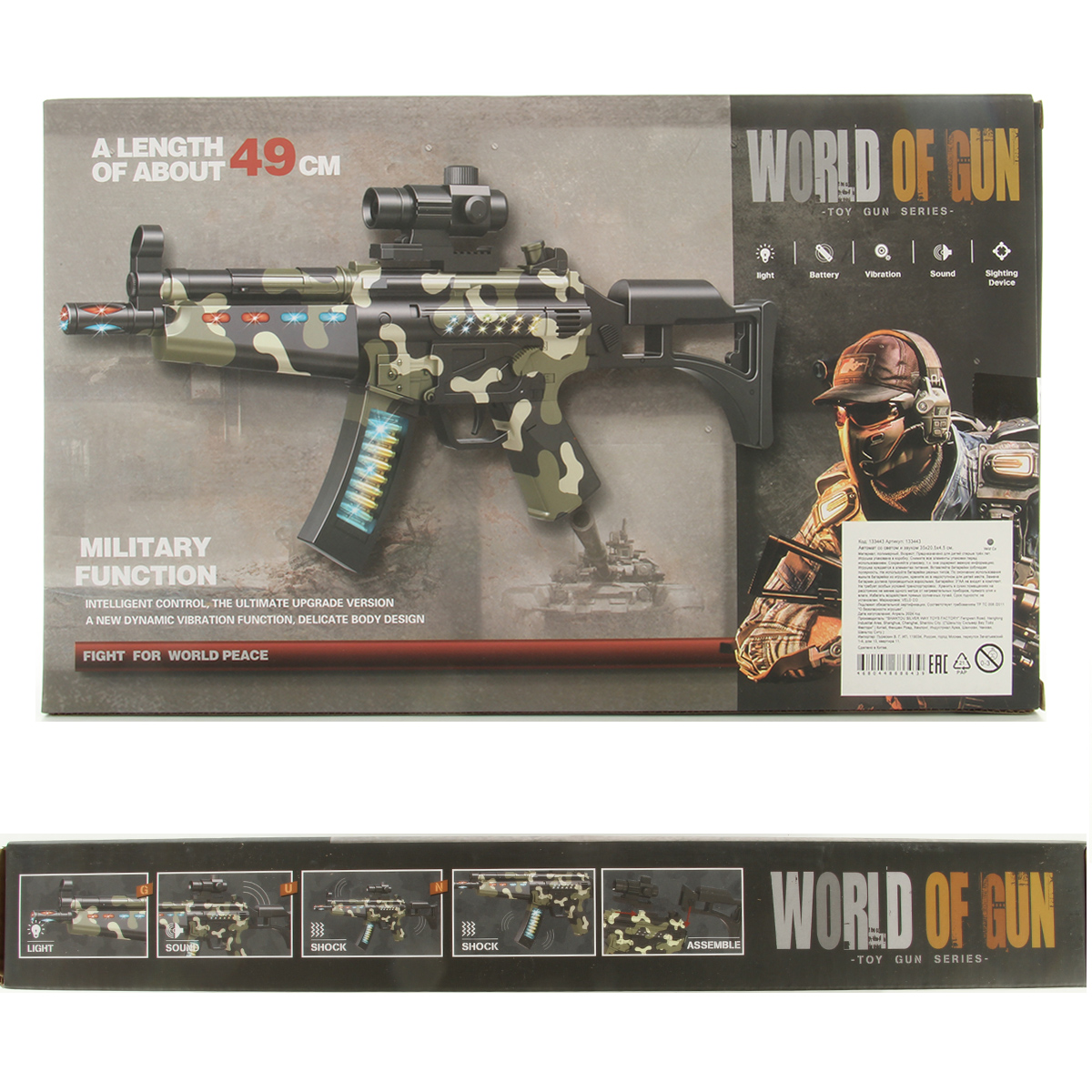 2. Подсветка магазина, ствола, дула и цевья. Цвет подсветки дула чередуется, красный и синий. Подсветка цевья частично красная, частично синяя, мигающая. Подсветка ствола и магазина синяя, мигающая.