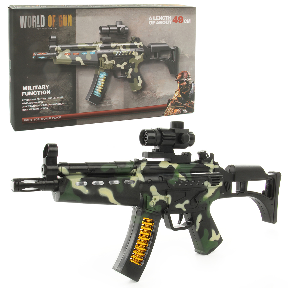 Оружие работает от 3 батареек АА, не входят в комплект.
