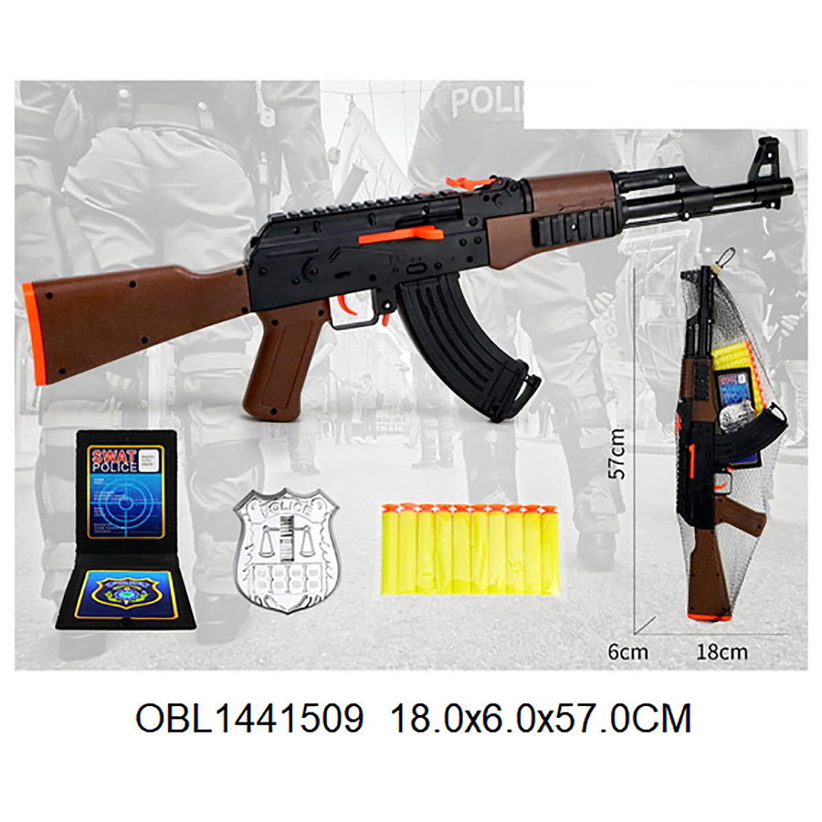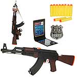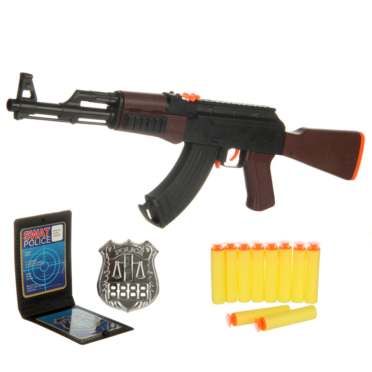 В комплекте игрушечный автомат, удостоверение, жетон, 10 мягких пуль.