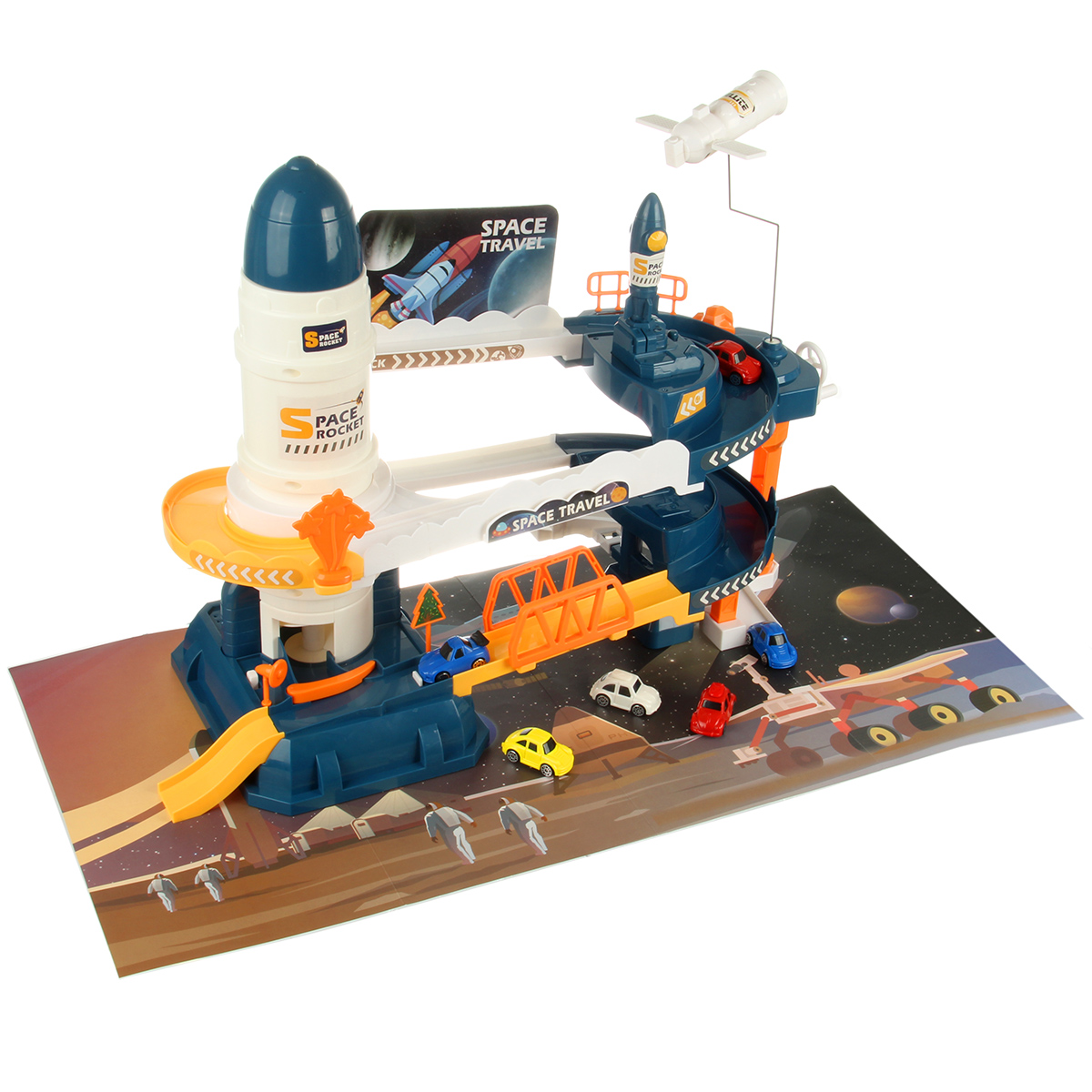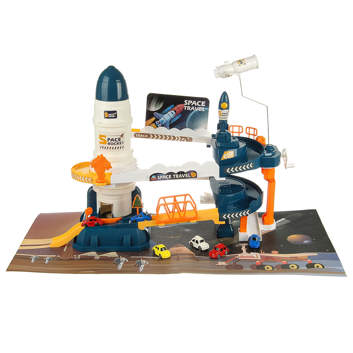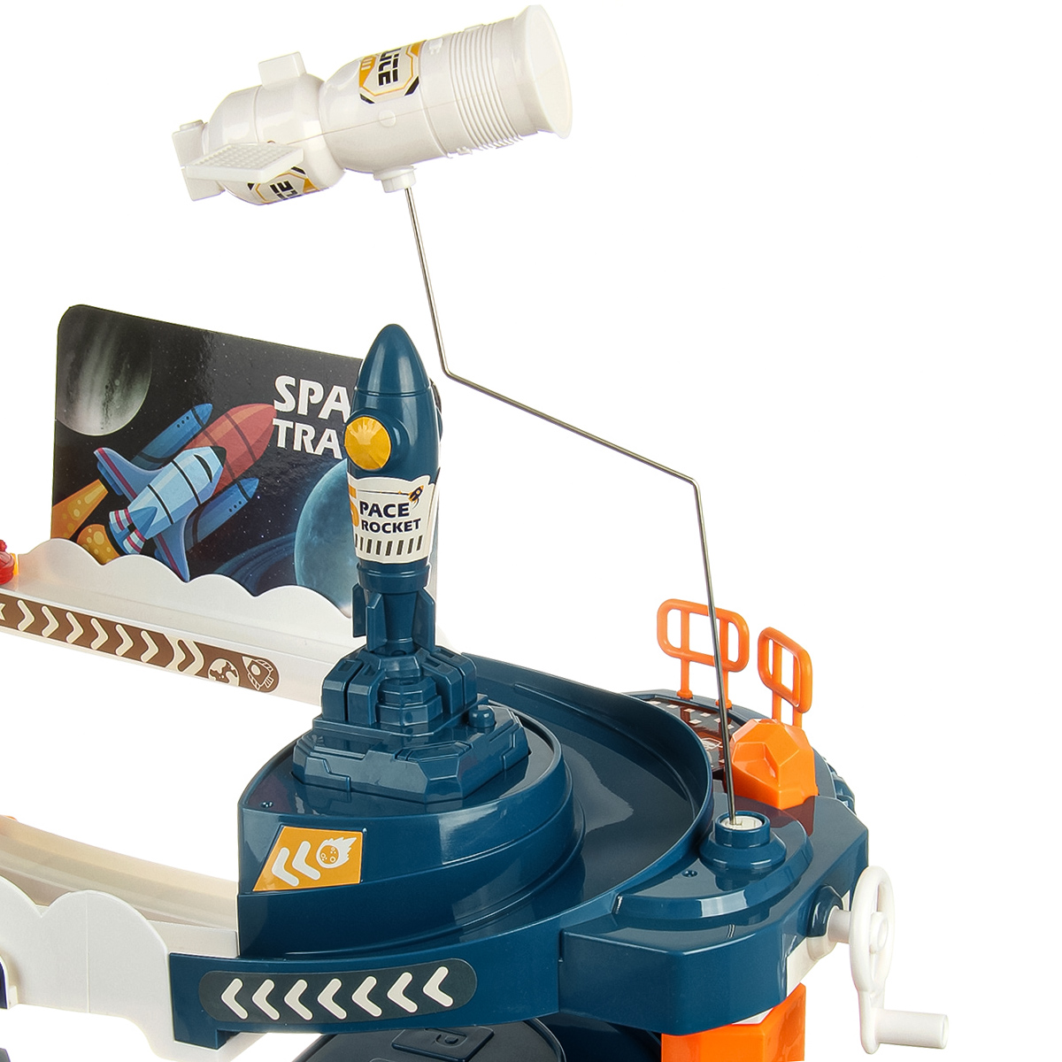 Вращающийся манипулятор с сегментом МКС, игрушка горка, машинки спускаются вниз, движение направления машинок меняется поворотом стрелки, маленькая ракета с механизмом запуска.