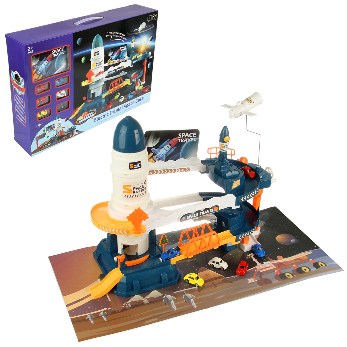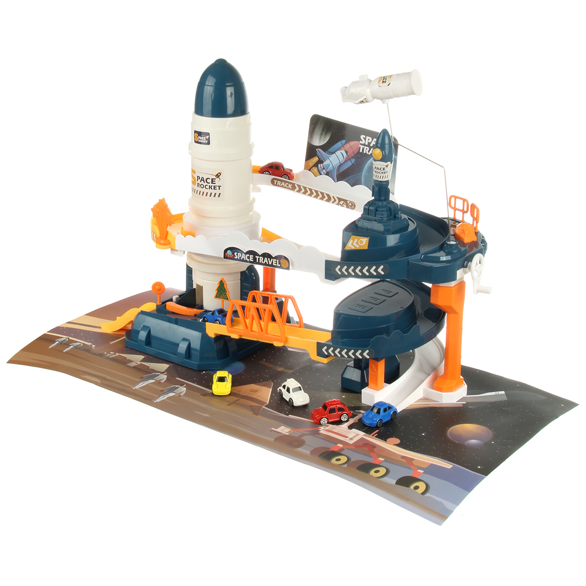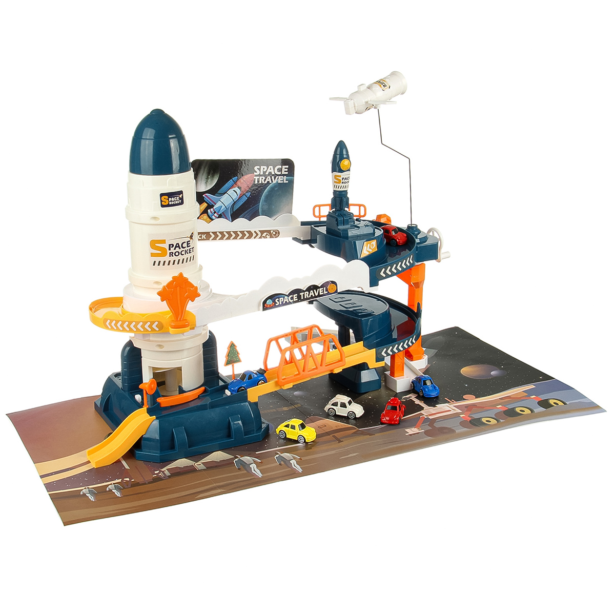 Вращающийся манипулятор с сегментом МКС, игрушка горка, машинки спускаются вниз, движение направления машинок меняется поворотом стрелки, маленькая ракета с механизмом запуска.