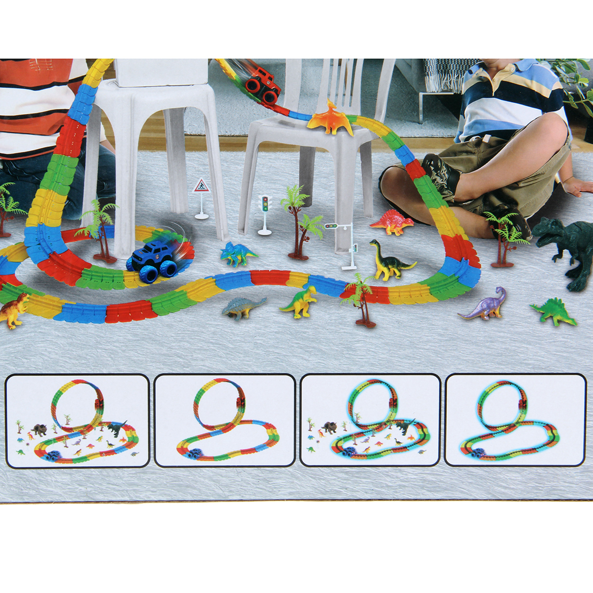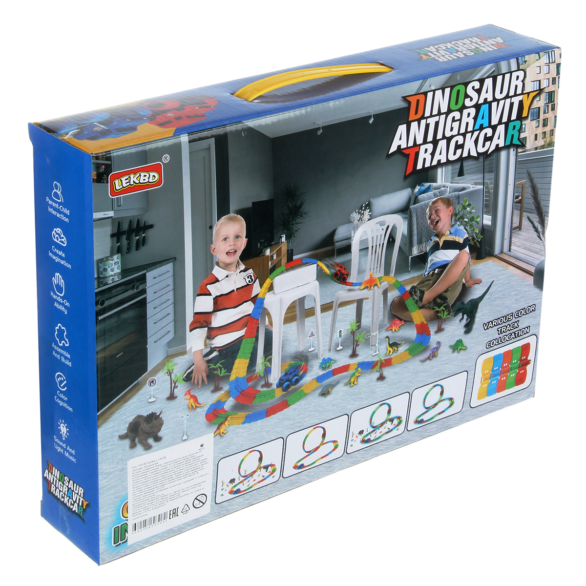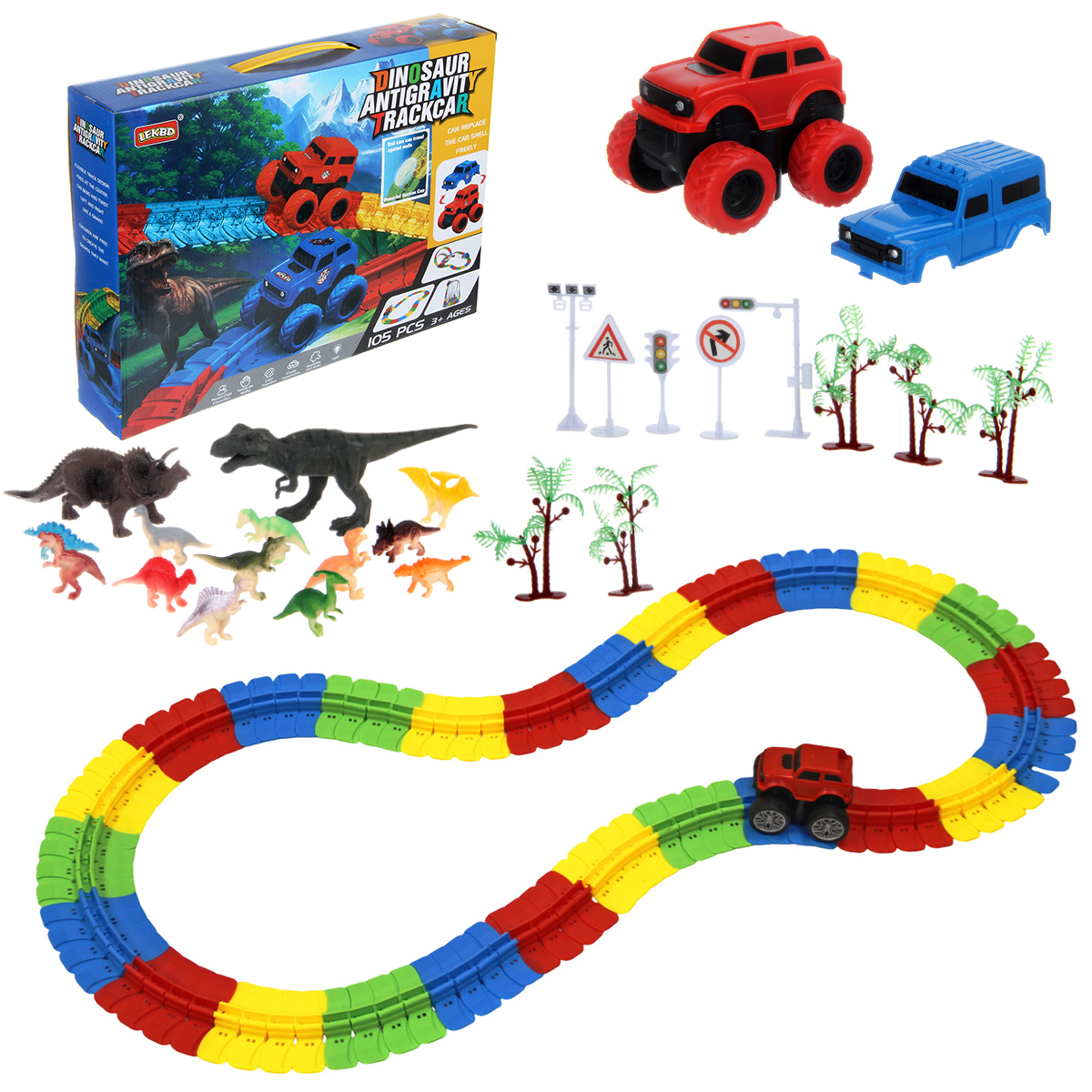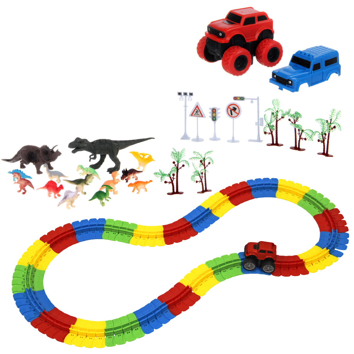 81 деталь для сборки трека, 12 фигурок динозавриков, 2 фигурки больших динозавров, 5 фигурок дорожных знаков, 5 фигурок пальм