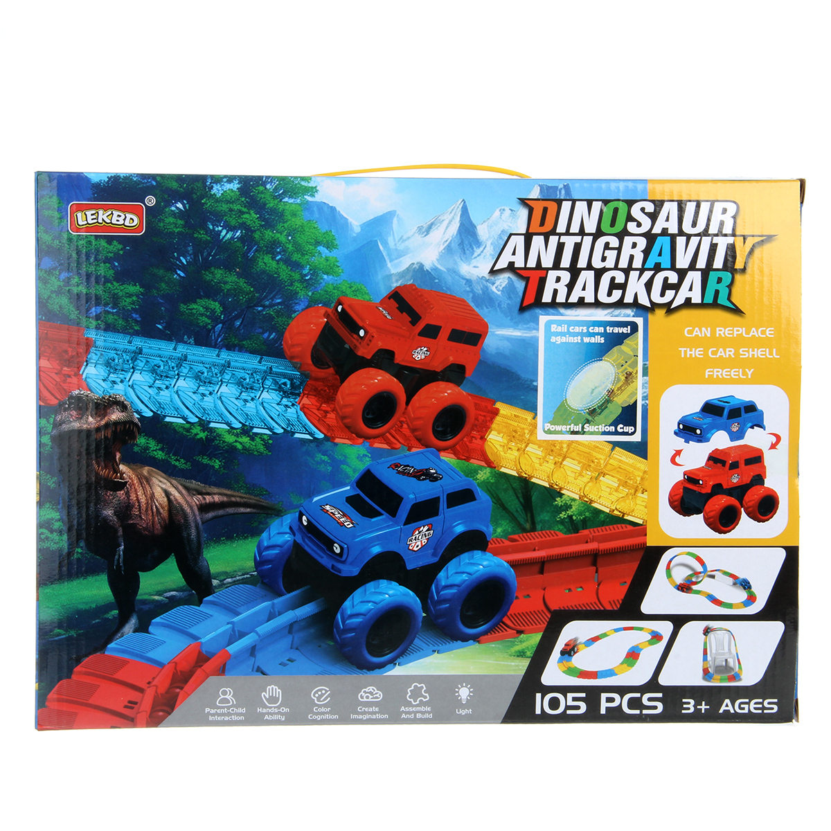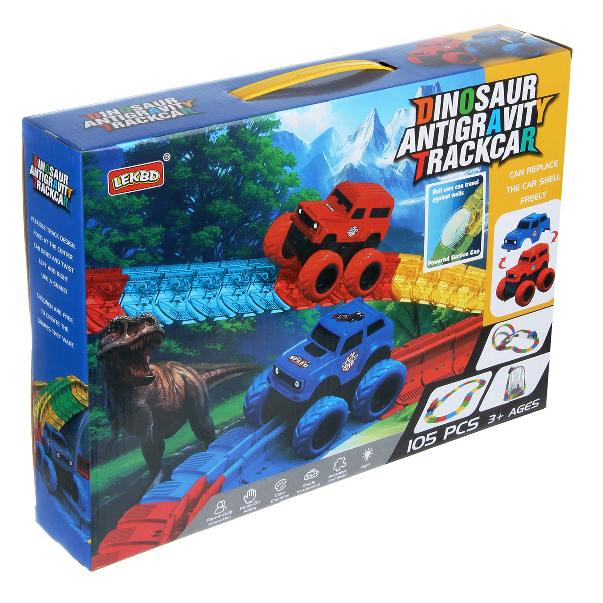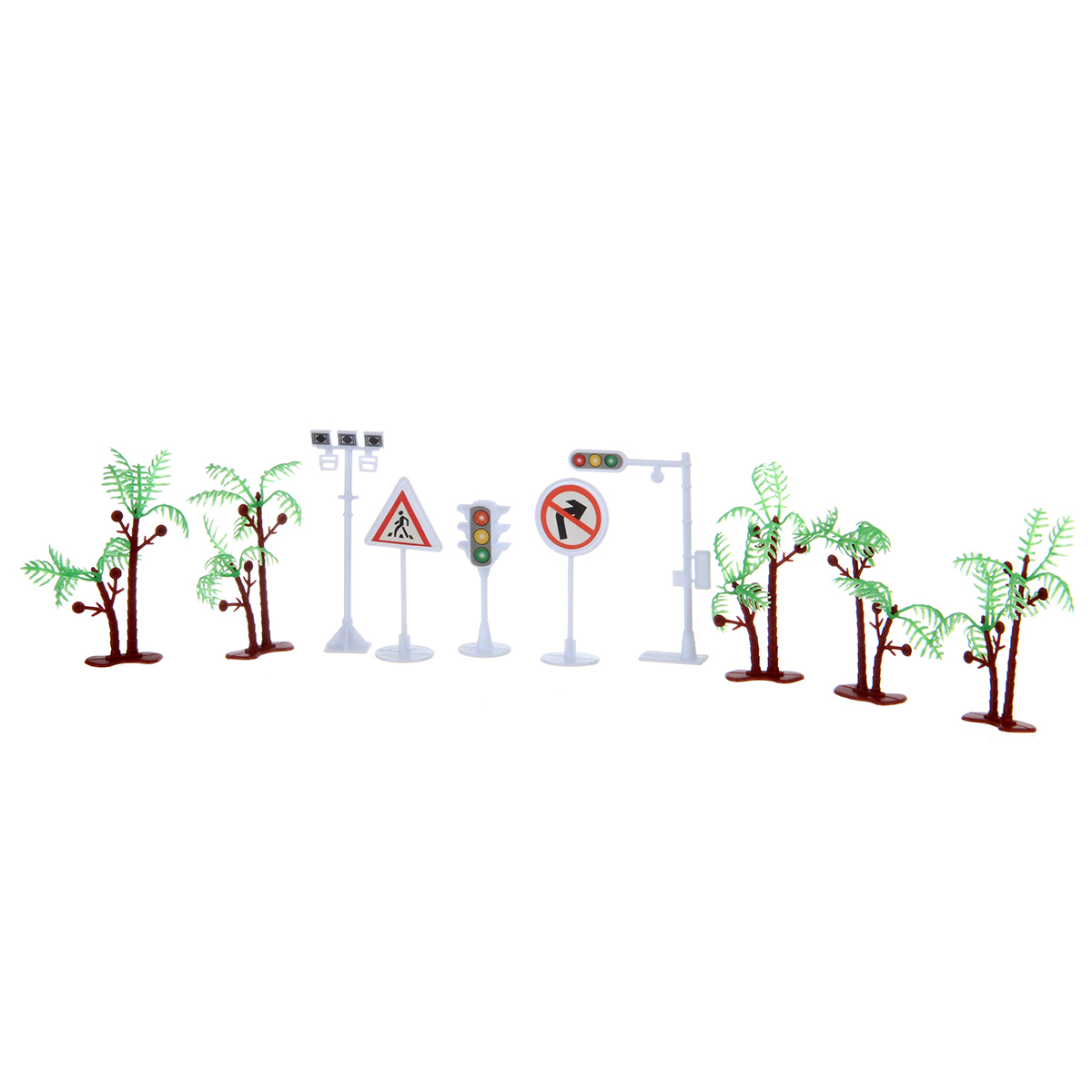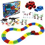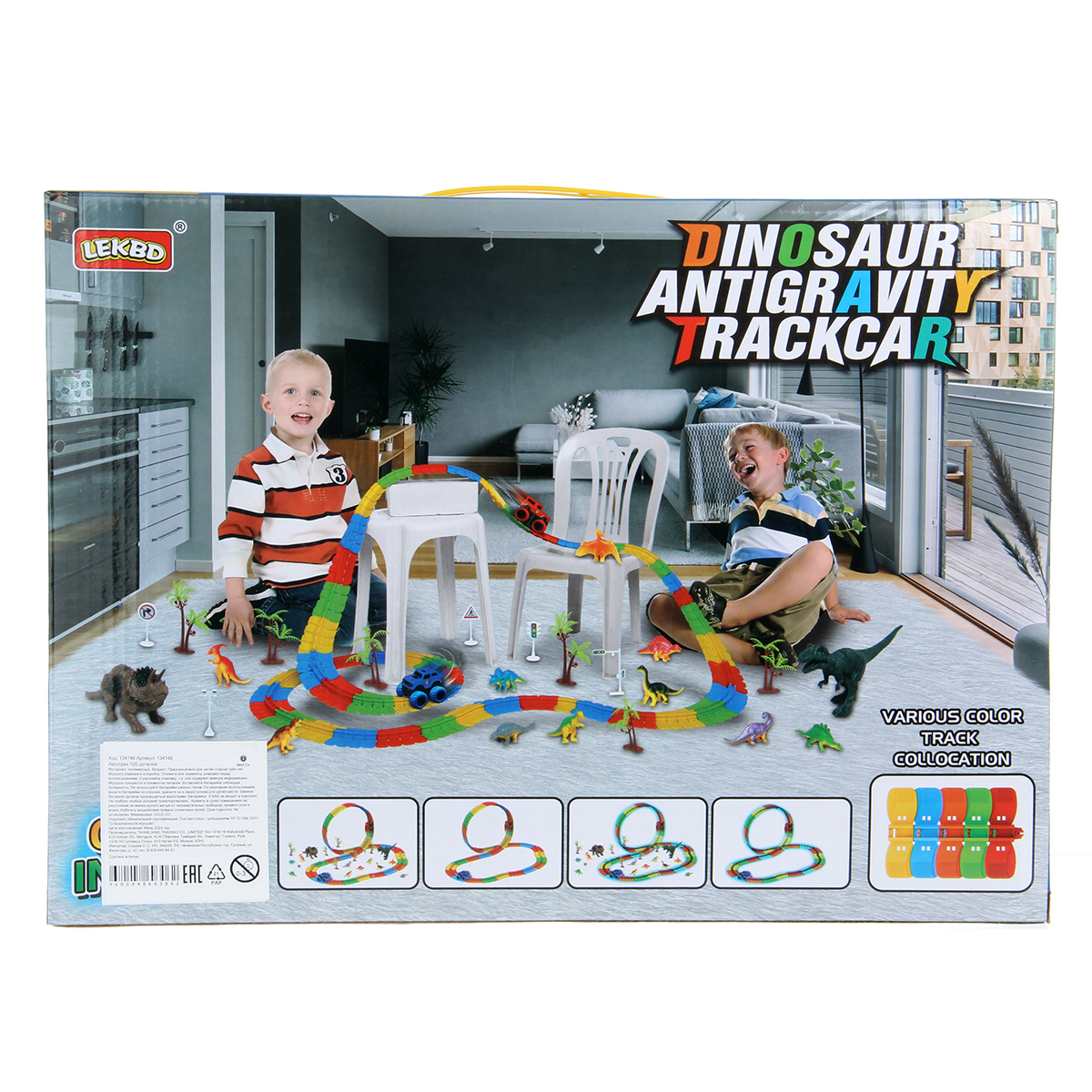 81 деталь для сборки трека, 12 фигурок динозавриков, 2 фигурки больших динозавров, 5 фигурок дорожных знаков, 5 фигурок пальм