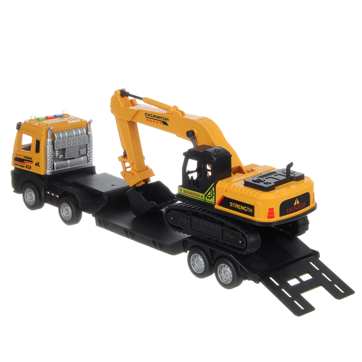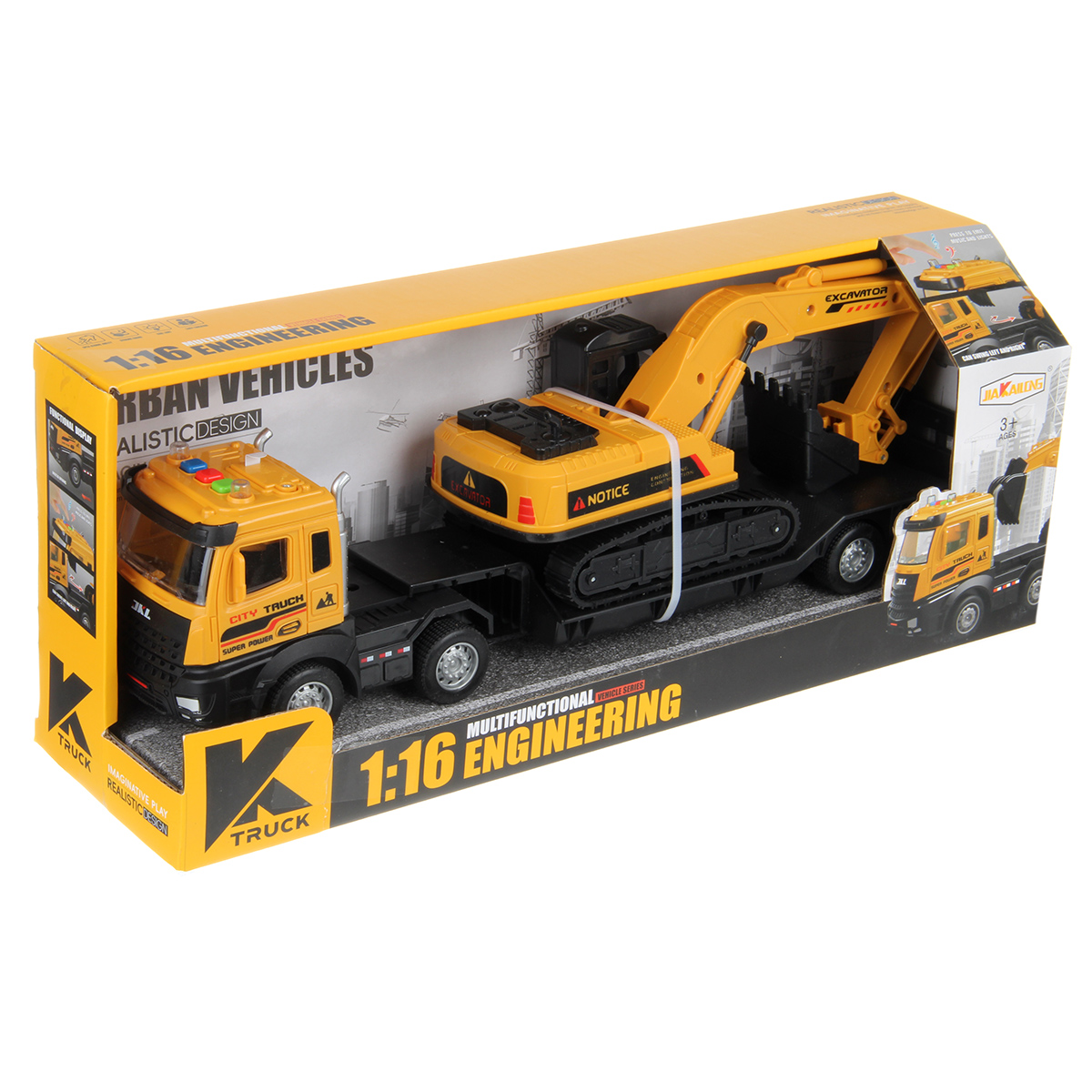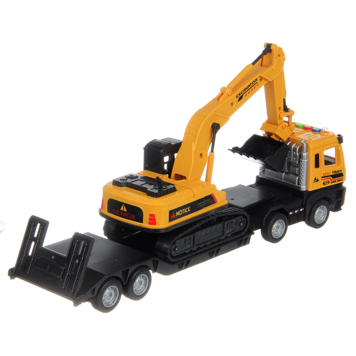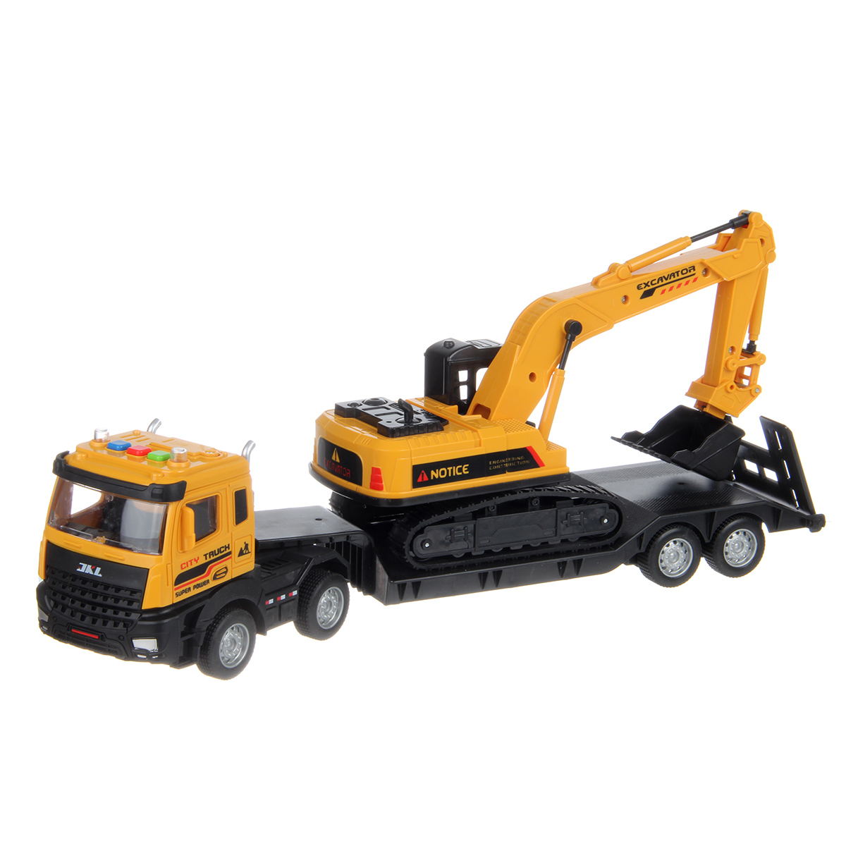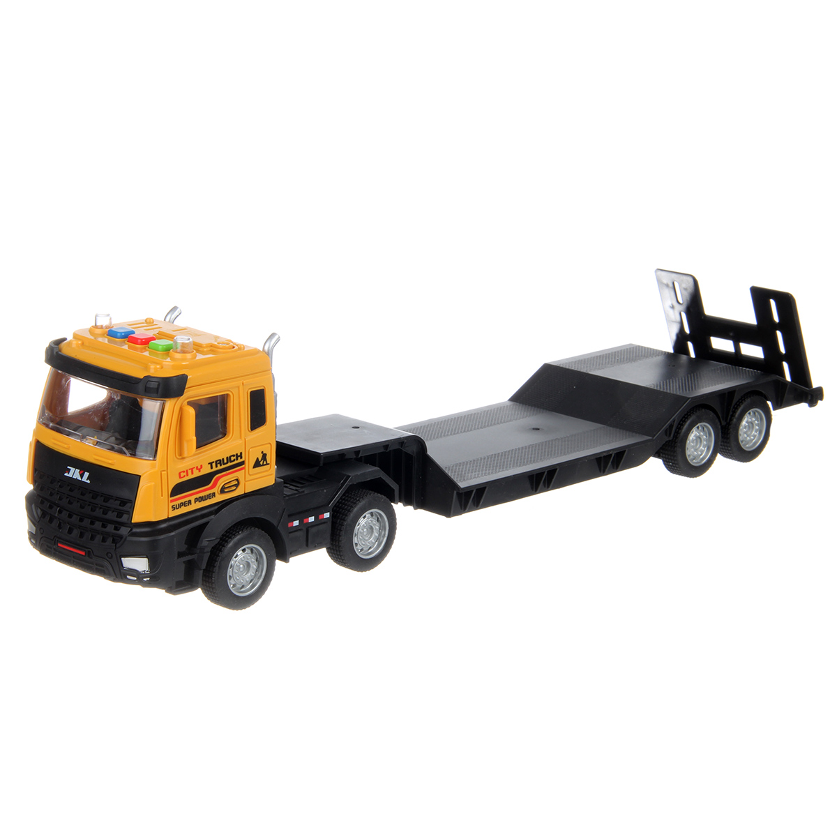 Фрикционная машинка со звуковыми эффектами, красивой подсветкой лампочек и подвижными деталями. Игрушка тягач с платформой с прорезиненными колесами, игрушечная спецтехника выполнена в реалистичном дизайне и красивой расцветке. Игрушечный транспорт изготовлен из прочных и долговечных материалов. Игрушечная машина станет замечательным подарком на Новый год и День рождения, поставляется в красивой упаковке.