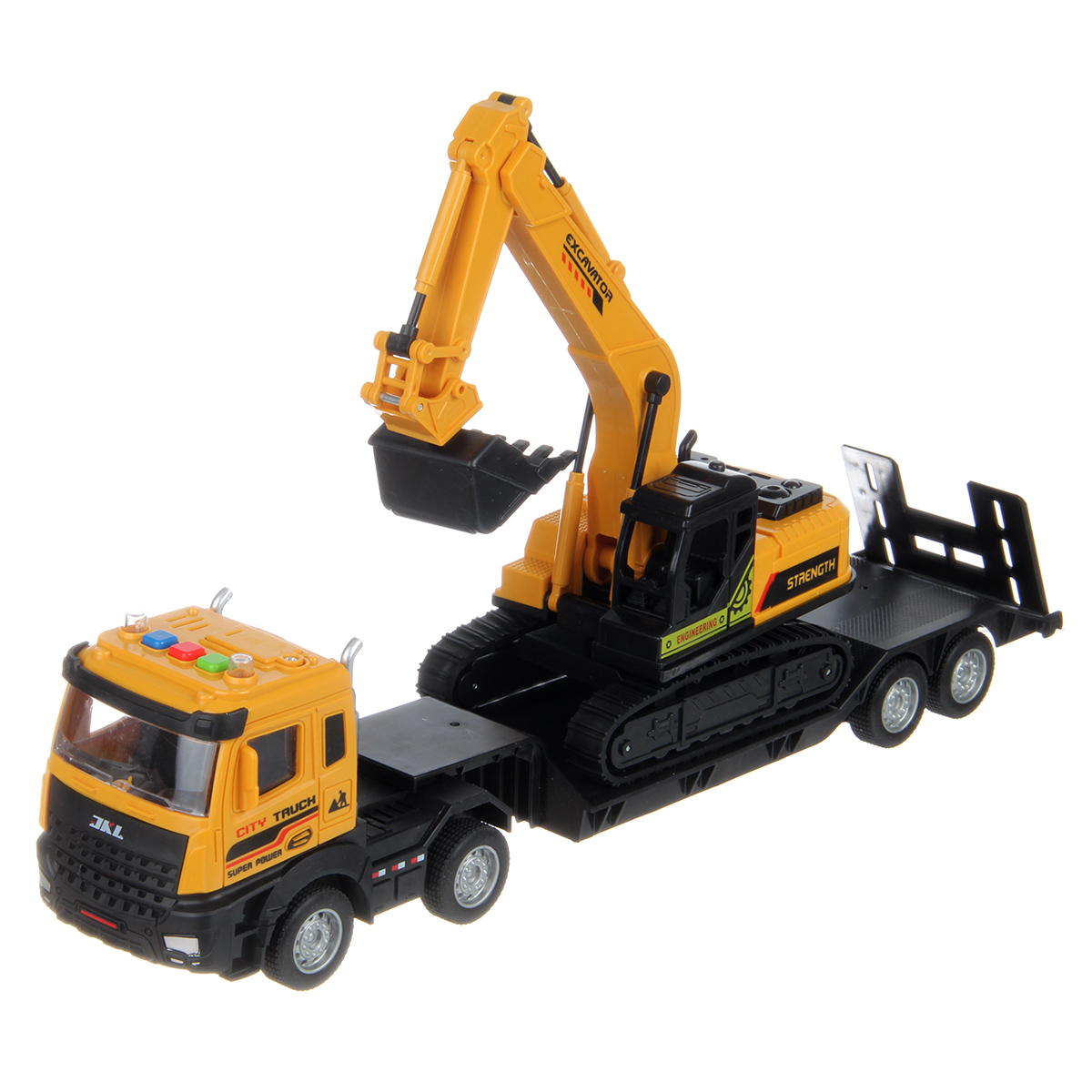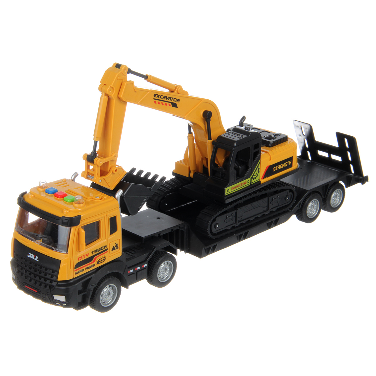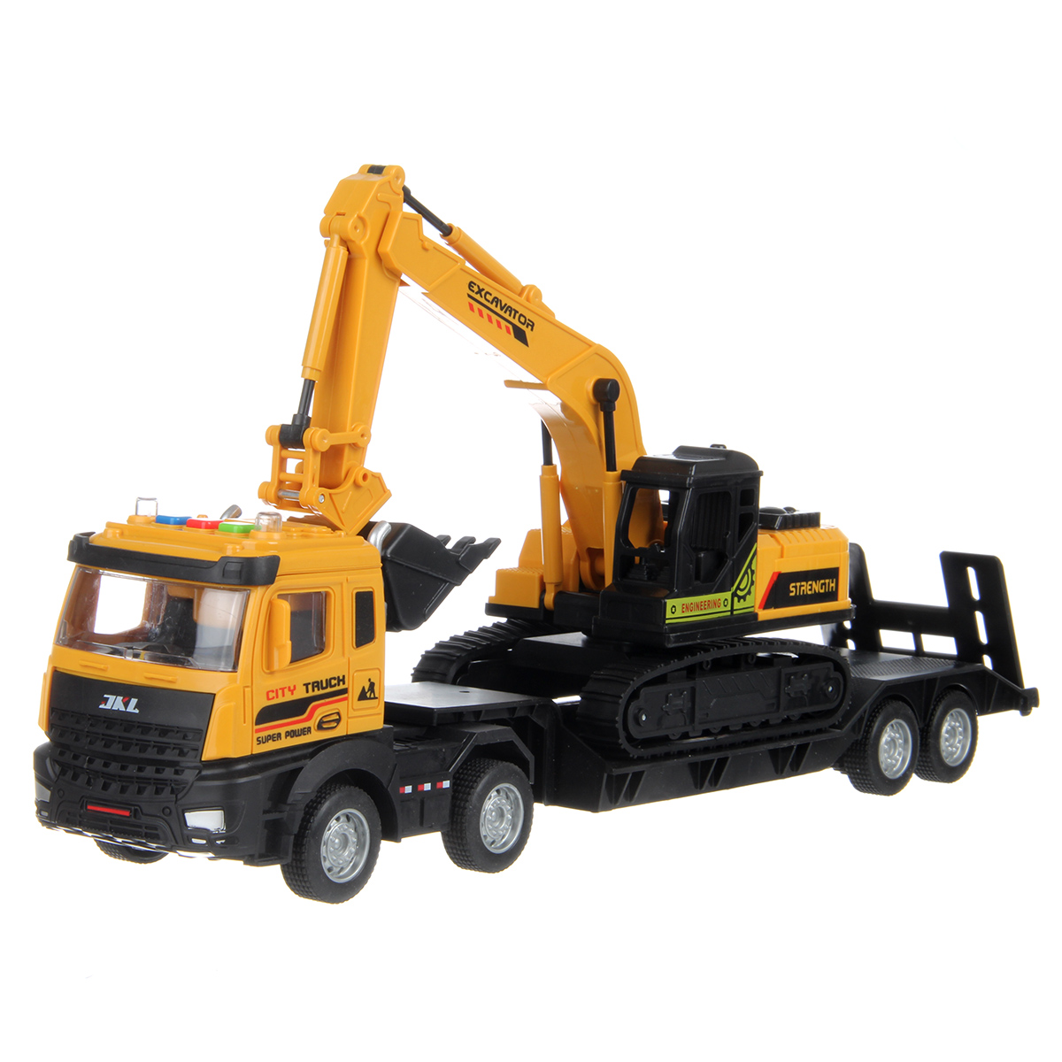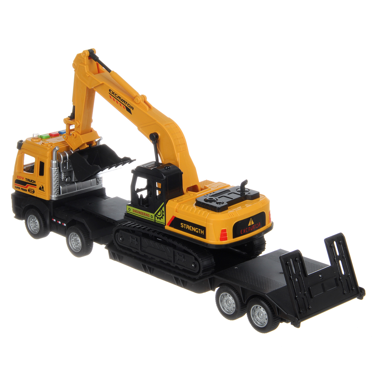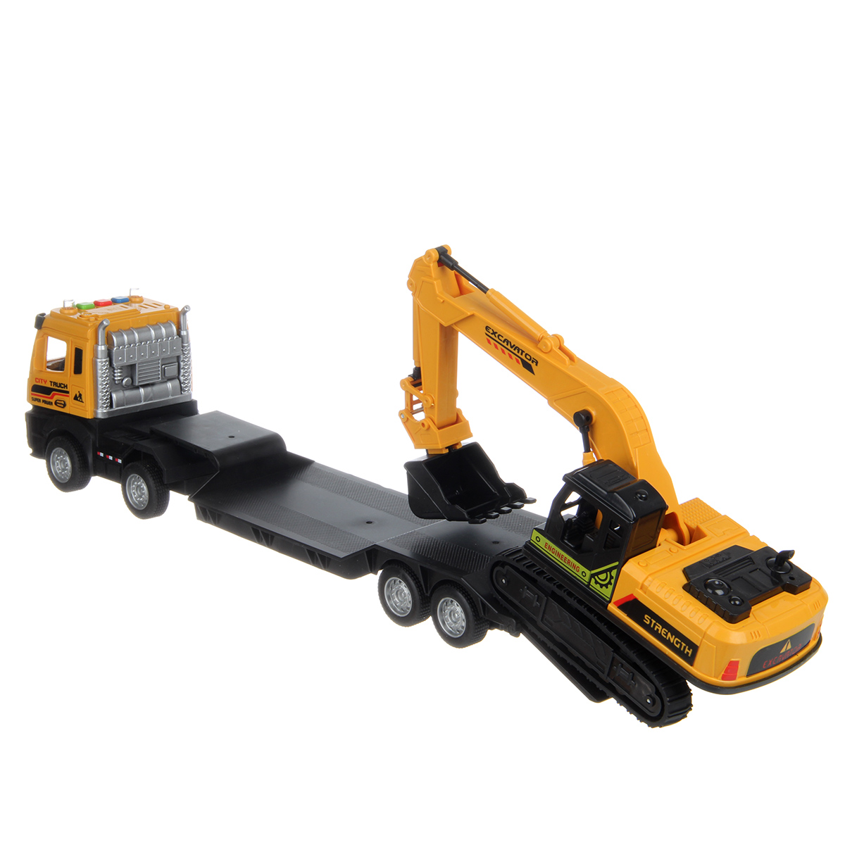 Фрикционная машинка со звуковыми эффектами, красивой подсветкой лампочек и подвижными деталями. Игрушка тягач с платформой с прорезиненными колесами, игрушечная спецтехника выполнена в реалистичном дизайне и красивой расцветке. Игрушечный транспорт изготовлен из прочных и долговечных материалов. Игрушечная машина станет замечательным подарком на Новый год и День рождения, поставляется в красивой упаковке.