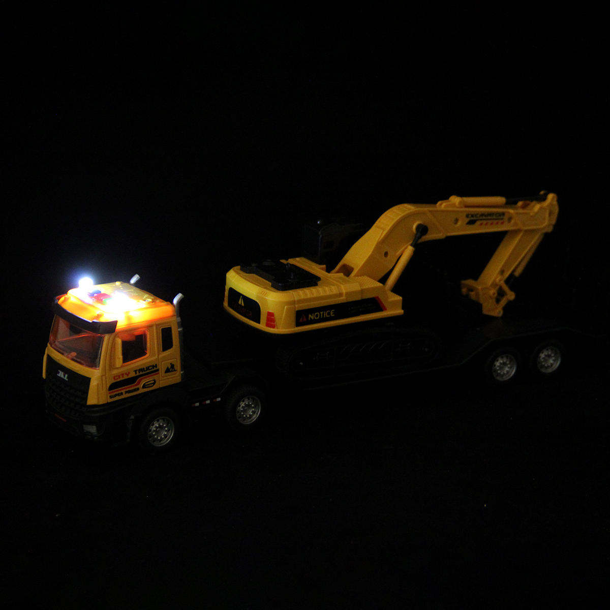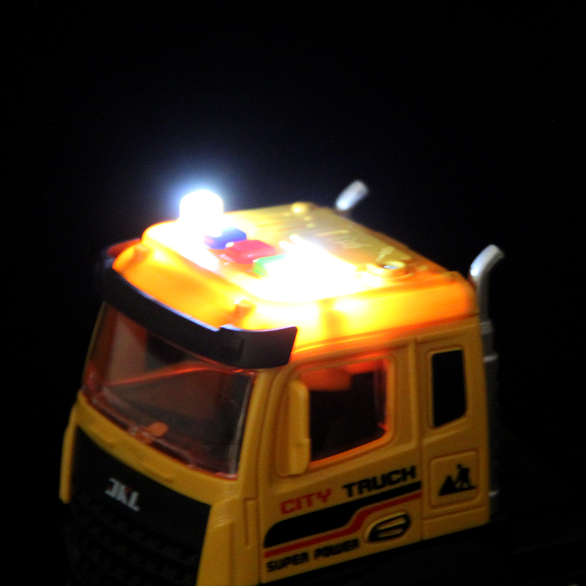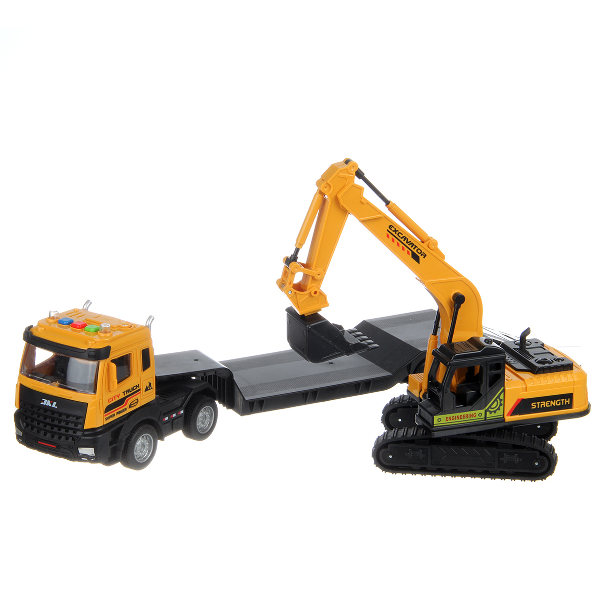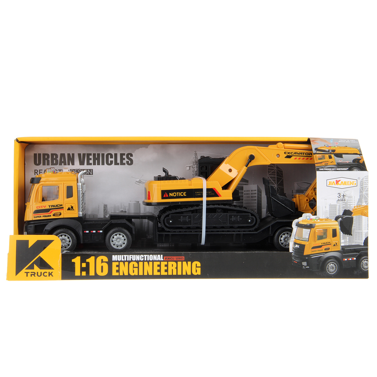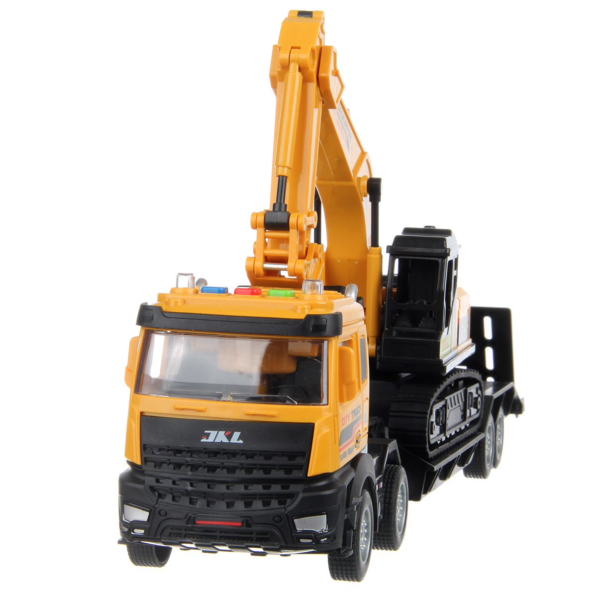 Фрикционная машинка со звуковыми эффектами, красивой подсветкой лампочек и подвижными деталями. Игрушка тягач с платформой с прорезиненными колесами, игрушечная спецтехника выполнена в реалистичном дизайне и красивой расцветке. Игрушечный транспорт изготовлен из прочных и долговечных материалов. Игрушечная машина станет замечательным подарком на Новый год и День рождения, поставляется в красивой упаковке.
