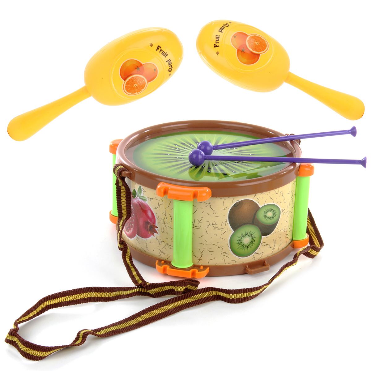 Замечательный музыкальный дуэт, состоящий из барабана с барабанными палочками и маракасов, понравится каждому юному меломану. Маракасы издают звук, если их потрясти, у барабана удобный ремешок, можно повесить барабан на плечо. Игрушка развивает артистические способности, воображение, слуховое и зрительное восприятие, координацию движений, мелкую моторику рук, знакомит с миром музыкальных инструментов. Игрушка оформлена в яркой цветовой гамме и отличается интересным дизайном. Игрушка представлена в ассортименте. Игрушка изготовлена из качественного и безопасного полимерного материала, упакована в пакет с картонным хедером. Размеры барабана: 18*18*9 см. Размеры маракаса: 15*4*5 см. Длина барабанной палочки: 15,5 см. Размеры игрушки в упаковке: 27*9*30 см.