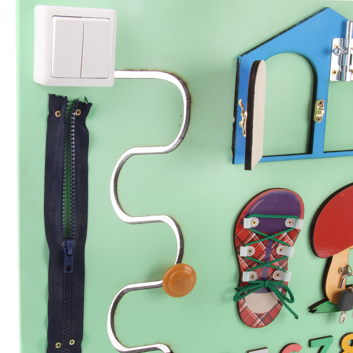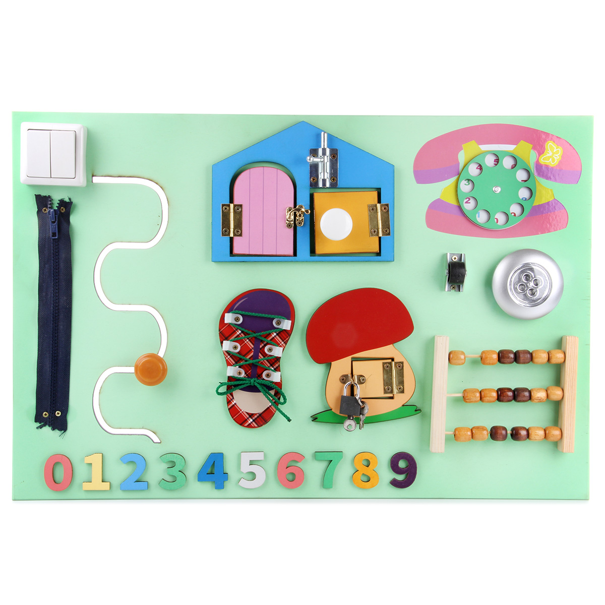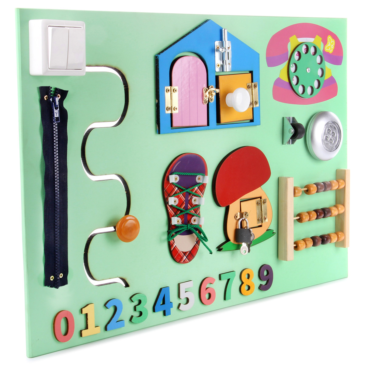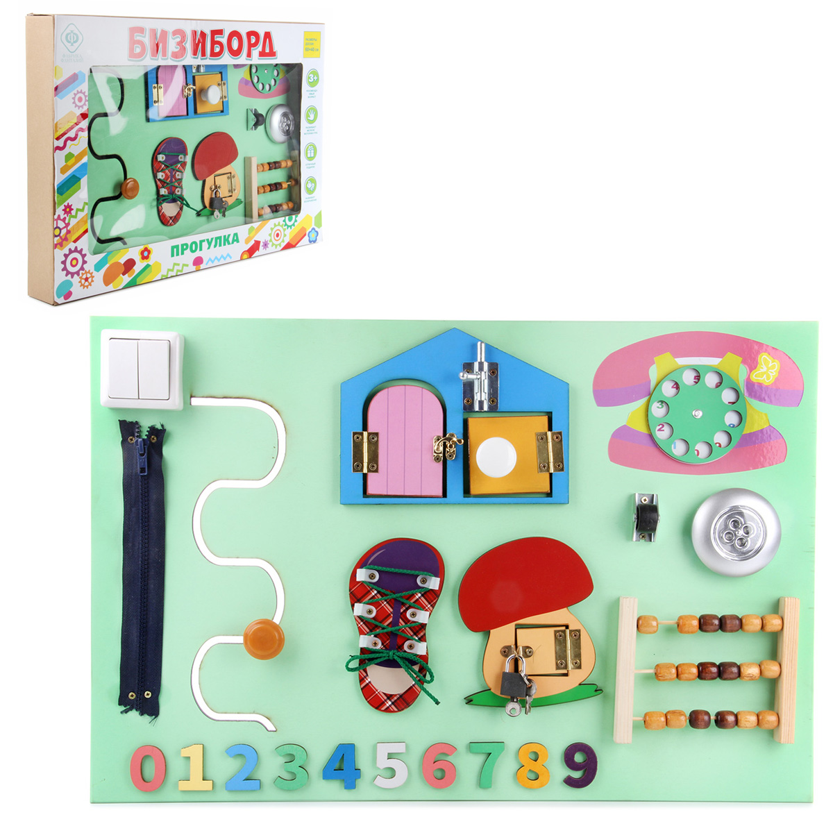 Бизиборд - незаменимая игрушка для развития ребенка. Малыш с ранних лет начинает активно изучать окружающий мир, щупать предметы и пробовать их на вкус. Маленький исследователь будет с увлечением взаимодействовать с большим количеством разнообразных элементов, расположенных на бизиборде, выяснять, как они работают и для чего нужны, попутно развивая полезные навыки и умения. В комплект входят бизиборд и 3 батарейки ААА. Батарейки вставляются в круглый выключатель света. На щите расположены: - кнопка круглого выключателя (светит во включенном состоянии); - дисконабиратель (вращается); - элемент с колесиком (колесико крутится); - счеты (передвигаются костяшки); - элемент в виде грибочка с замочком (замочек открывается, дверка открывается, оба ключика подходят к замку); - элемент в виде домика (открываются и закрываются шпингалеты, дверки открываются); - кроссовок со шнурочком (шнурок вынимается); - вырезанная змейкой дорожка с ручкой (ручка перемещается по дорожке); - цифры (выпуклые, можно щупать); - молния (з