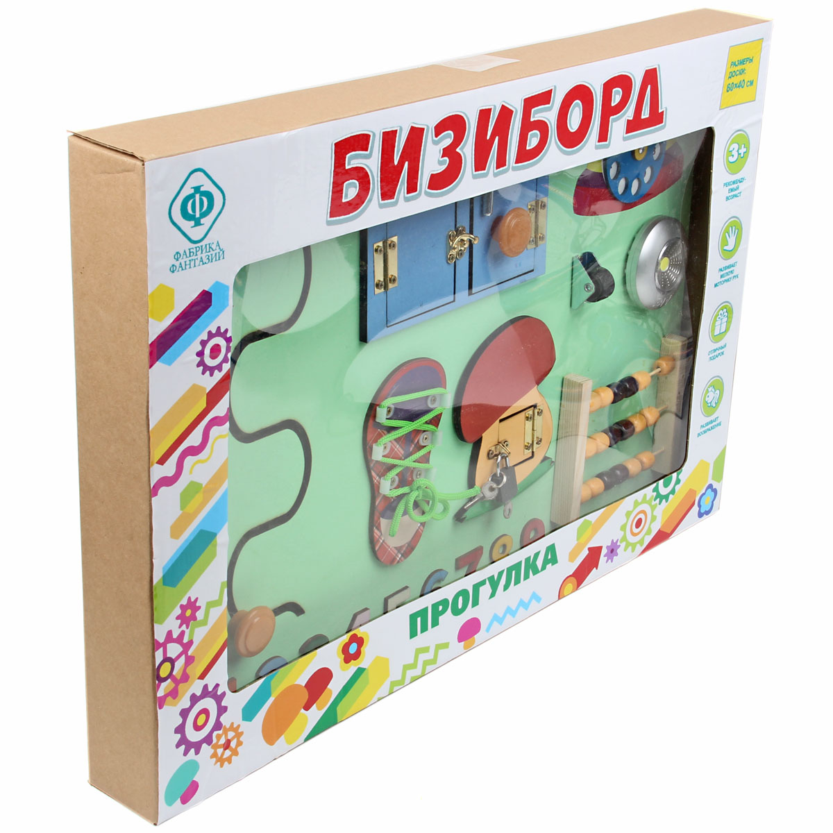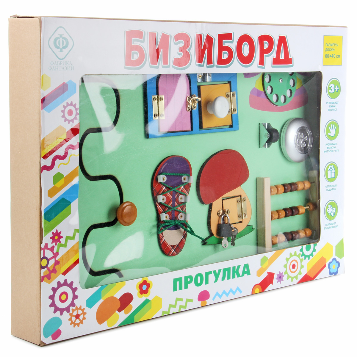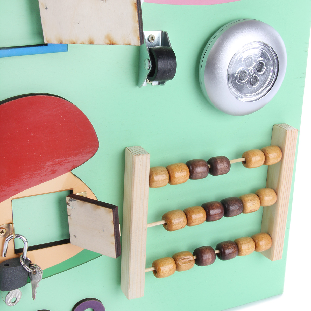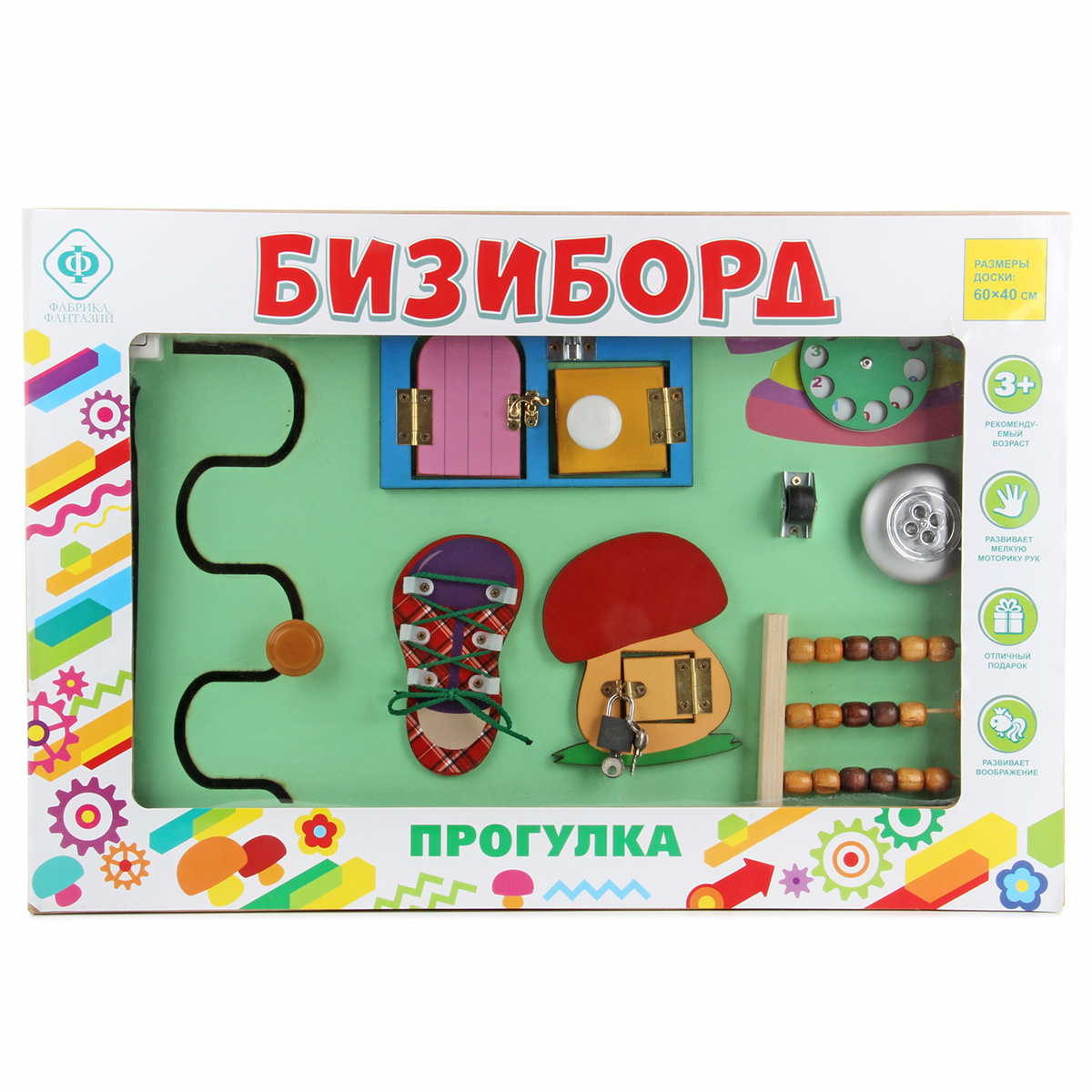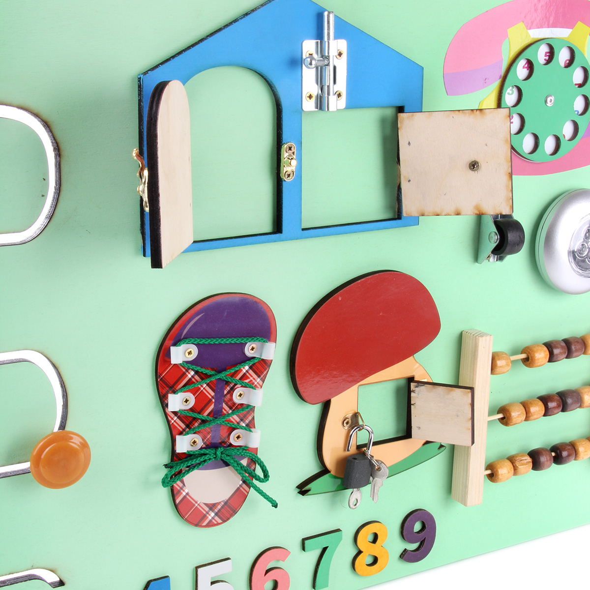 Бизиборд - незаменимая игрушка для развития ребенка. Малыш с ранних лет начинает активно изучать окружающий мир, щупать предметы и пробовать их на вкус. Маленький исследователь будет с увлечением взаимодействовать с большим количеством разнообразных элементов, расположенных на бизиборде, выяснять, как они работают и для чего нужны, попутно развивая полезные навыки и умения. В комплект входят бизиборд и 3 батарейки ААА. Батарейки вставляются в круглый выключатель света. На щите расположены: - кнопка круглого выключателя (светит во включенном состоянии); - дисконабиратель (вращается); - элемент с колесиком (колесико крутится); - счеты (передвигаются костяшки); - элемент в виде грибочка с замочком (замочек открывается, дверка открывается, оба ключика подходят к замку); - элемент в виде домика (открываются и закрываются шпингалеты, дверки открываются); - кроссовок со шнурочком (шнурок вынимается); - вырезанная змейкой дорожка с ручкой (ручка перемещается по дорожке); - цифры (выпуклые, можно щупать); - молния (з