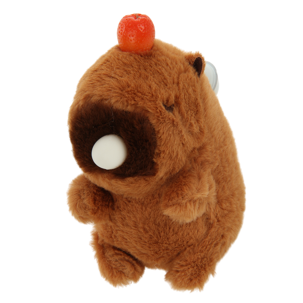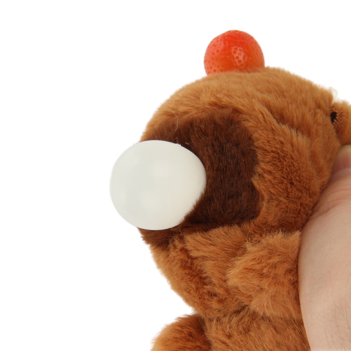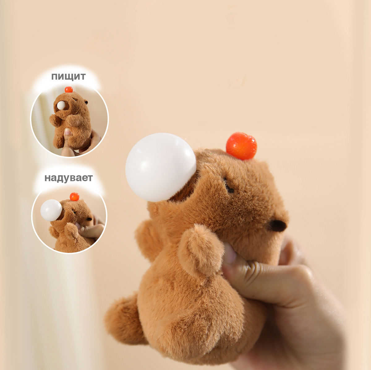 При нажатии на брюшко белый шарик в области ротика надувается, игрушка издает писк.