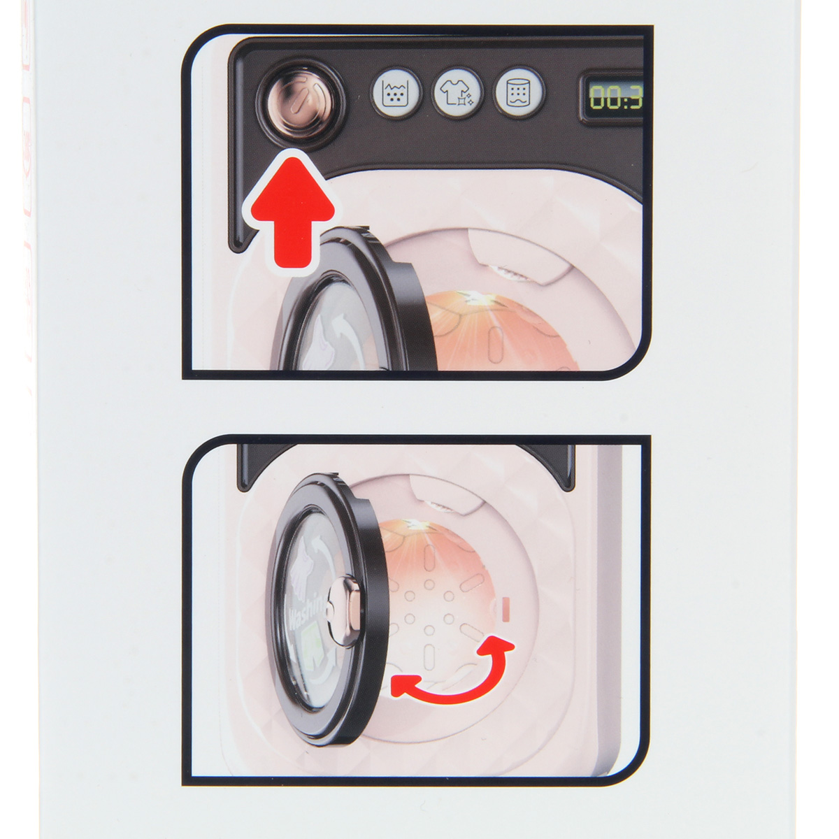 Включение кнопка пуска. Машинка издает звук работающей техники, подсветка лампочки красным и синим в барабане, крутится имитация стекла дверцы барабана, дверца барабана открывается. Кнопки с изображениями декоративные.