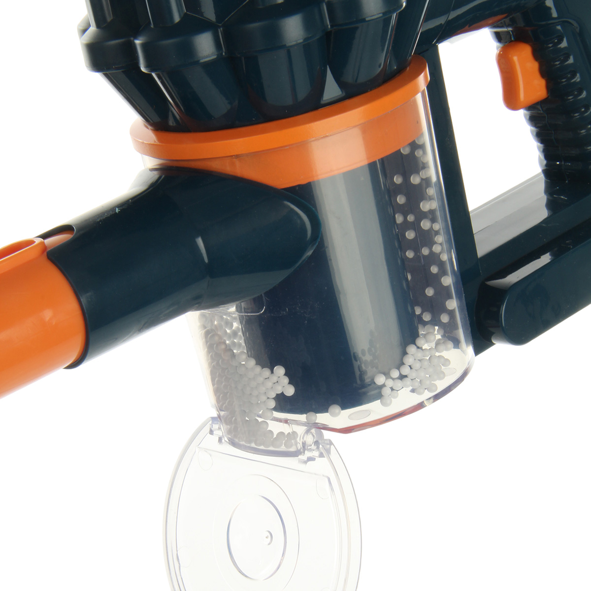 2. При нажатии кнопки на ручке издает звук работающей техники, собирает мусор, шарики в отсеке перемещаются. Работает, пока держим кнопку на ручке, отпустили кнопку, перестал работать. Крышка отсека с мусором открывается, можно вытряхнуть мусор и играть снова.