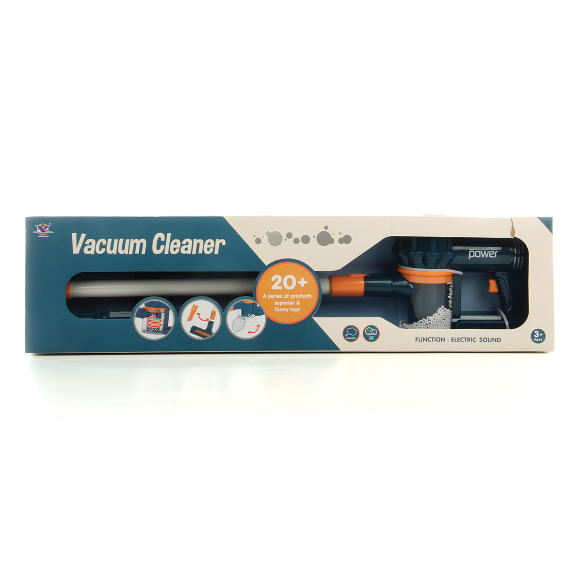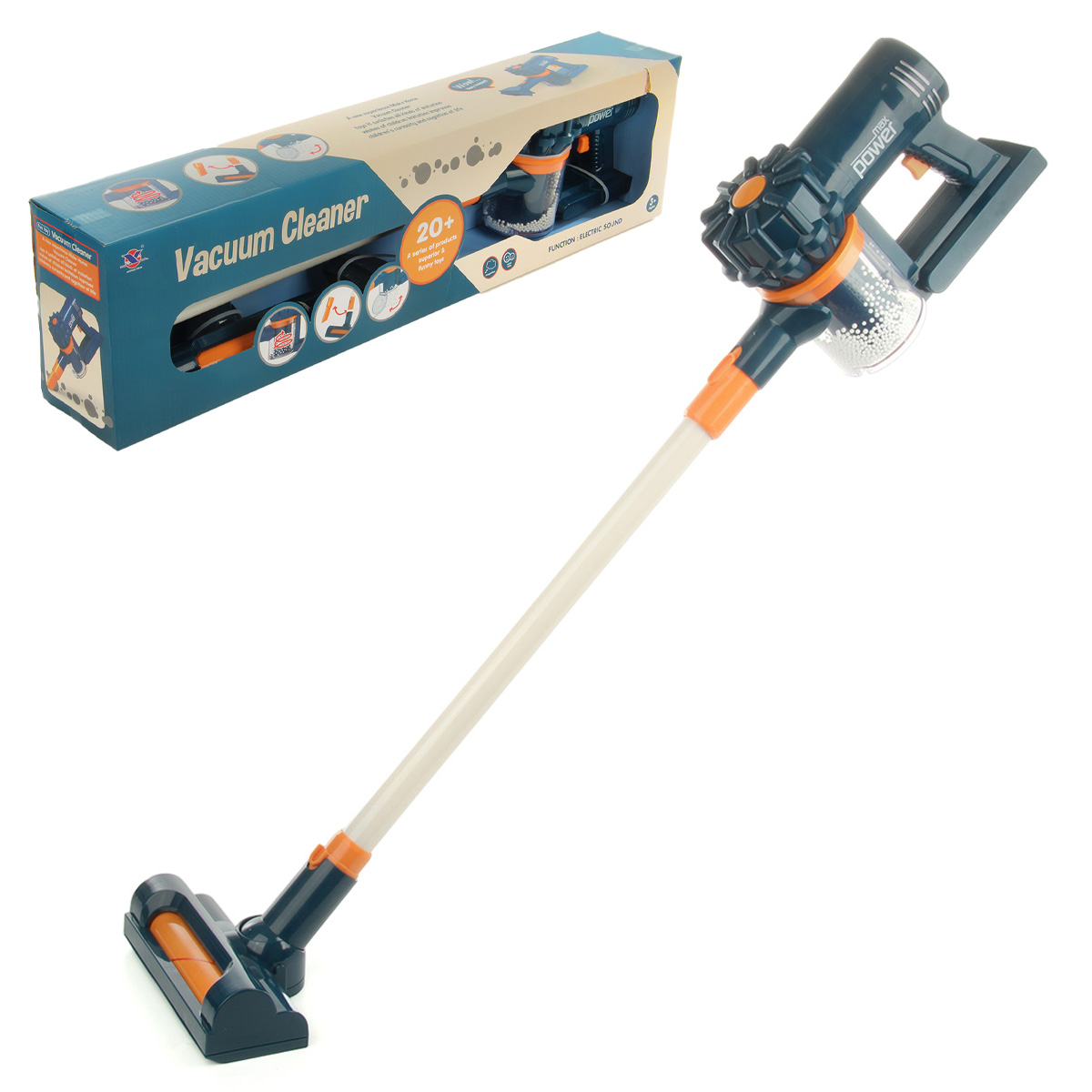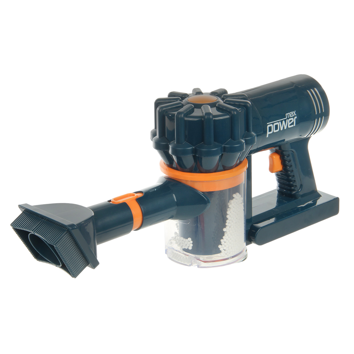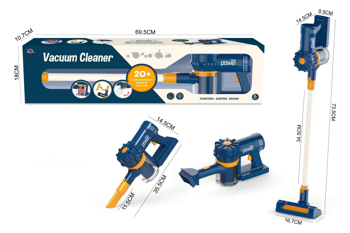 Игрушечный пылесос имеет открывающийся отсек для мусора, высыпали мусор и играем снова. Удобная для хвата ручка инвентаря, сменные насадки.