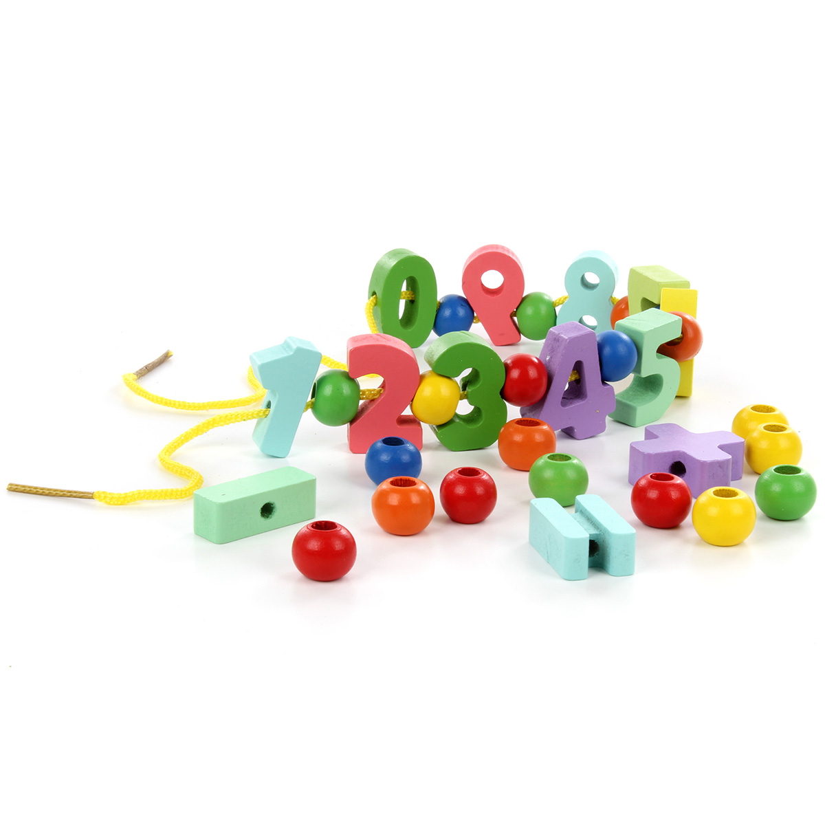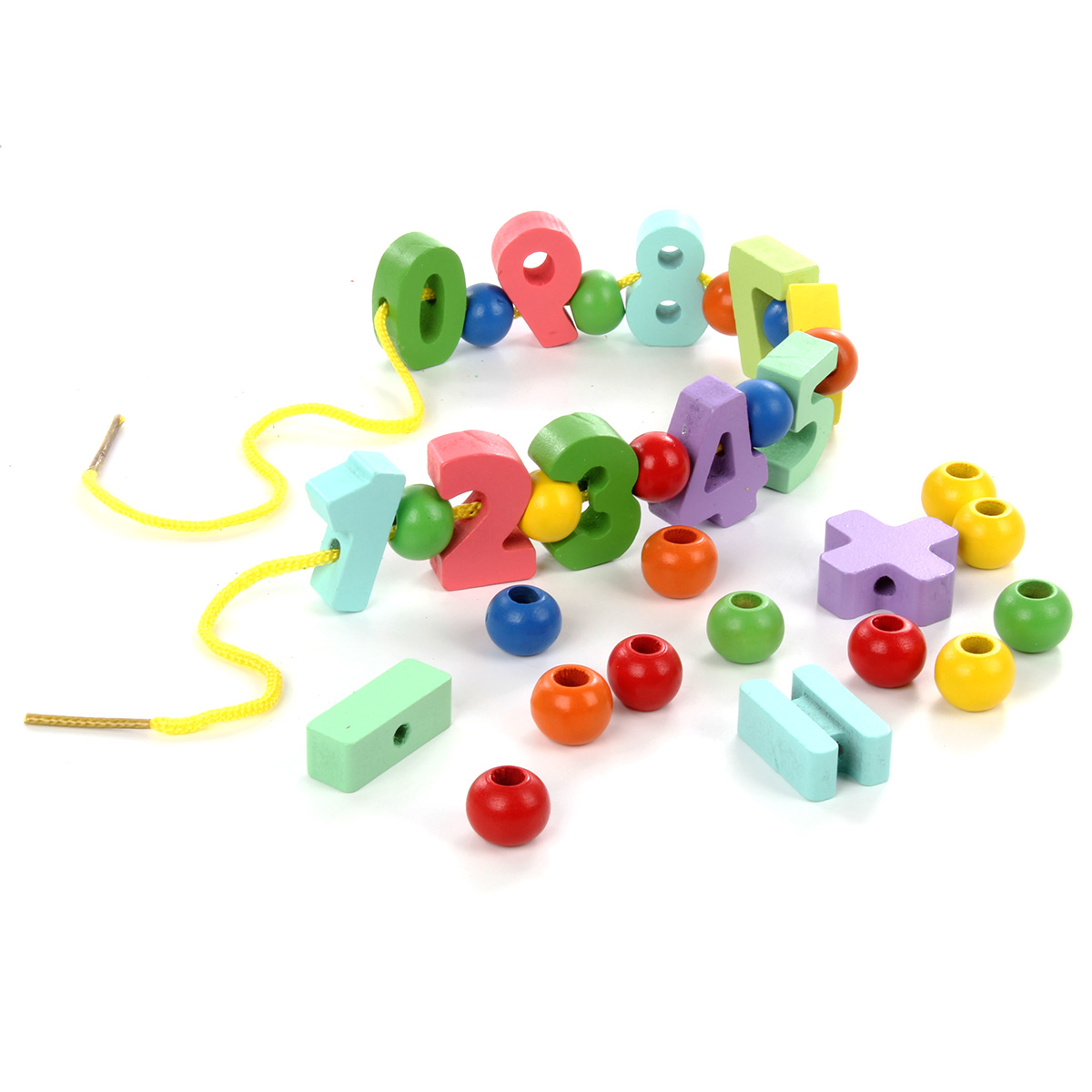 У всех фигурок есть отверстия, их можно нанизать на шнурок в любой последовательности. Можно собрать ожерелье из бусинок, цифр или всех деталей одновременно.