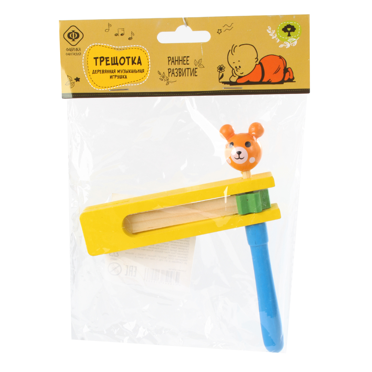 Трещотка - забавный музыкальный инструмент для создания ритмических шумов, либо заменяющий хлопки в ладоши. Станет отличным средством для развлечения малыша и развития у него творческих способностей. Игрушка изготовлена из экологически чистой древесины, окрашена безопасными красками. Упакована в пакет с картонным хедером с отверстием. Размер игрушки: 17*13*2 см. Размер игрушки в упаковке: 23*16*2 см.