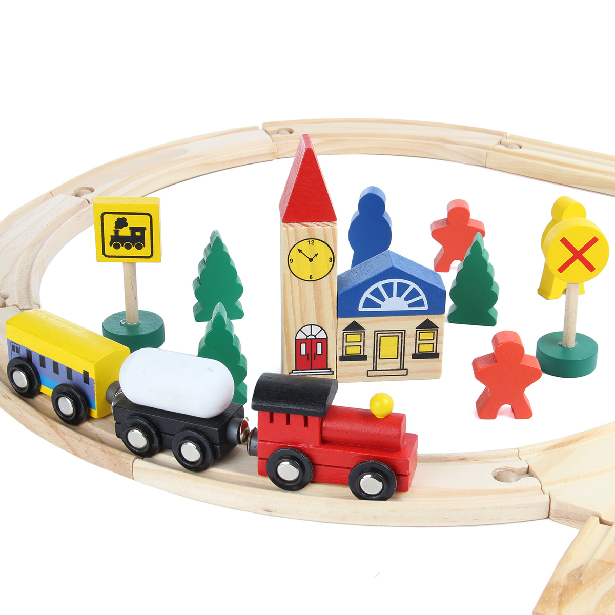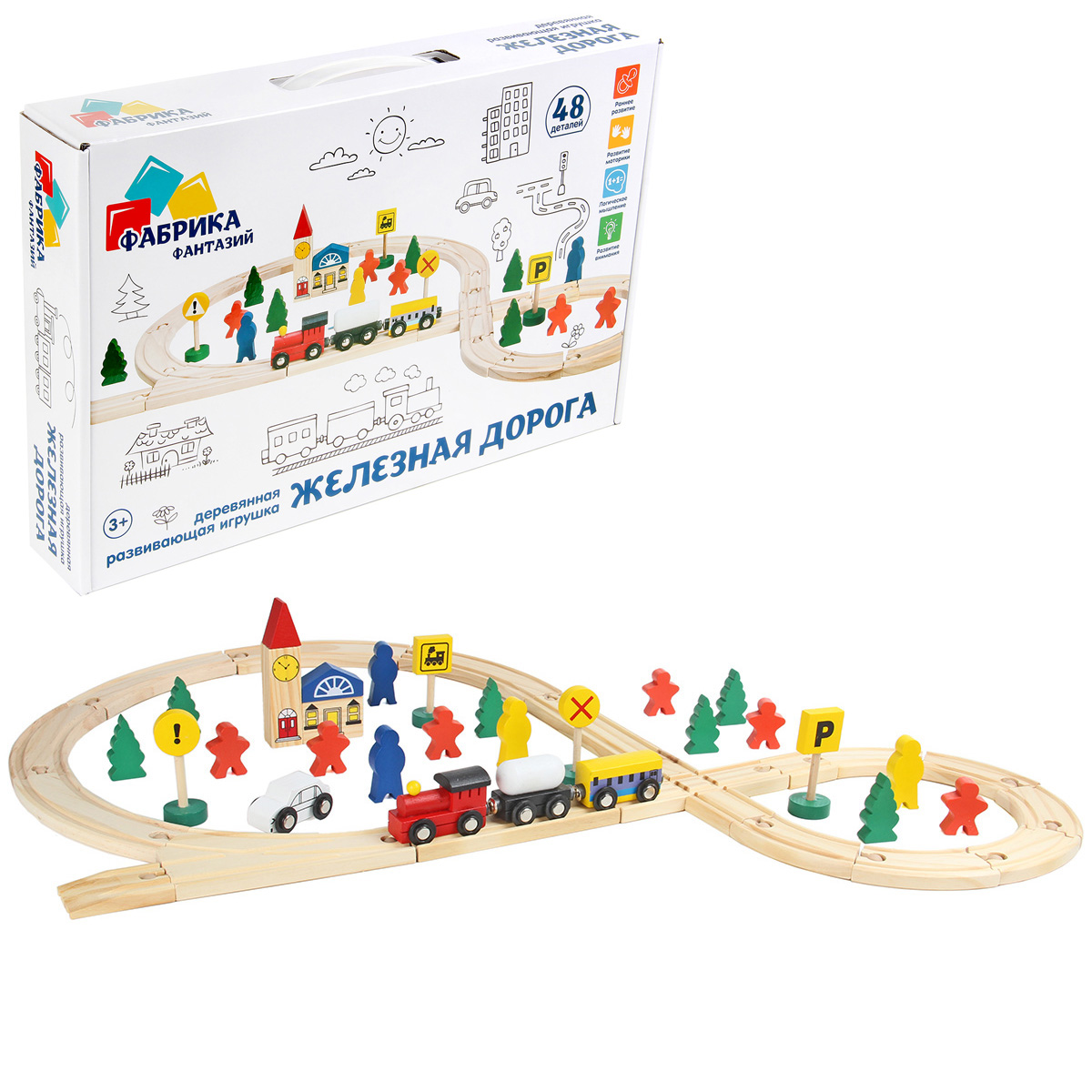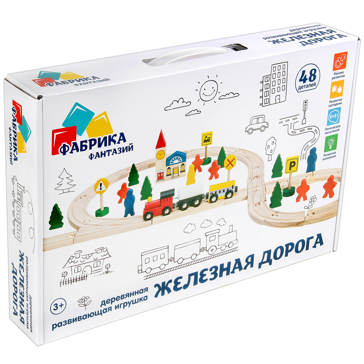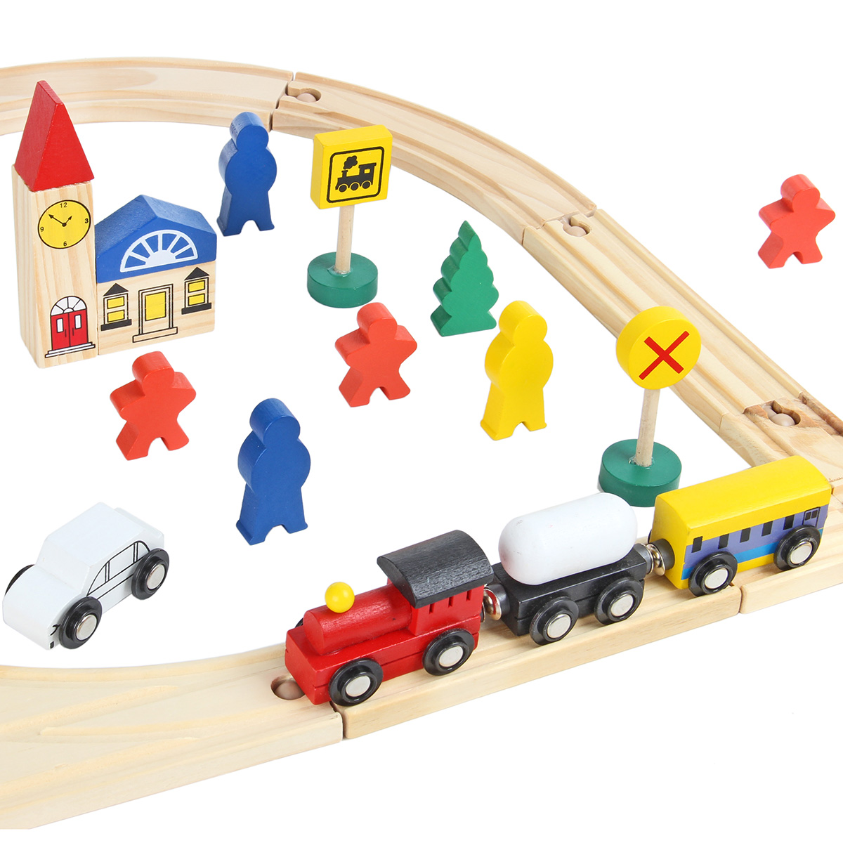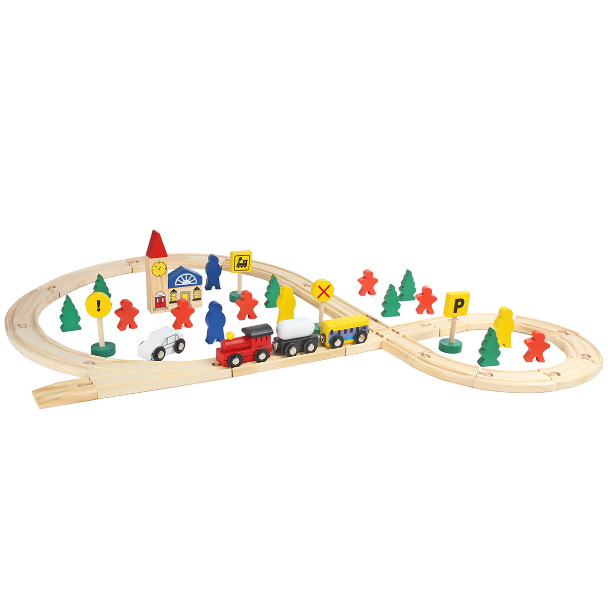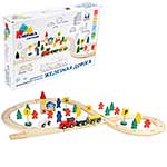 Деревянный конструктор позволит малышу собрать настоящую железную дорогу с поездами, знаками и зданиями. В комплект входят: 20 элементов дорожных рельсов, 10 фигурок людей, 4 дорожных знака, 6 деревьев, 1 локомотив, 2 вагона, 4 детали для сборки зданий, машинка.