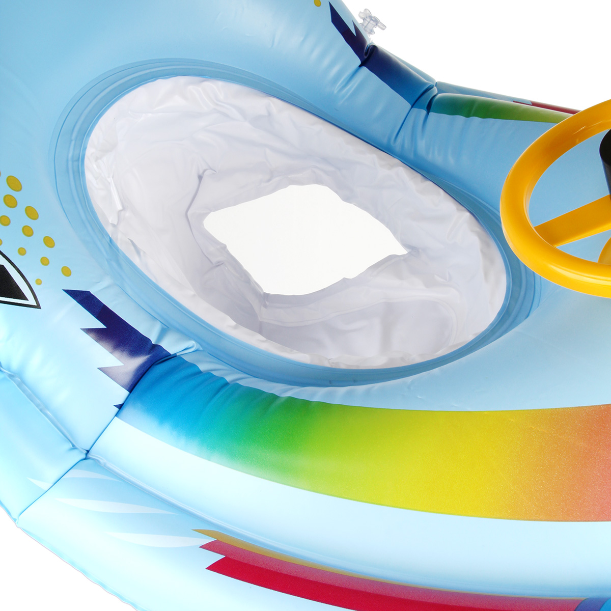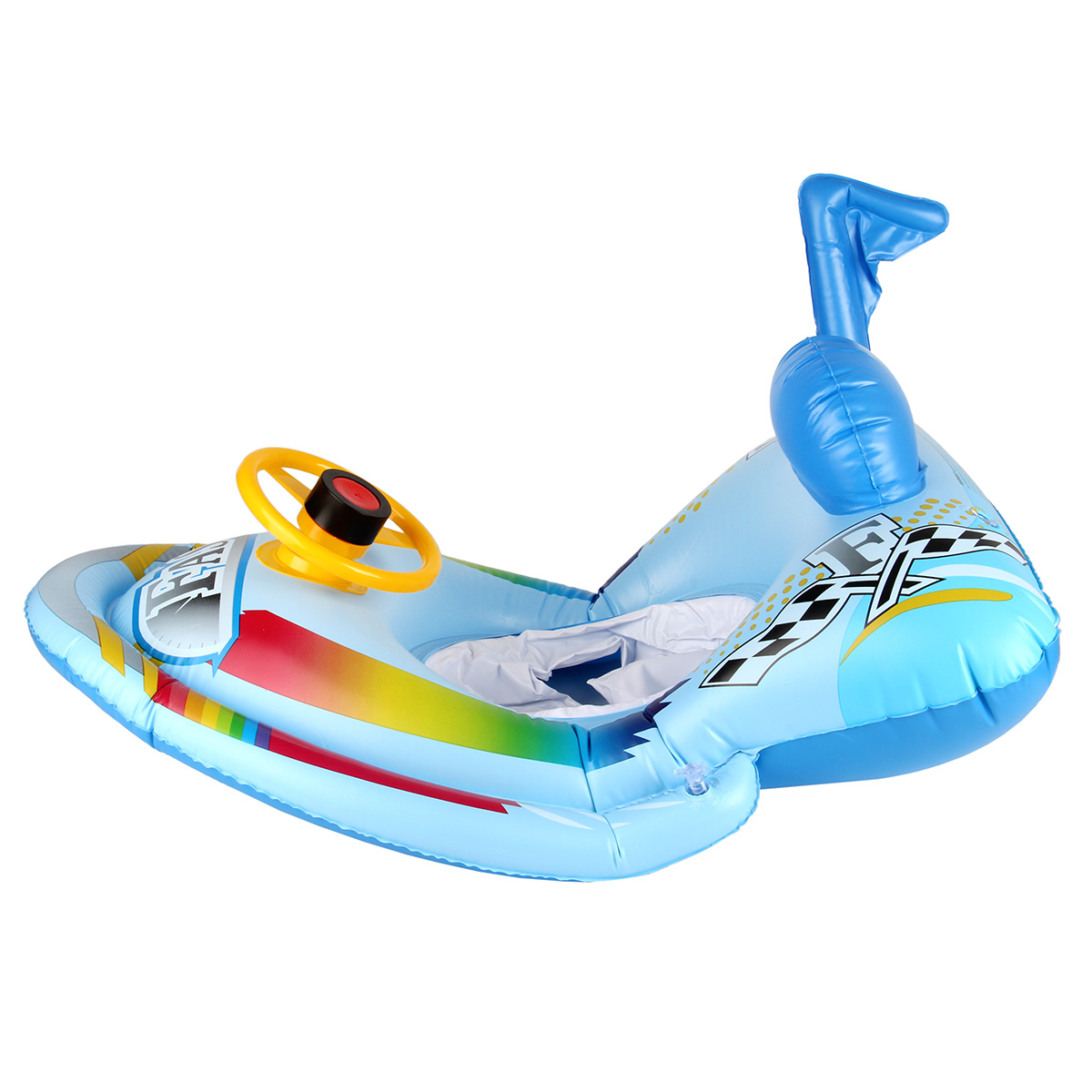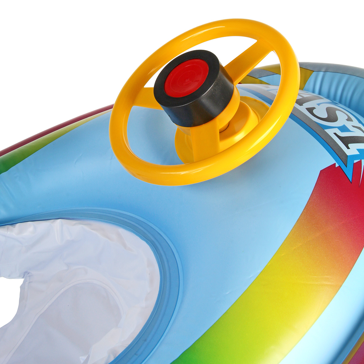 Лодка детская надувная для плавания в яркой расцветке и оригинальном эргономичном дизайне. Надувная лодка для детей оснащена удобным сиденьем с отверстиями для ножек, безопасное знакомство с водной стихией, трусики с мягкой подкладкой, дополнительный комфорт для ребенка. Надувной плот имеет крутящийся на 360 градусов руль, на руле располагается кнопка клаксона, при нажатии на клаксон плавательный плотик издает писк. Плавательный круг легко надувается и сдувается, занимает мало места в сдутом состоянии, что облегчает процесс его хранения и транспортировки.