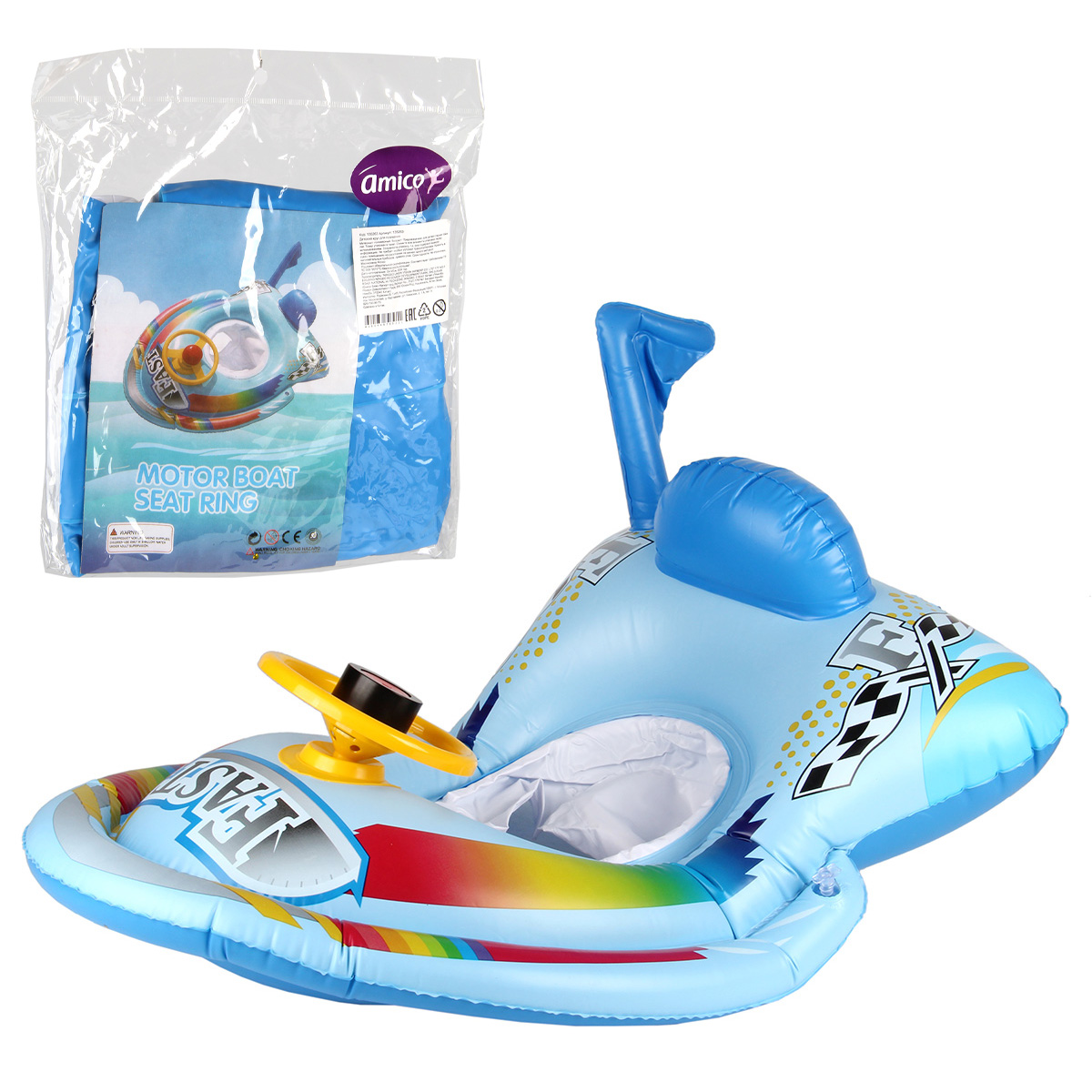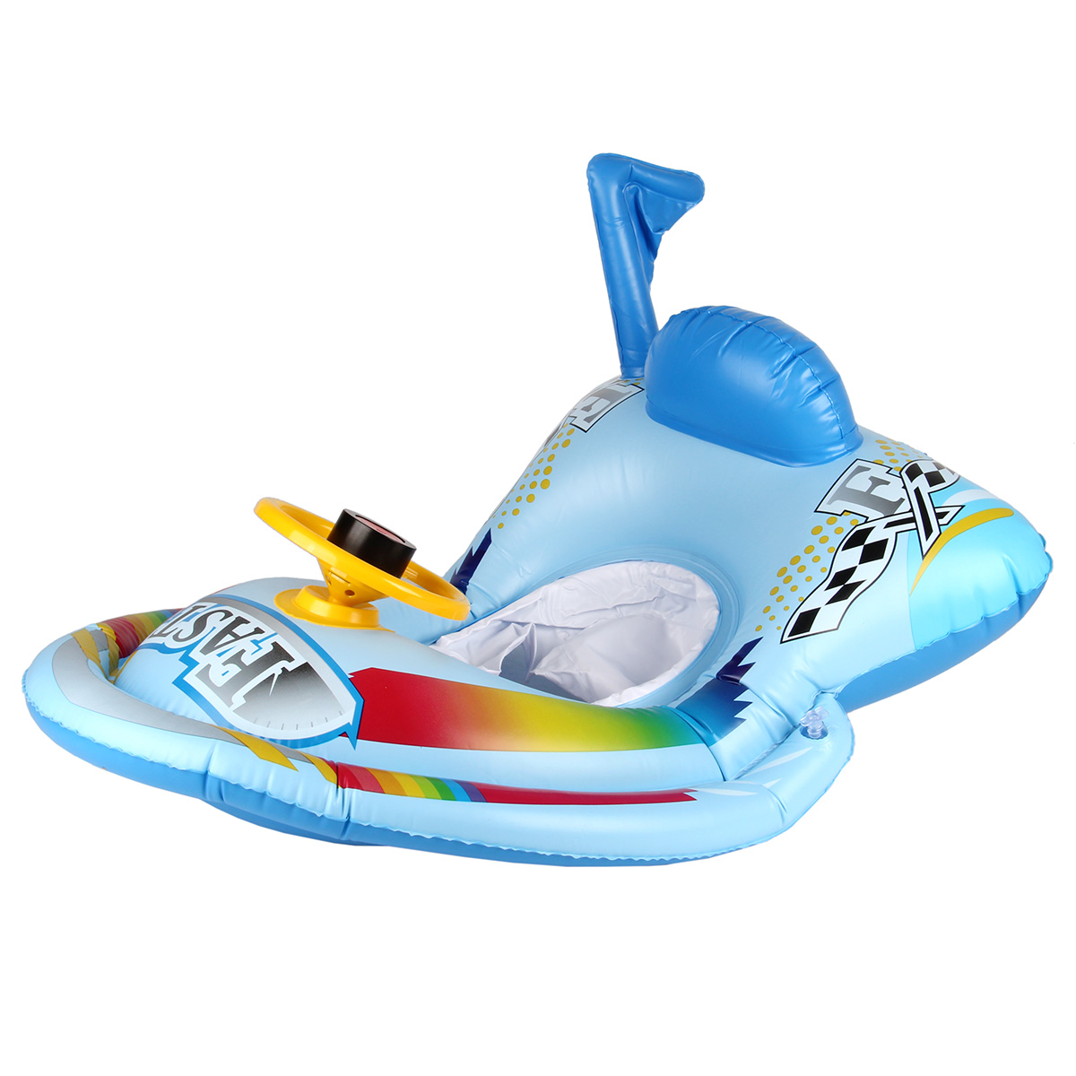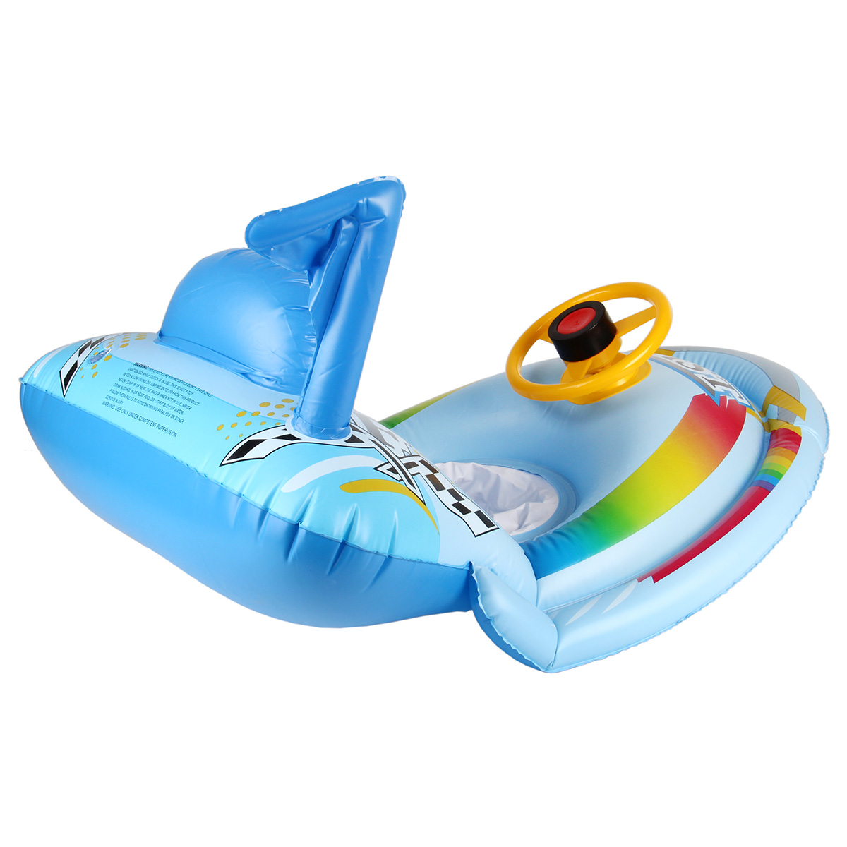 Лодка детская надувная для плавания в яркой расцветке и оригинальном эргономичном дизайне. Надувная лодка для детей оснащена удобным сиденьем с отверстиями для ножек, безопасное знакомство с водной стихией, трусики с мягкой подкладкой, дополнительный комфорт для ребенка. Надувной плот имеет крутящийся на 360 градусов руль, на руле располагается кнопка клаксона, при нажатии на клаксон плавательный плотик издает писк. Плавательный круг легко надувается и сдувается, занимает мало места в сдутом состоянии, что облегчает процесс его хранения и транспортировки.