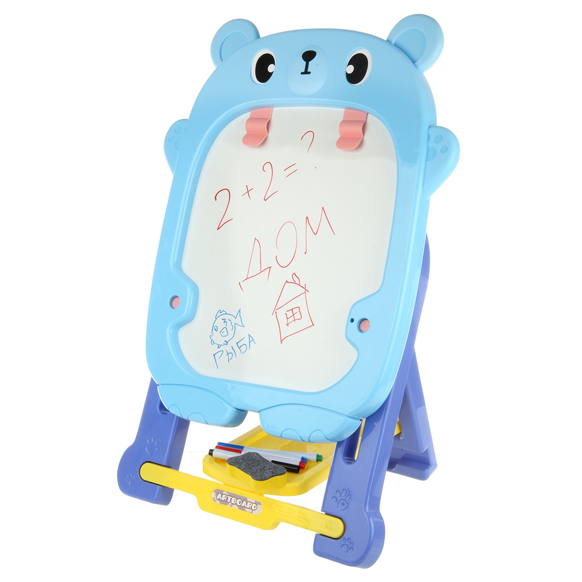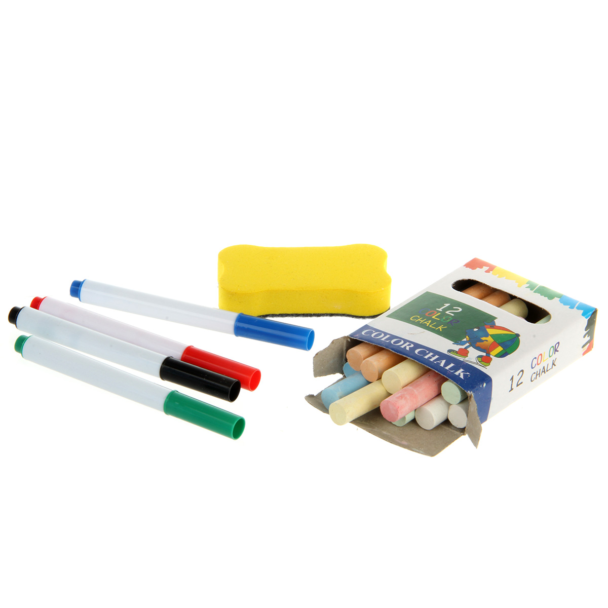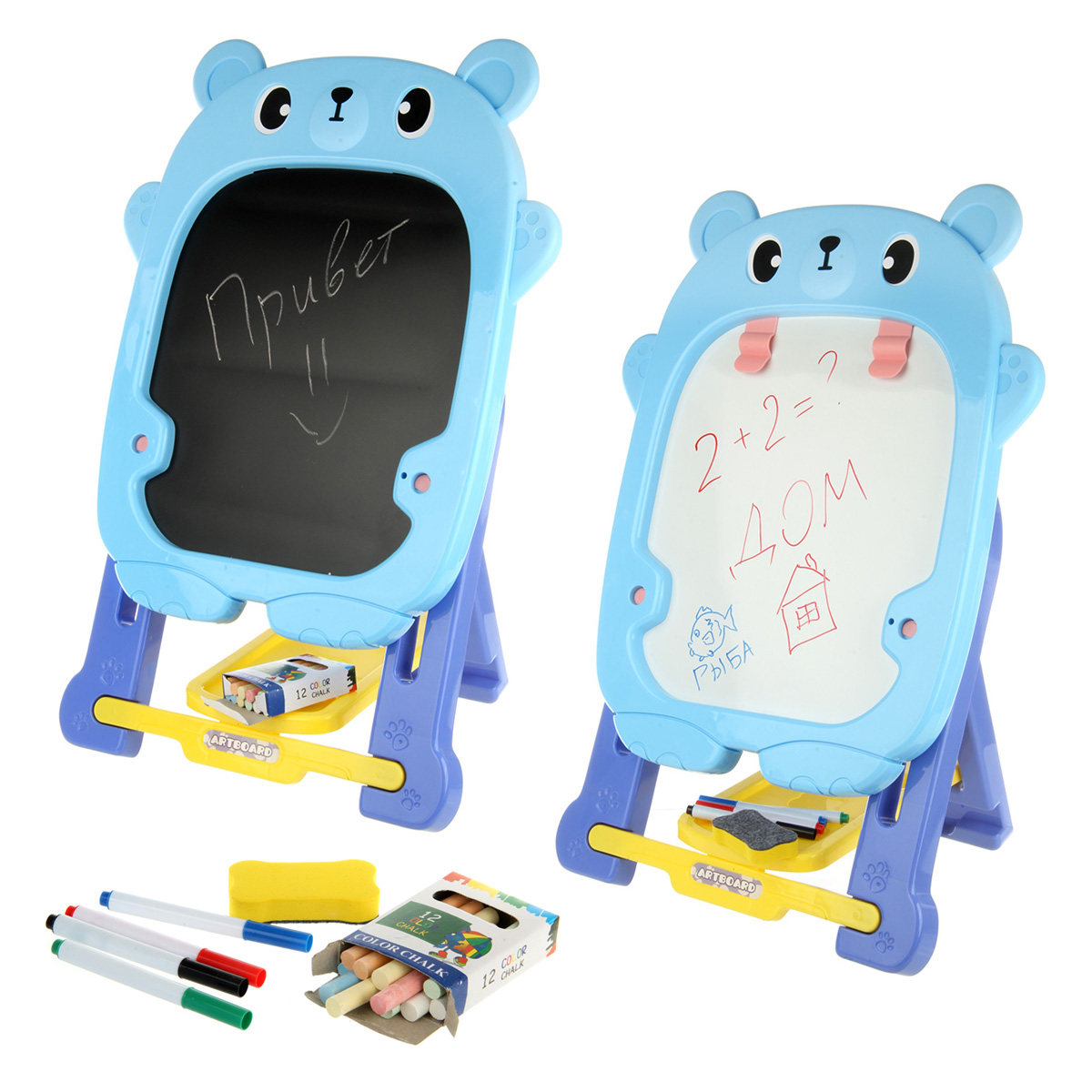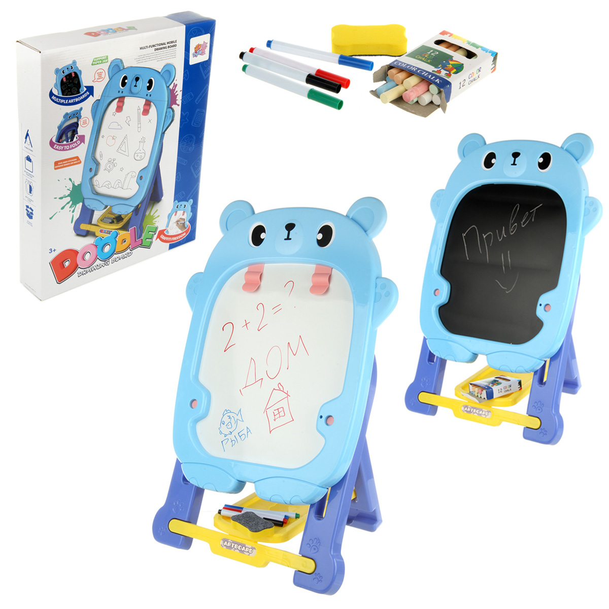В комплекте доска с подставкой, 4 фломастера, губка, 12 разноцветных мелков, набор наклеек.