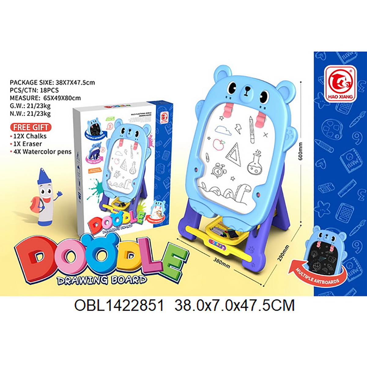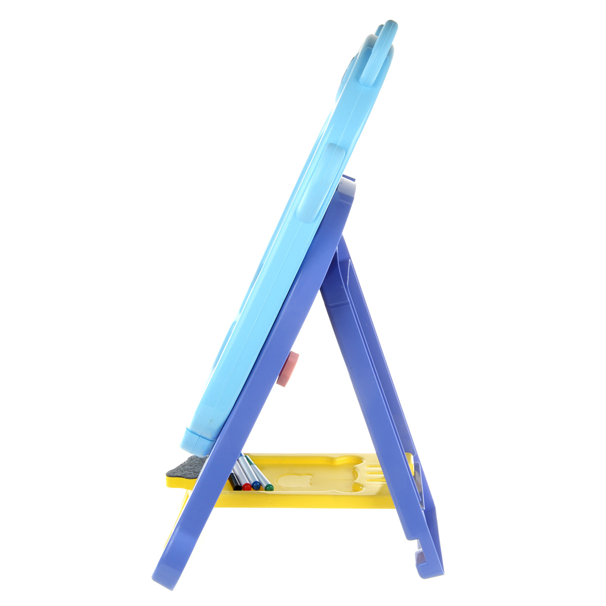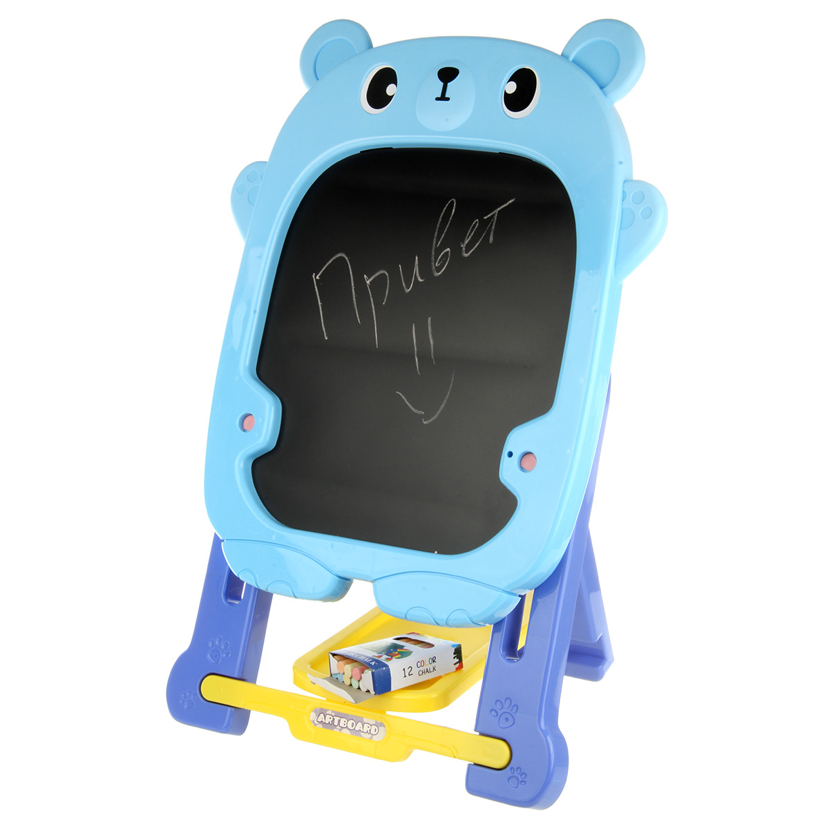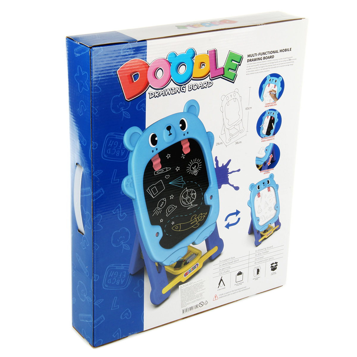 В комплекте доска с подставкой, 4 фломастера, губка, 12 разноцветных мелков, набор наклеек.