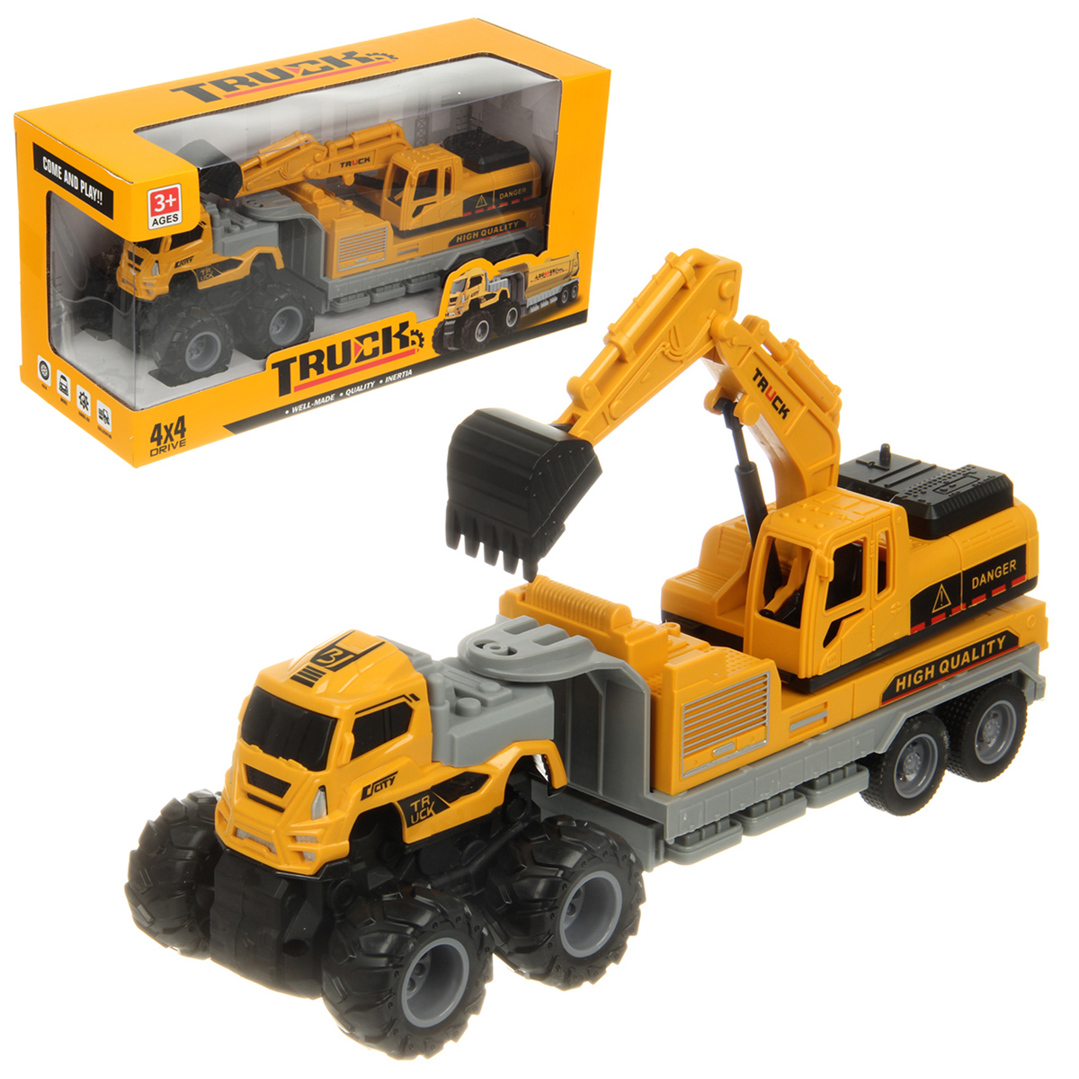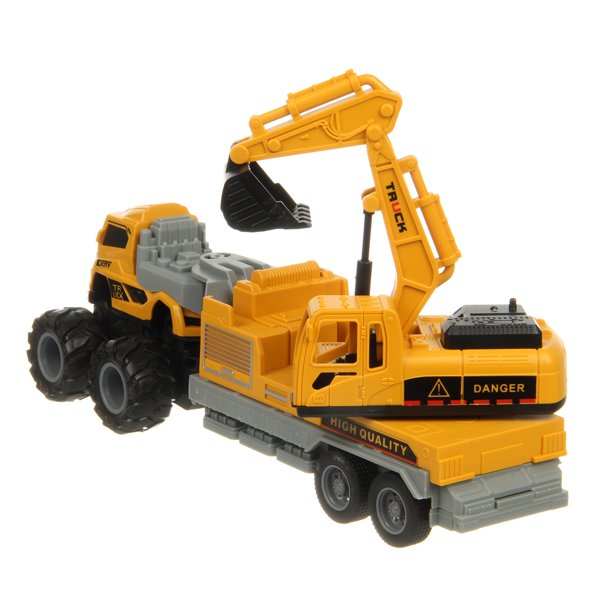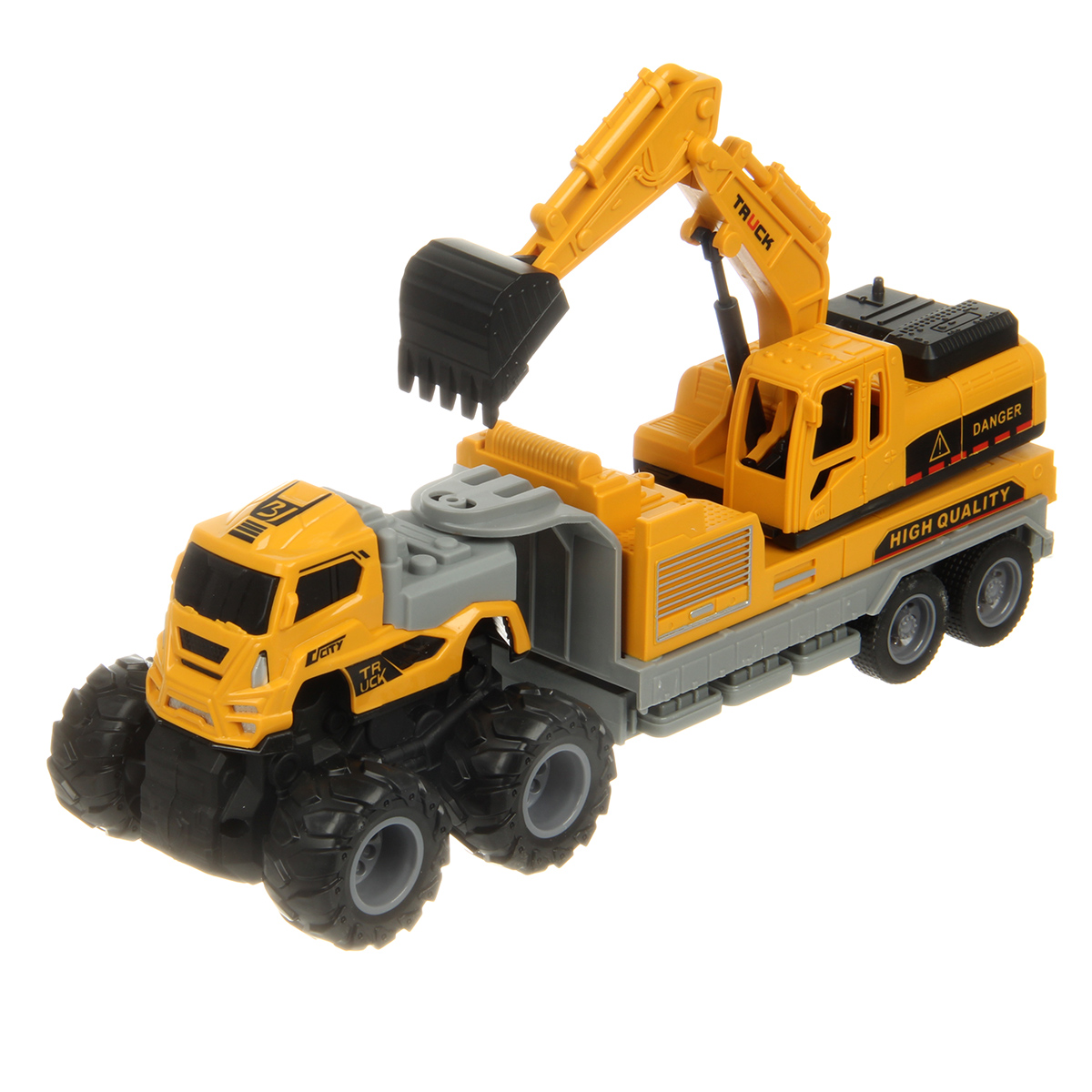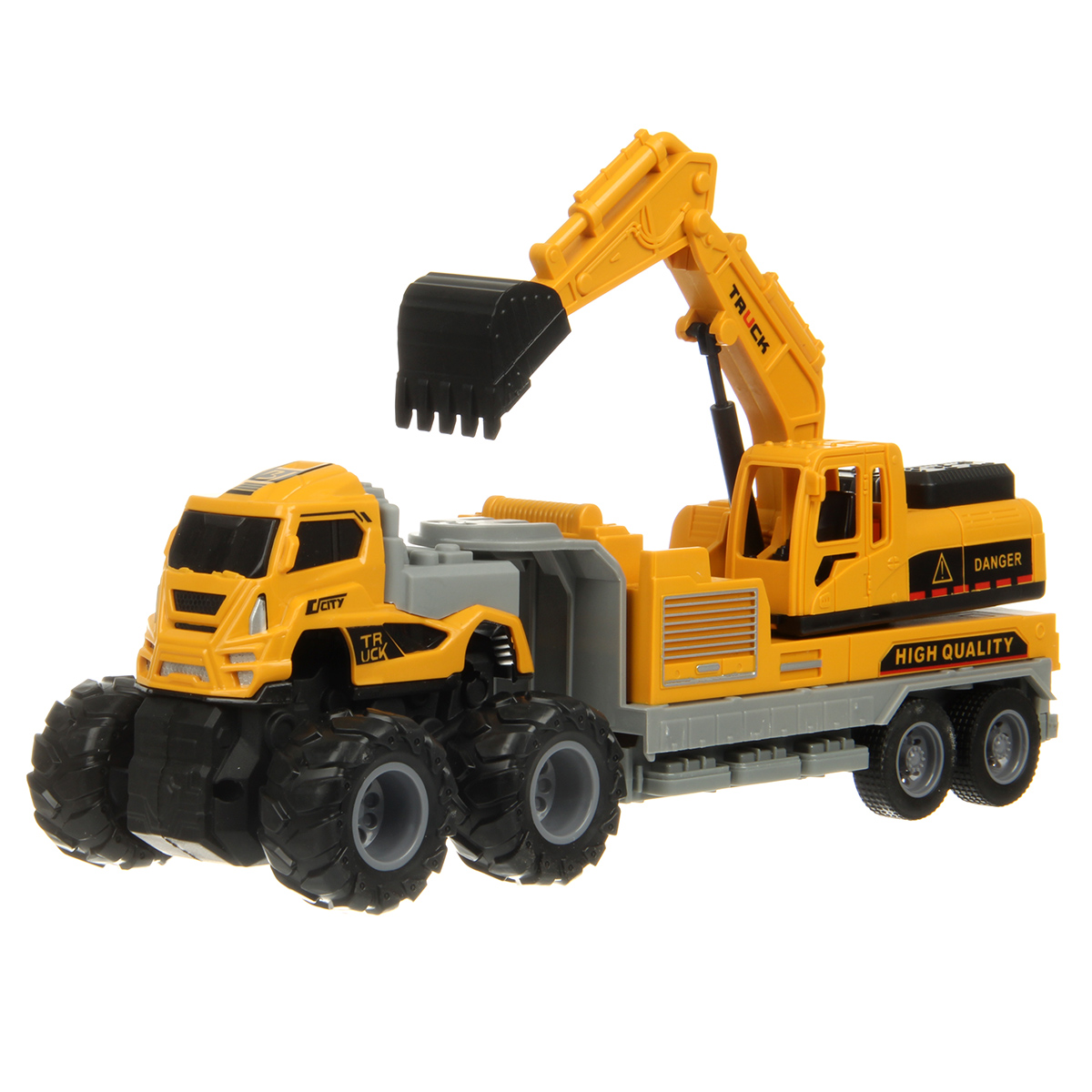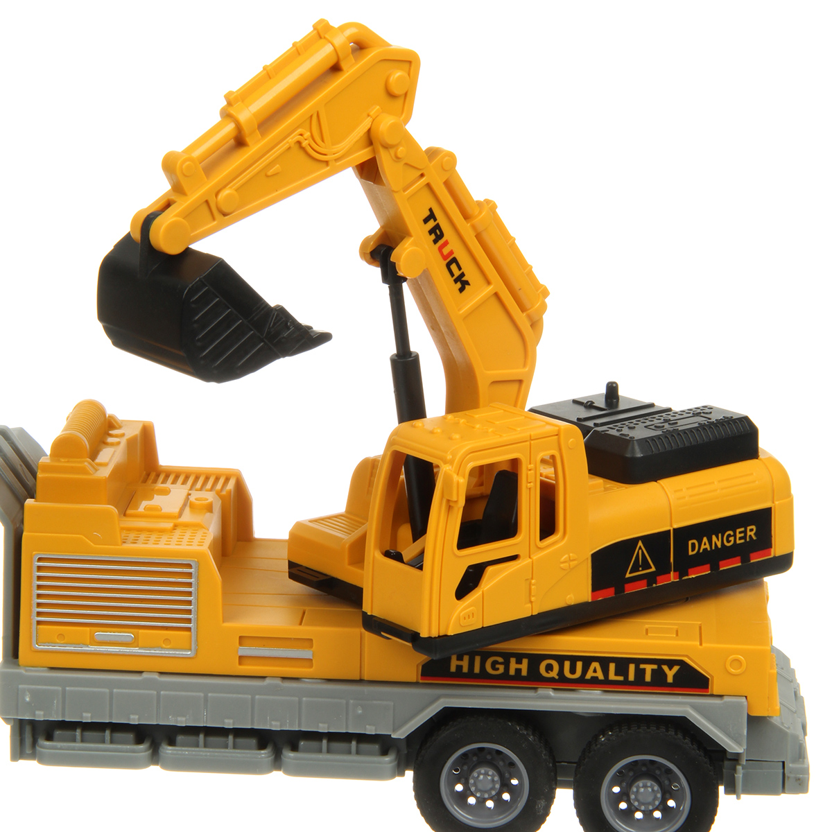 Игрушечный экскаватор с прорезиненными колесами изготовлен из прочных и долговечных материалов.