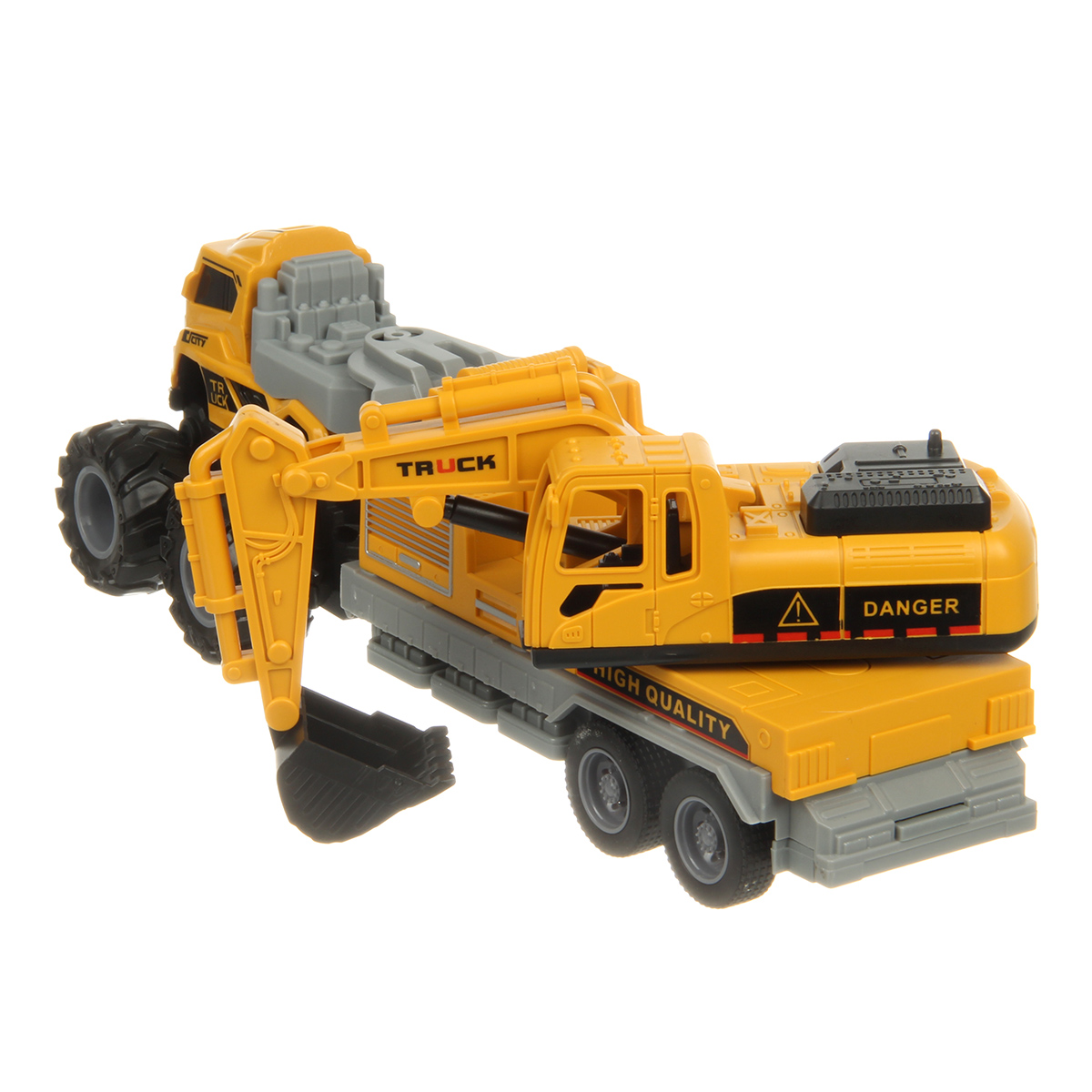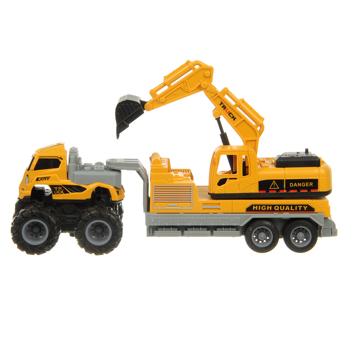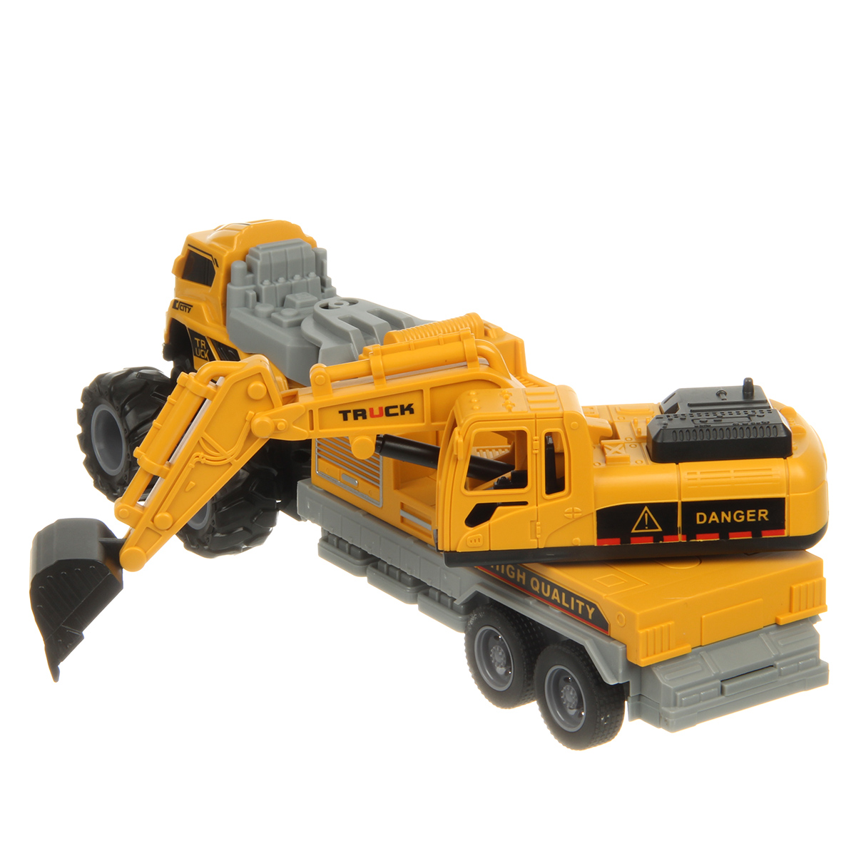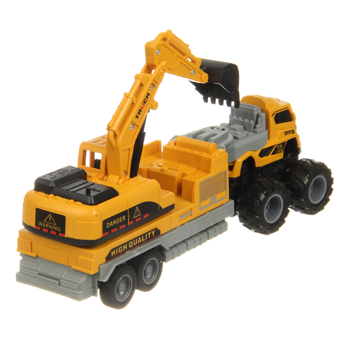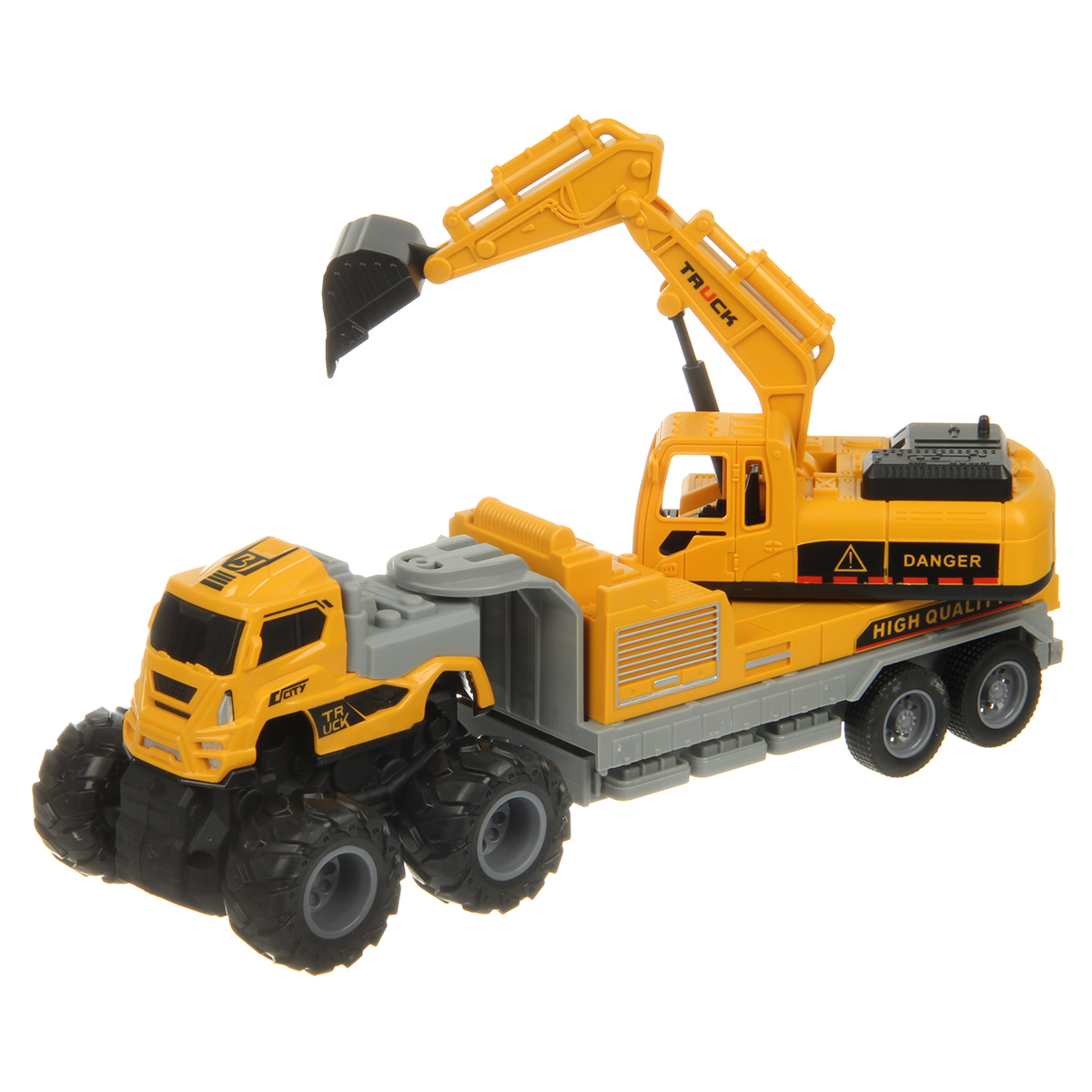 Игрушечный экскаватор с прорезиненными колесами изготовлен из прочных и долговечных материалов.