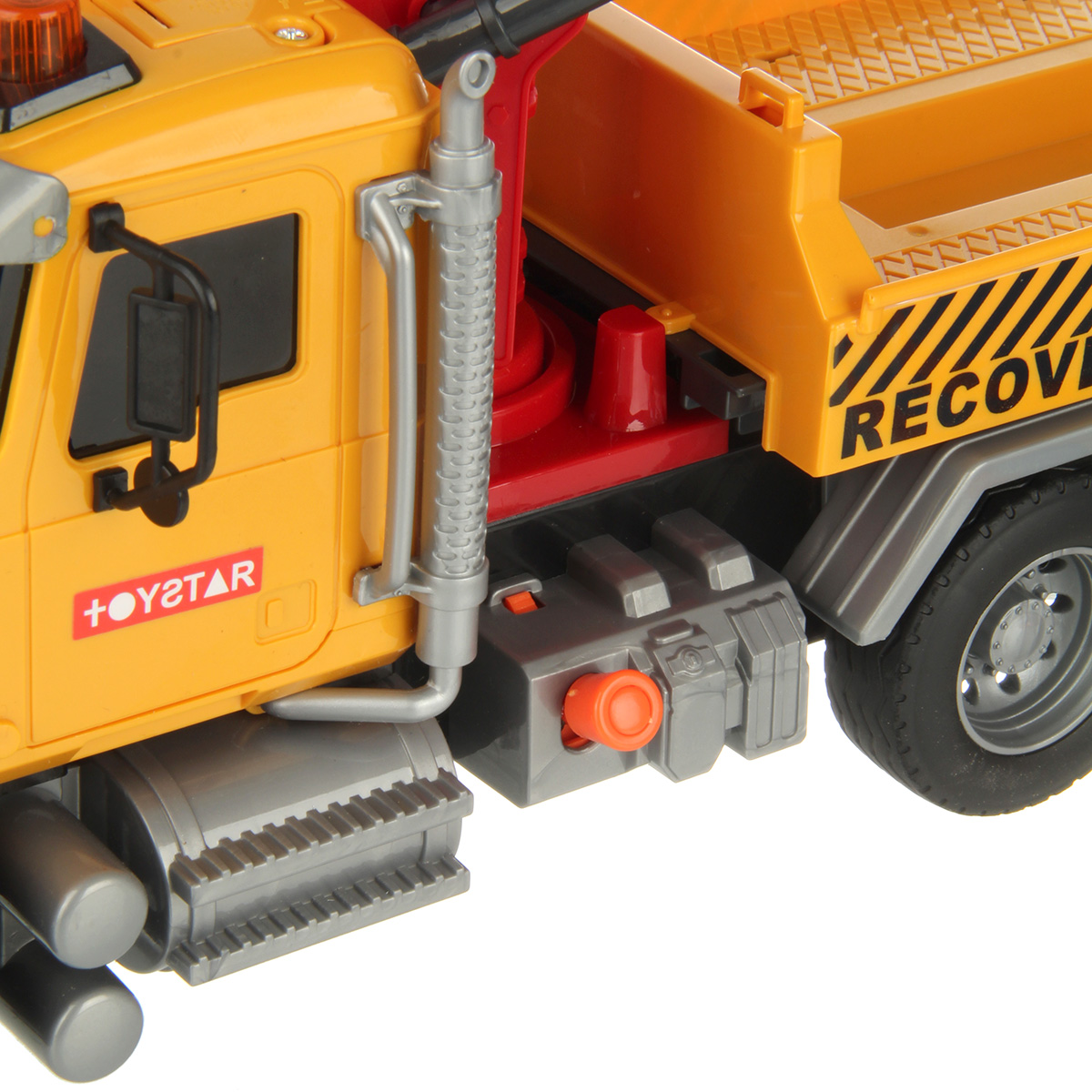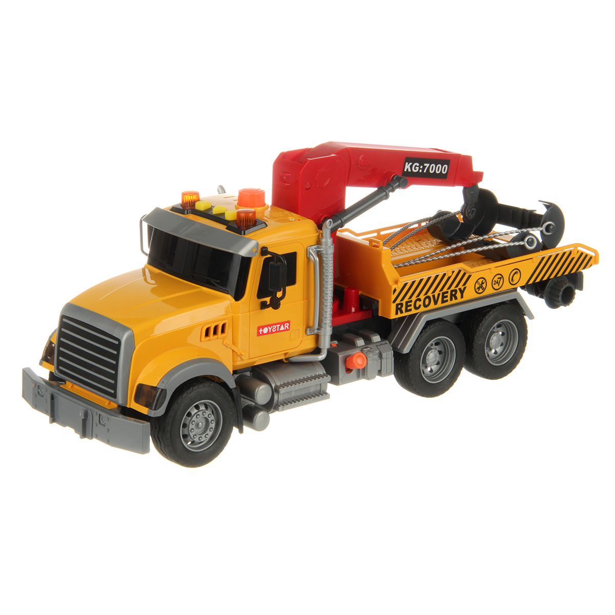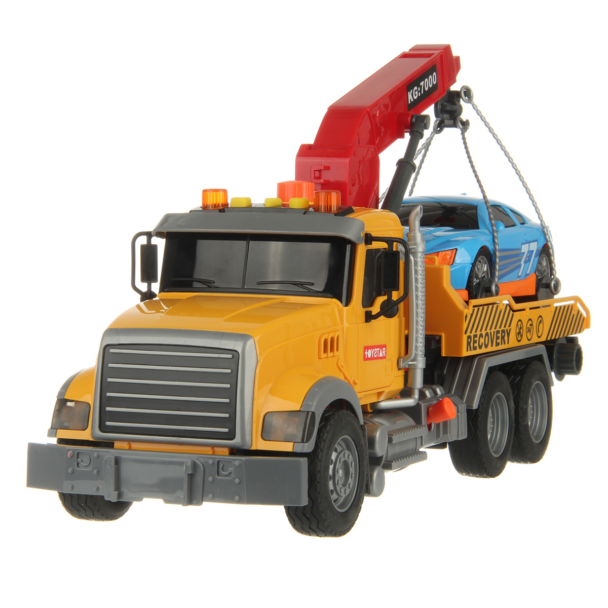 5. Звуковые и световые эффекты. При нажатии кнопок на кабине эвакуатор издает звуки гудка, заводящегося двигателя, работающего транспорта, аварийного хода, боковые лампочки подсвечиваются.