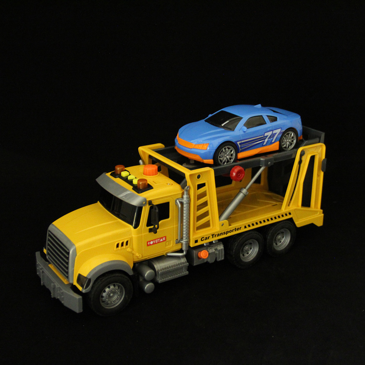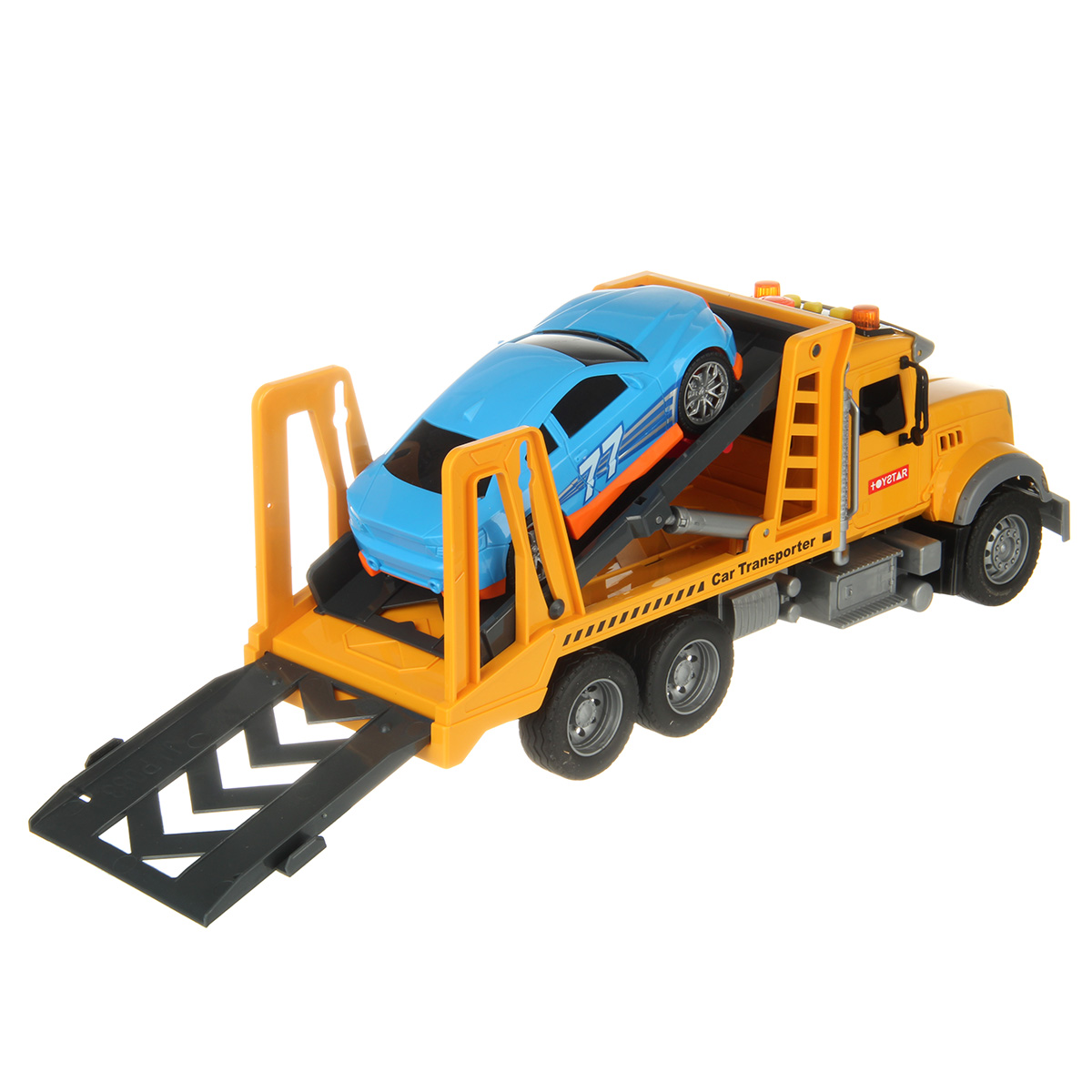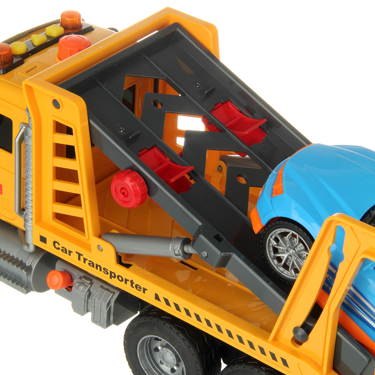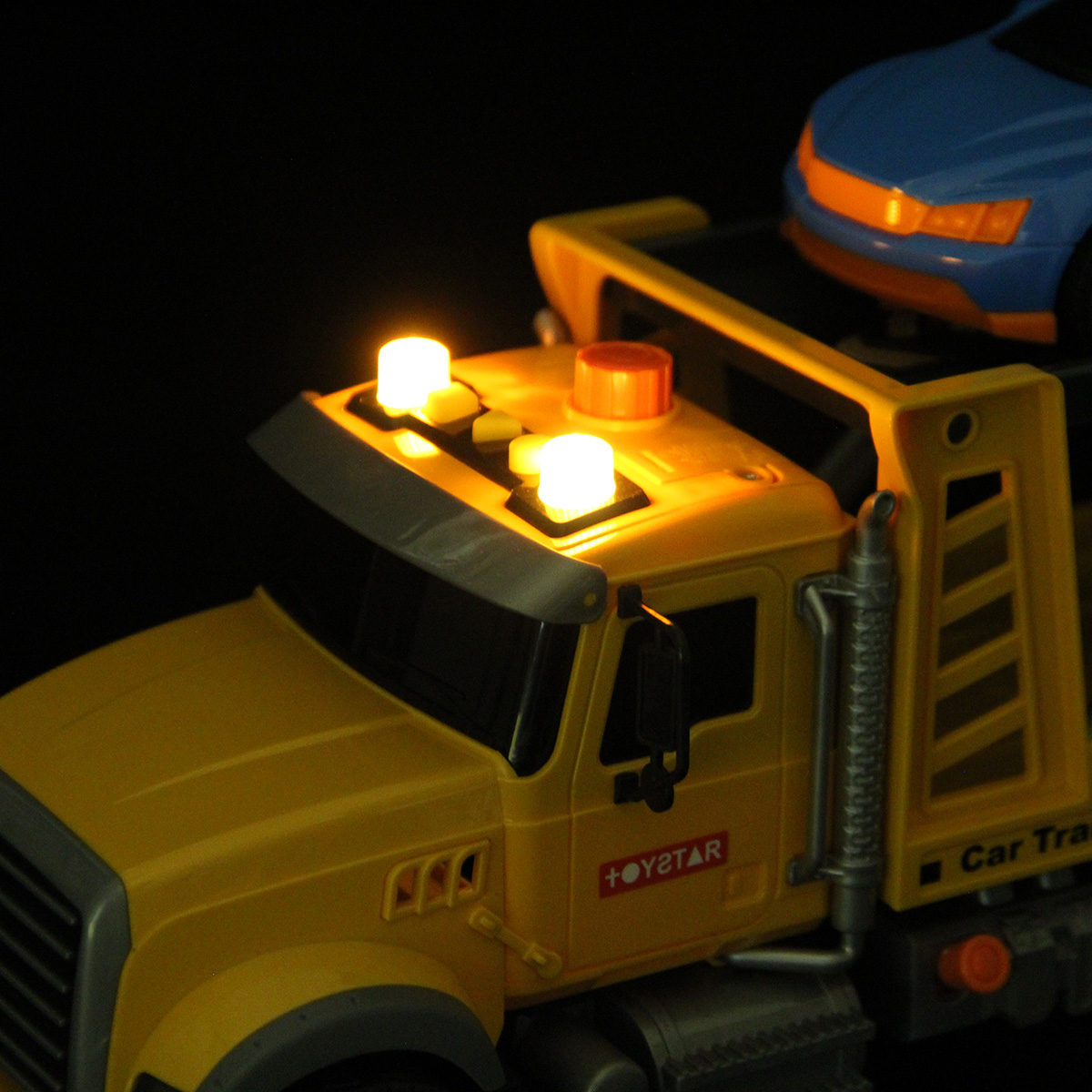 4. Звуковые и световые эффекты. При нажатии кнопок на кабине эвакуатор издает звуки гудка, заводящегося двигателя, работающего транспорта, аварийного хода, боковые лампочки подсвечиваются.