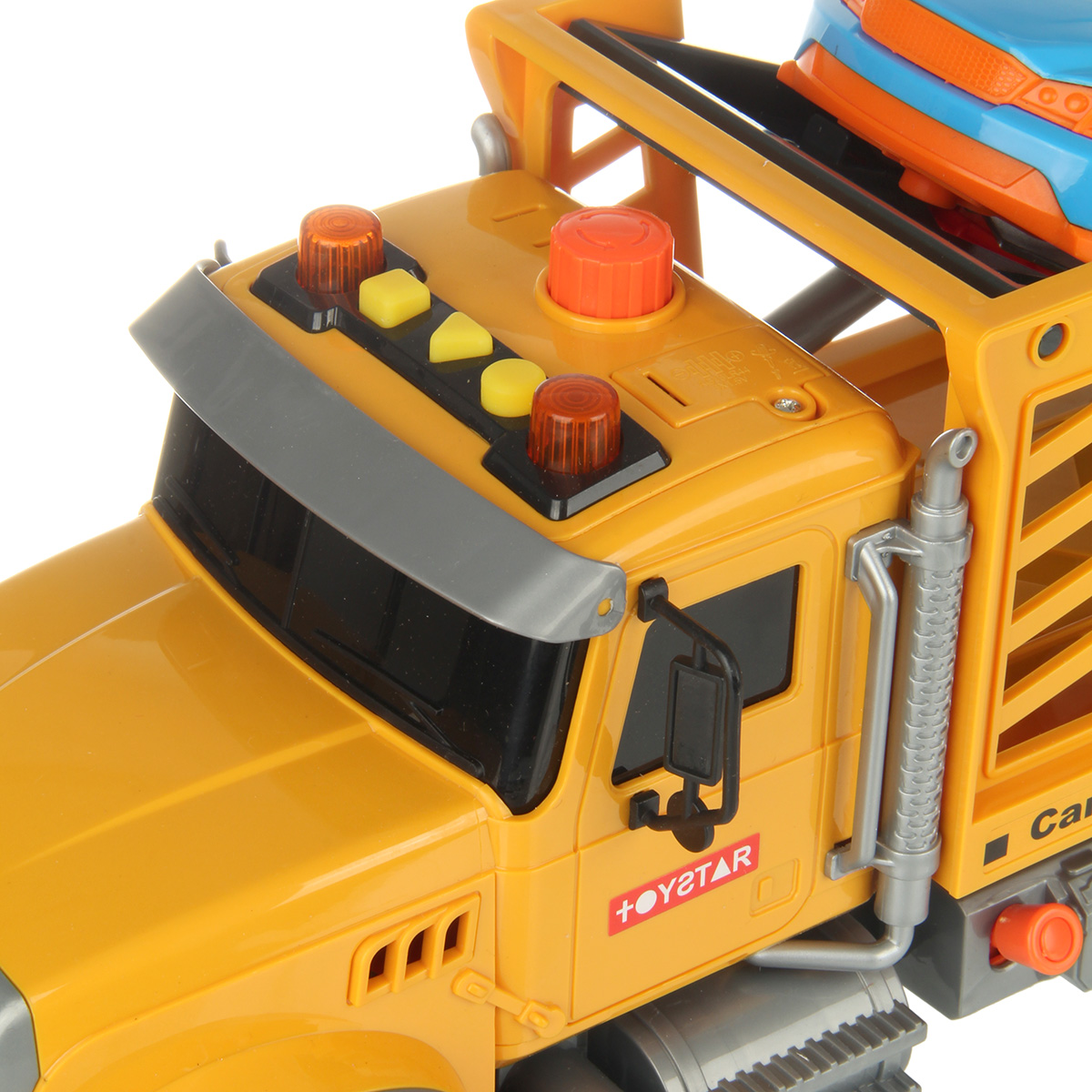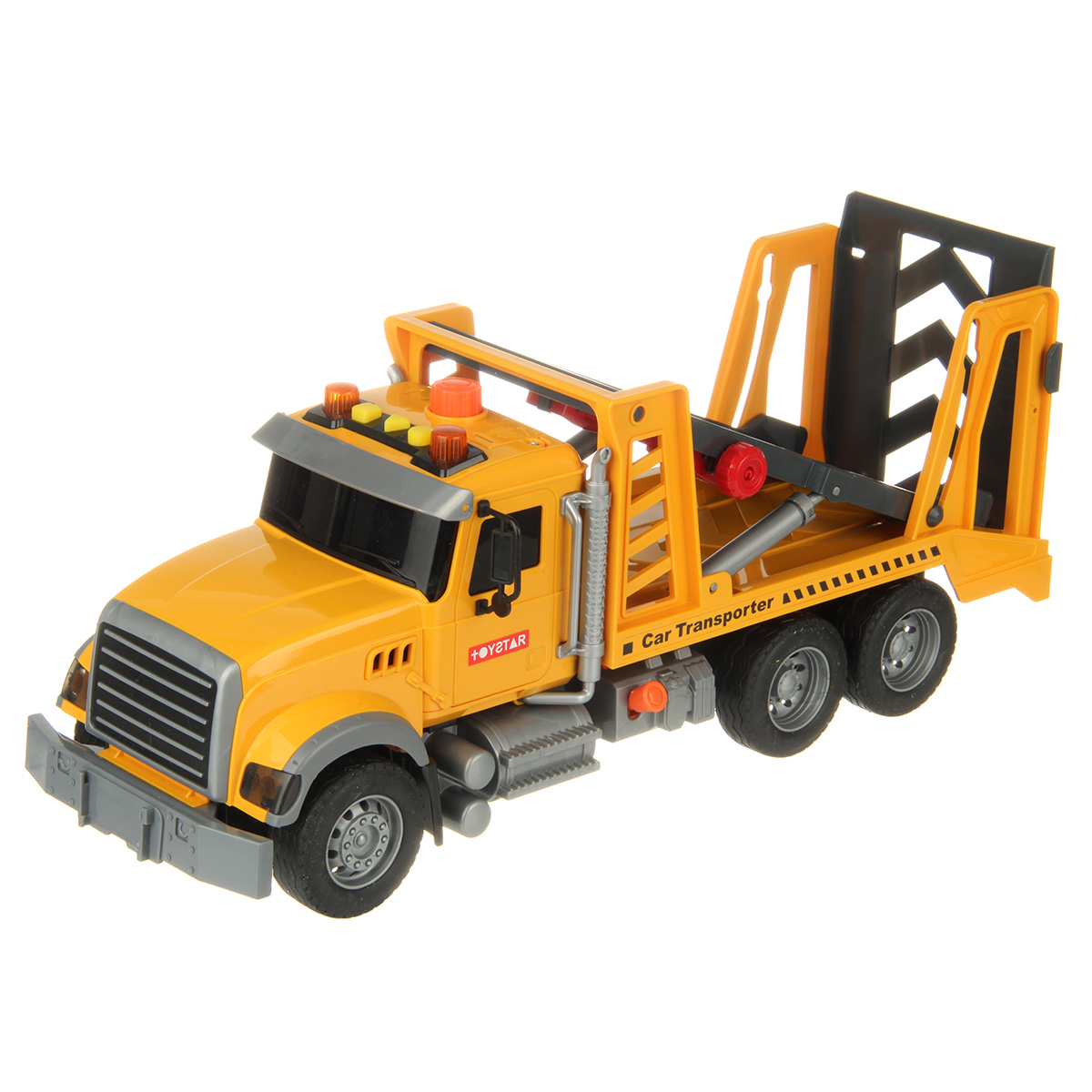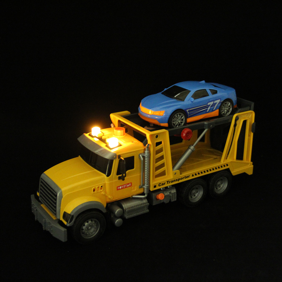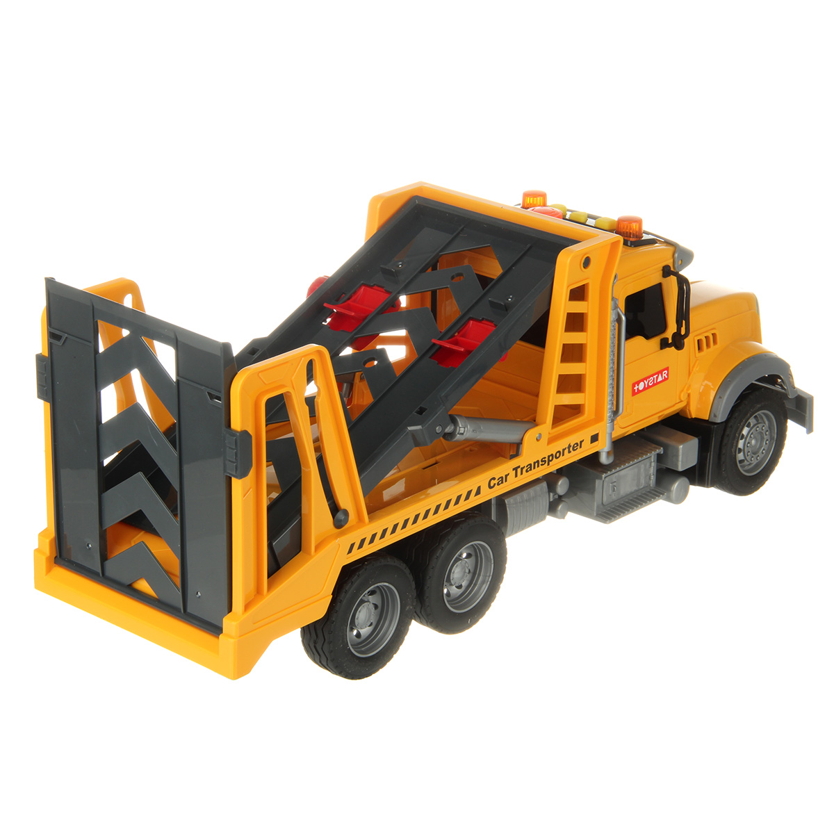 4. Звуковые и световые эффекты. При нажатии кнопок на кабине эвакуатор издает звуки гудка, заводящегося двигателя, работающего транспорта, аварийного хода, боковые лампочки подсвечиваются.