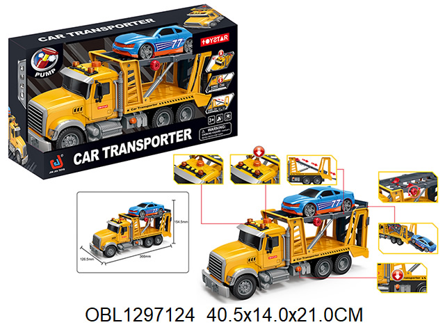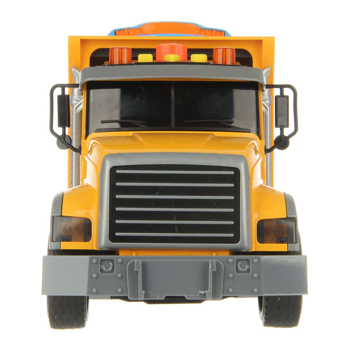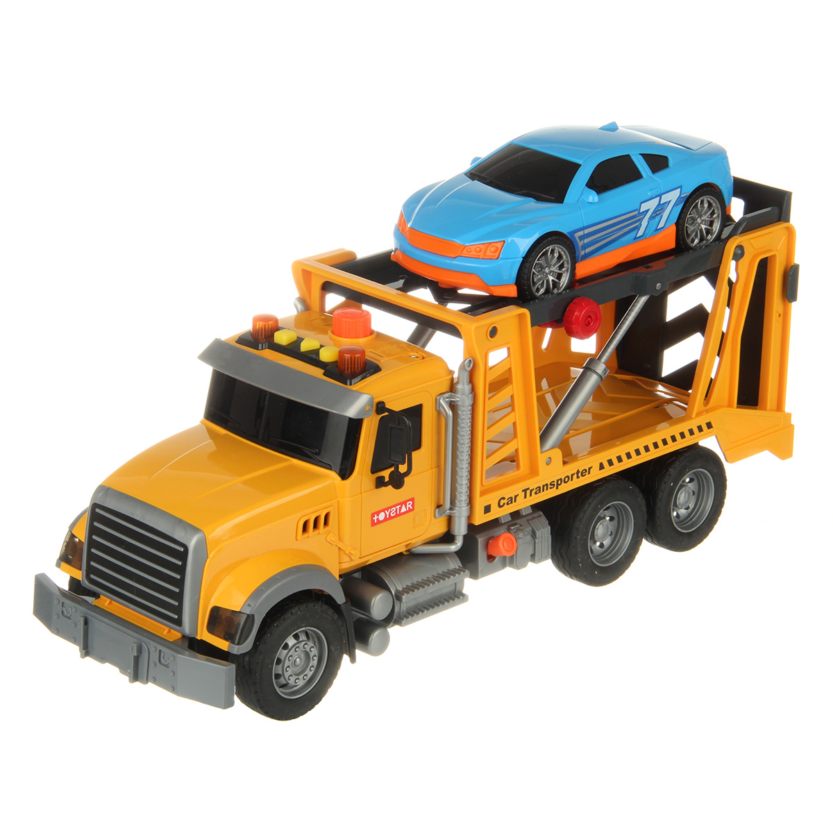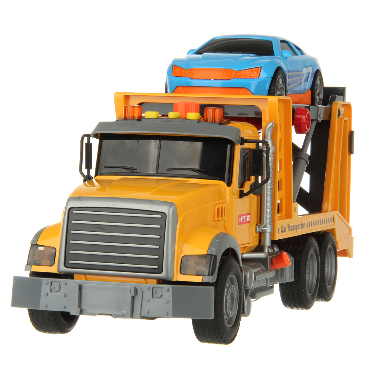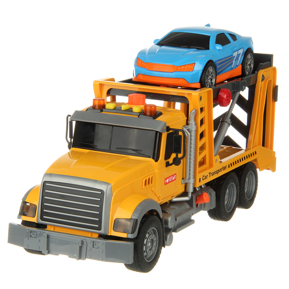 4. Звуковые и световые эффекты. При нажатии кнопок на кабине эвакуатор издает звуки гудка, заводящегося двигателя, работающего транспорта, аварийного хода, боковые лампочки подсвечиваются.