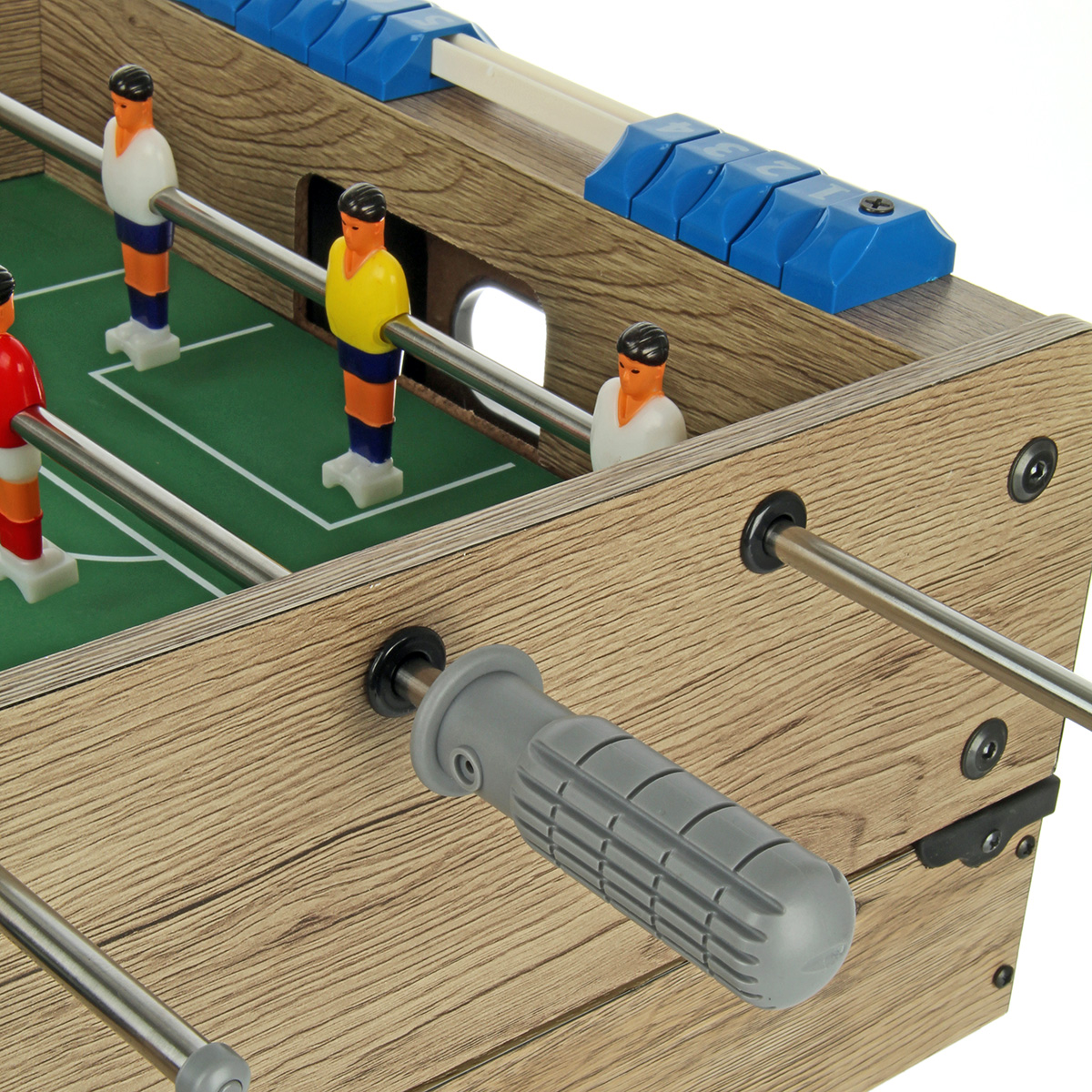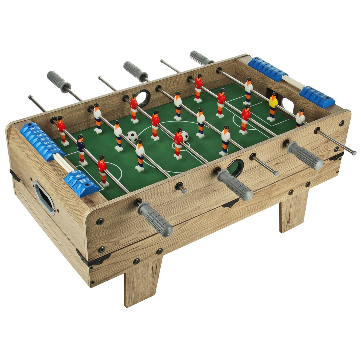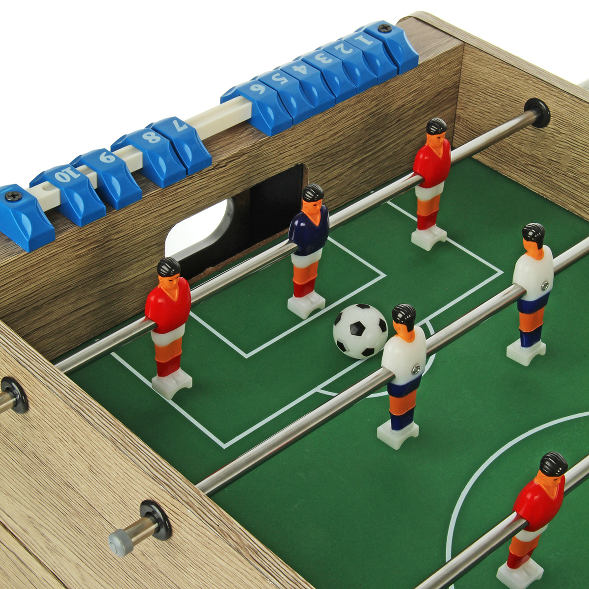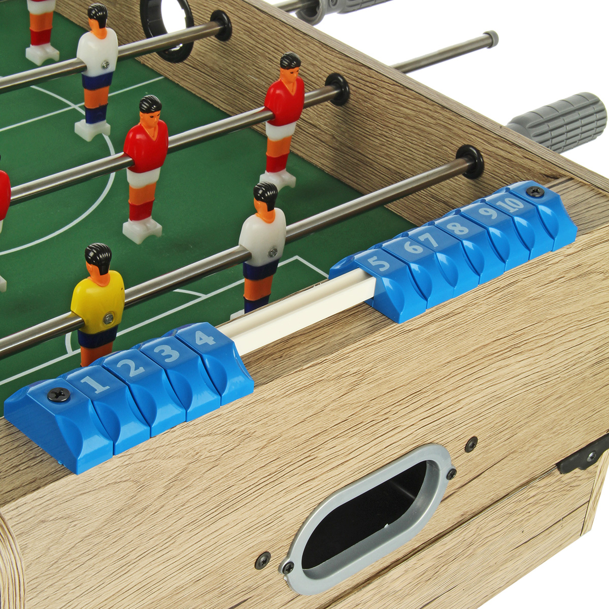 1. Настольный футбол собирается отдельной площадкой. Можно поставить игровую площадку на ножки, можно не ставить. Двигая ручками, можно управлять фигурками игроков, ручки имеют ребристую поверхность против скольжения. На боковых шкалах есть костяшки с числами от 1 до 10, костяшки передвигаются, можно вести счет.