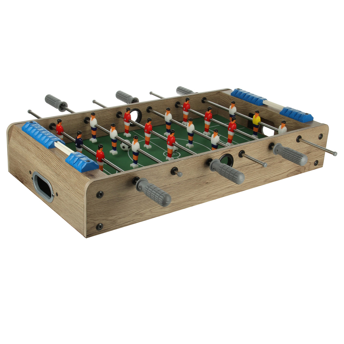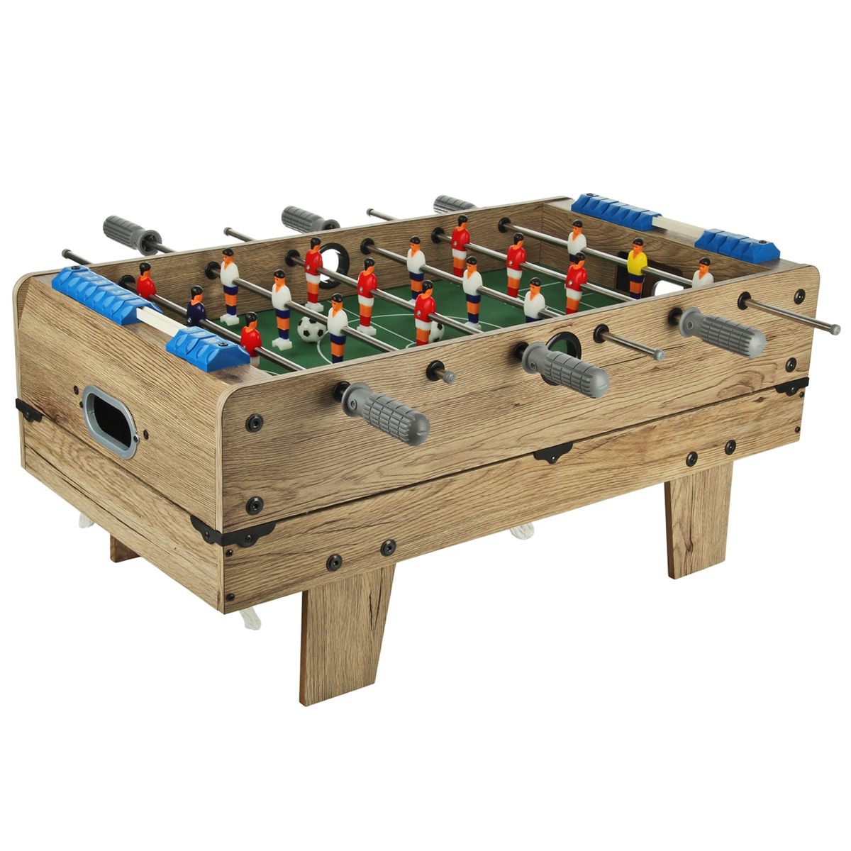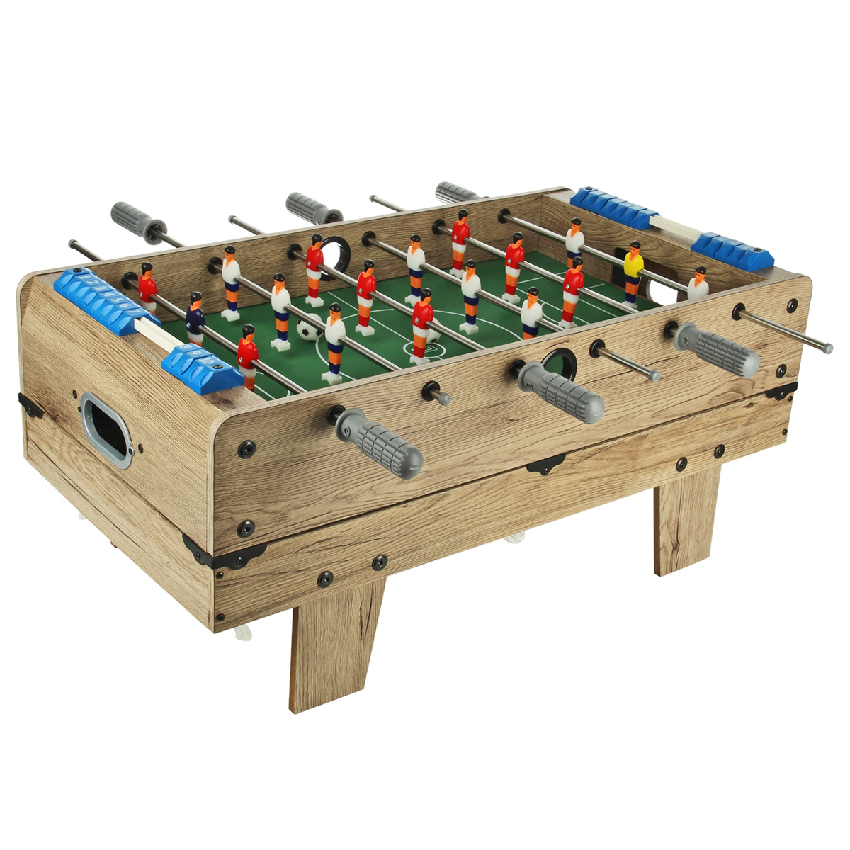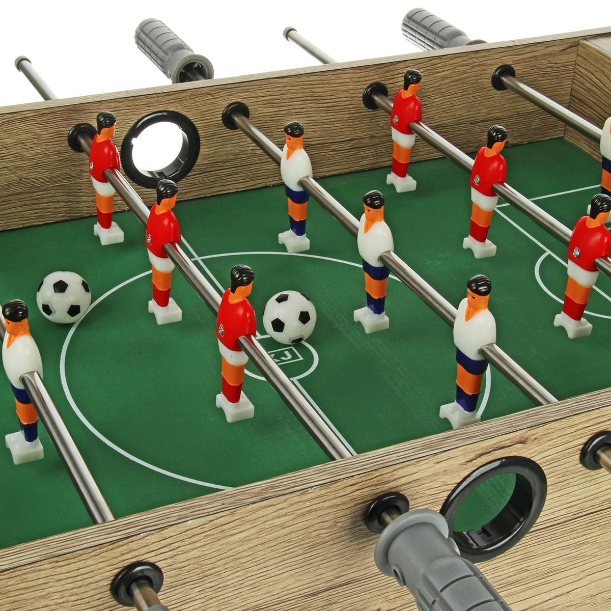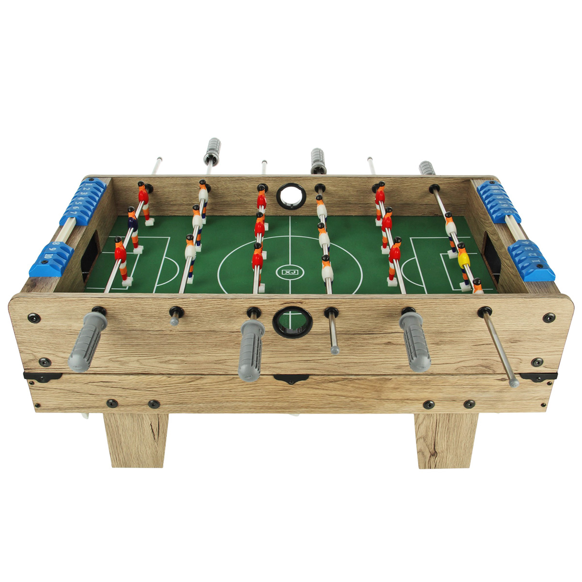 1. Настольный футбол собирается отдельной площадкой. Можно поставить игровую площадку на ножки, можно не ставить. Двигая ручками, можно управлять фигурками игроков, ручки имеют ребристую поверхность против скольжения. На боковых шкалах есть костяшки с числами от 1 до 10, костяшки передвигаются, можно вести счет.