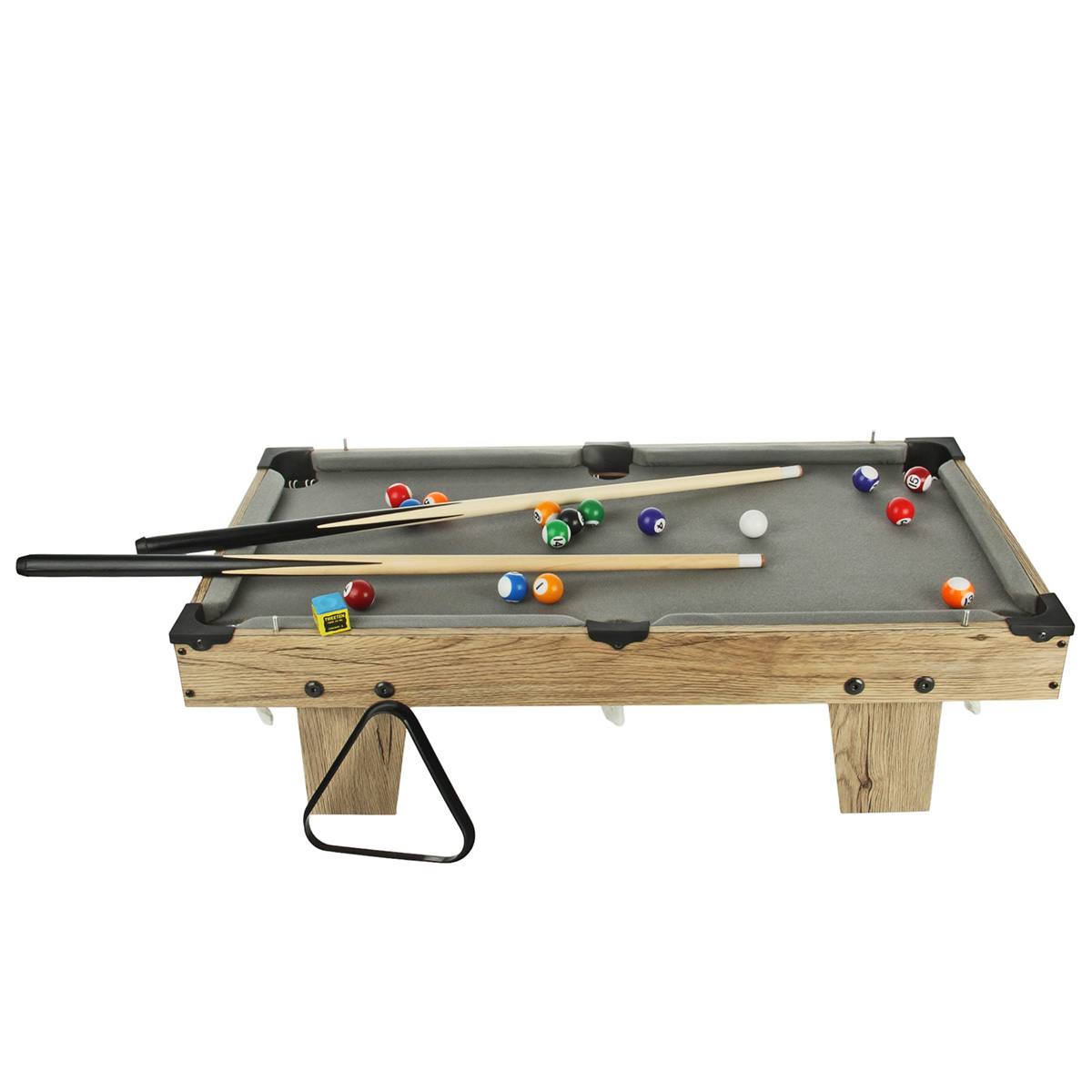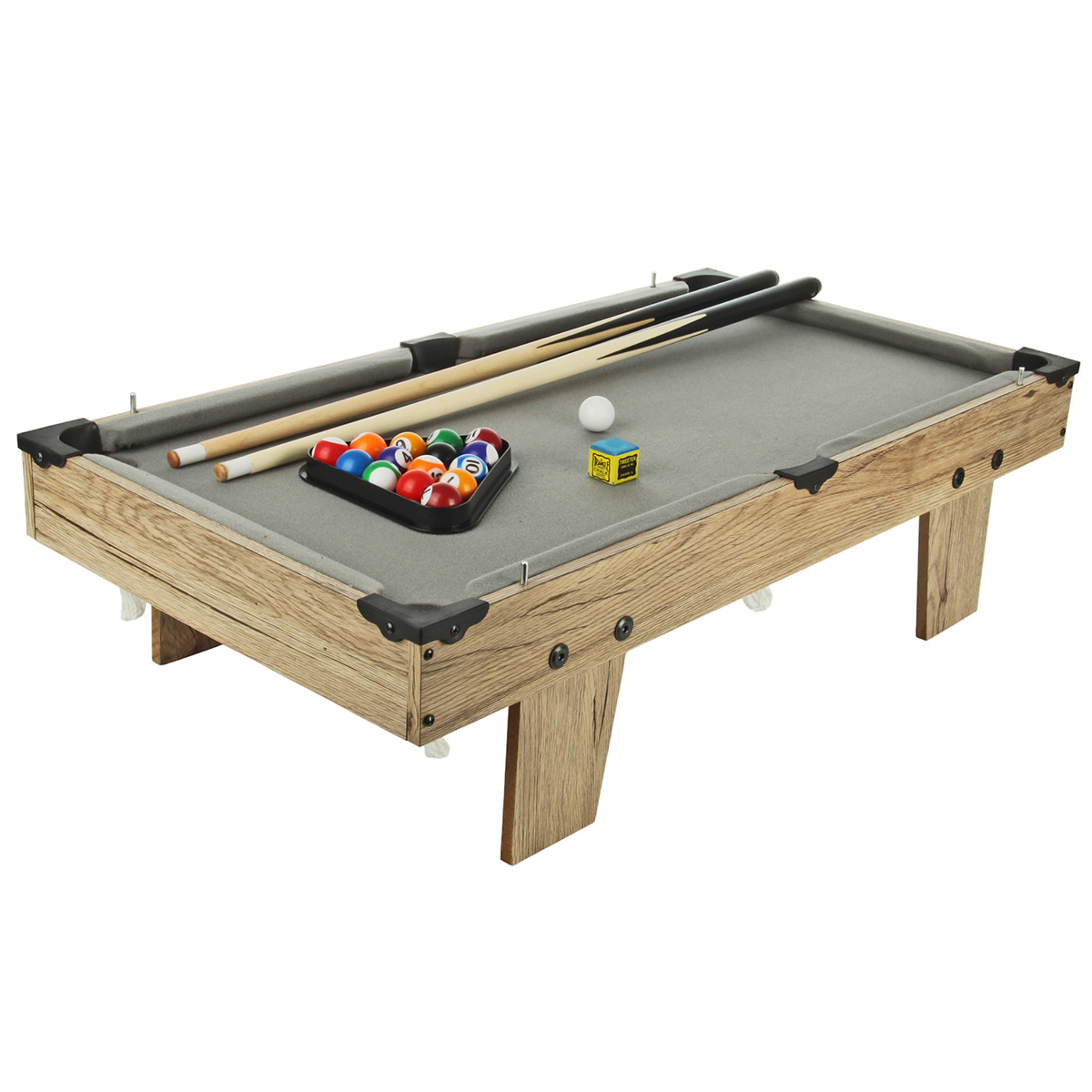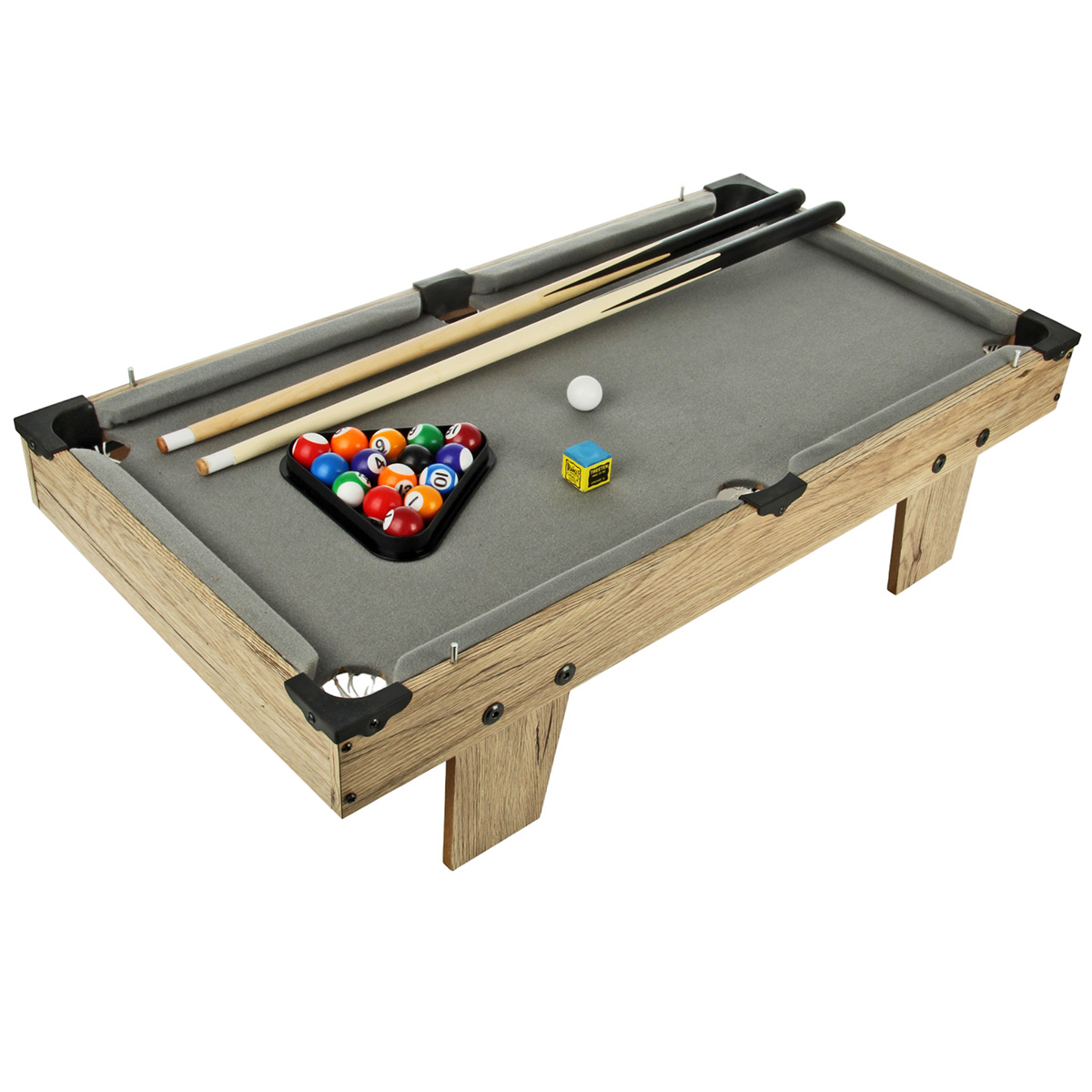 В наборе детали для сборки игровых площадок, 2 кия, 2 ракетки, 2 шарика, треугольник для бильярда, 16 бильярдных шаров, мел для киев, 2 биты, 2 шайбы, 2 мяча, щетка, 12 мягких накладок, чтобы ручки не бились о корпус, крестовая отвертка, 2 ключа, саморезы, инструкция по сборке.