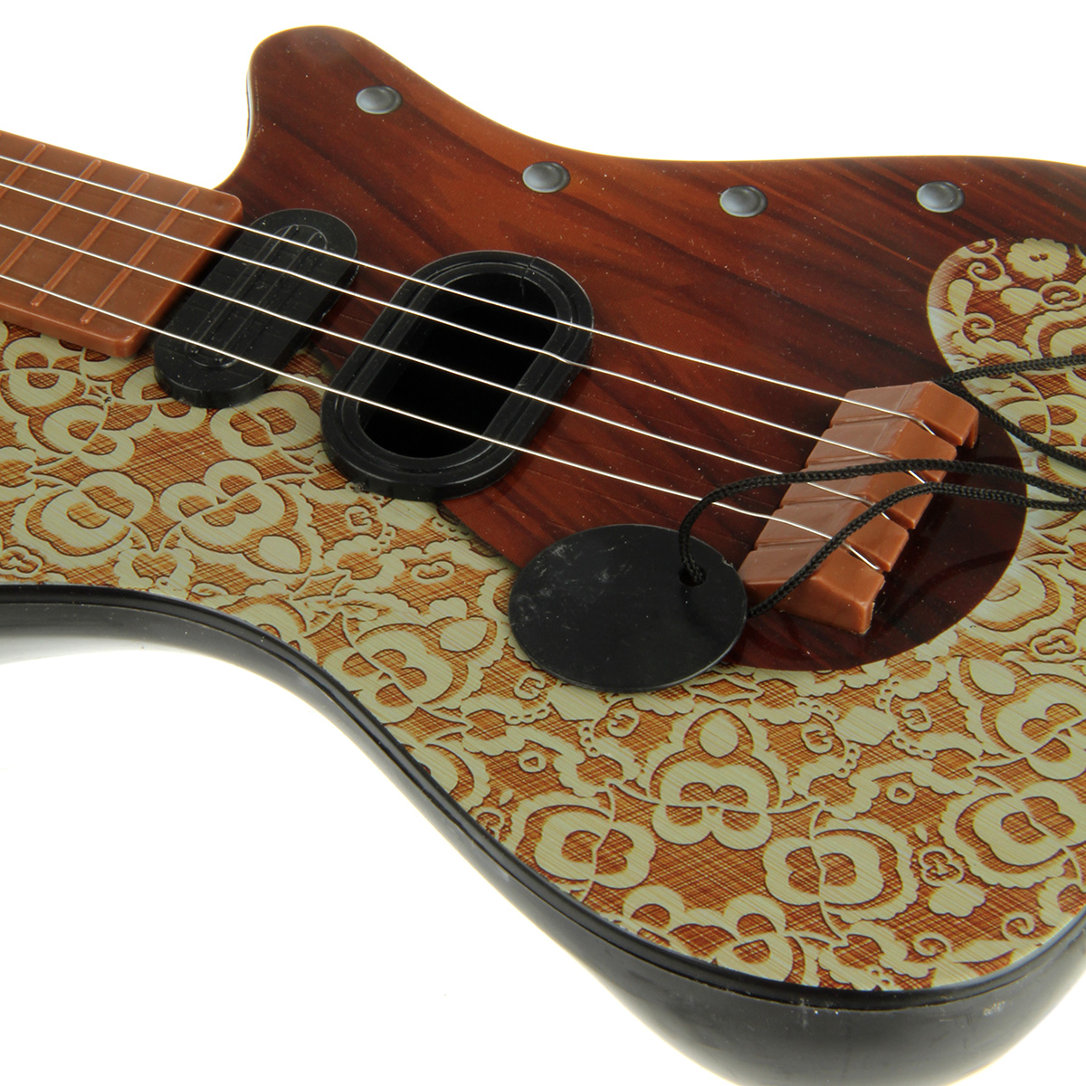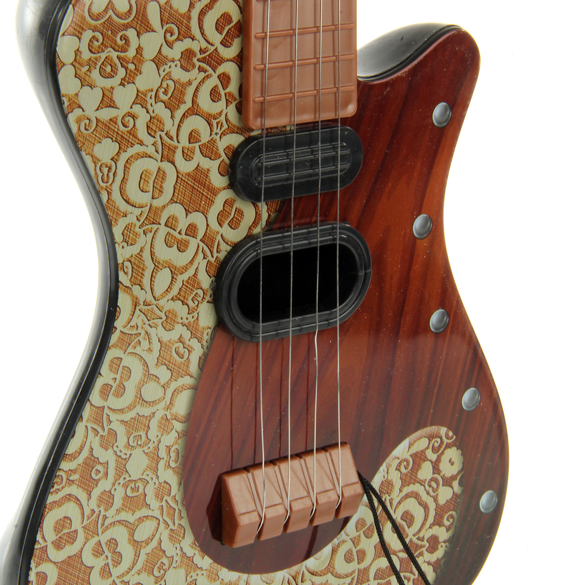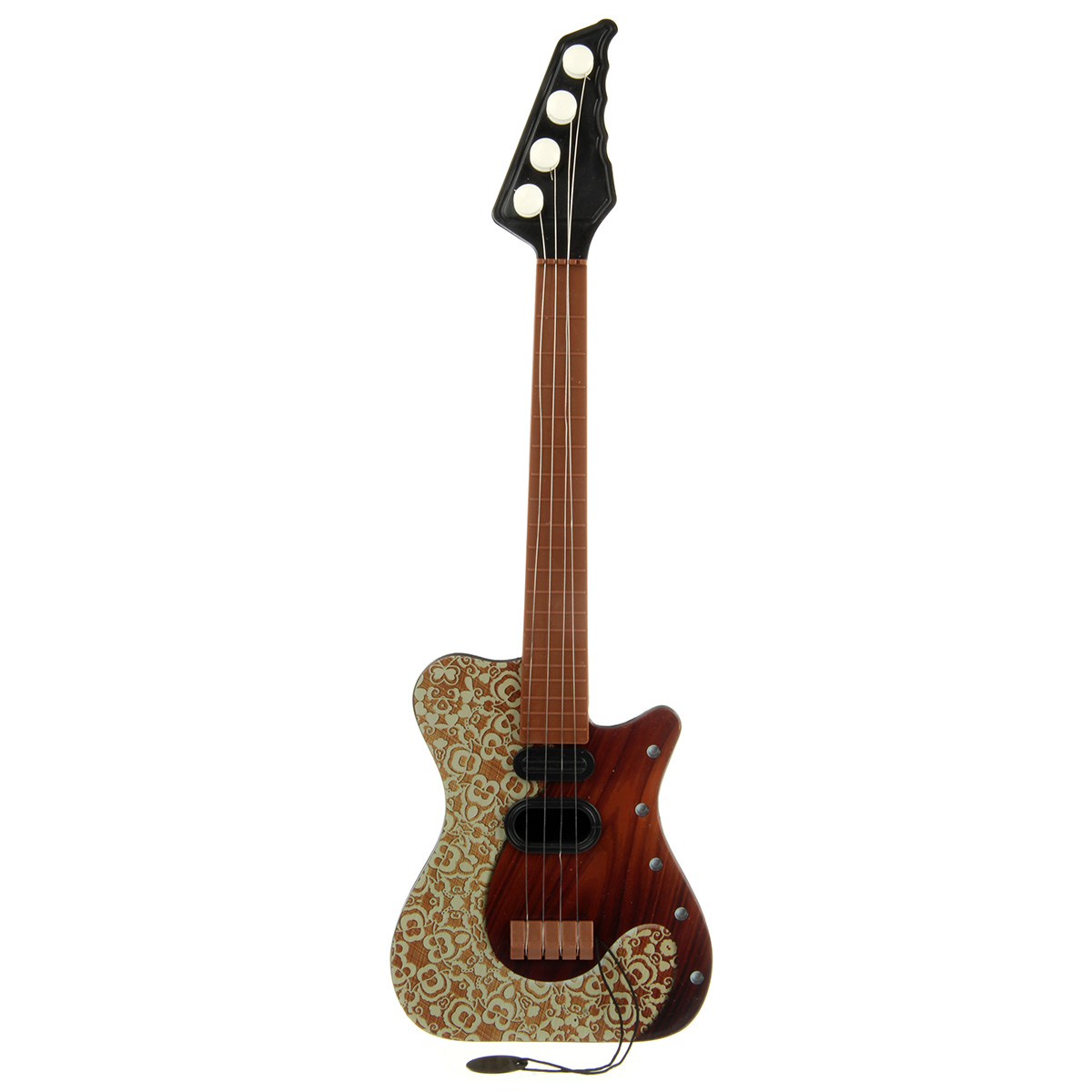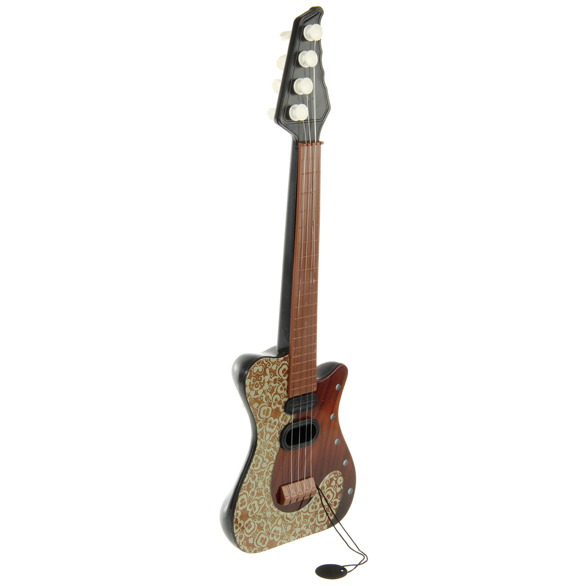 Игрушечная гитара с металлическими струнами, 4 струны. Классический дизайн и расцветка, хорошее качество исполнения, прочные и долговечные материалы. Подтягивая колки, можно настраивать инструмент. Играть на нем следует, как на обычной гитаре, будет издавать соответствующие звуки. Есть медиатор на веревочке.