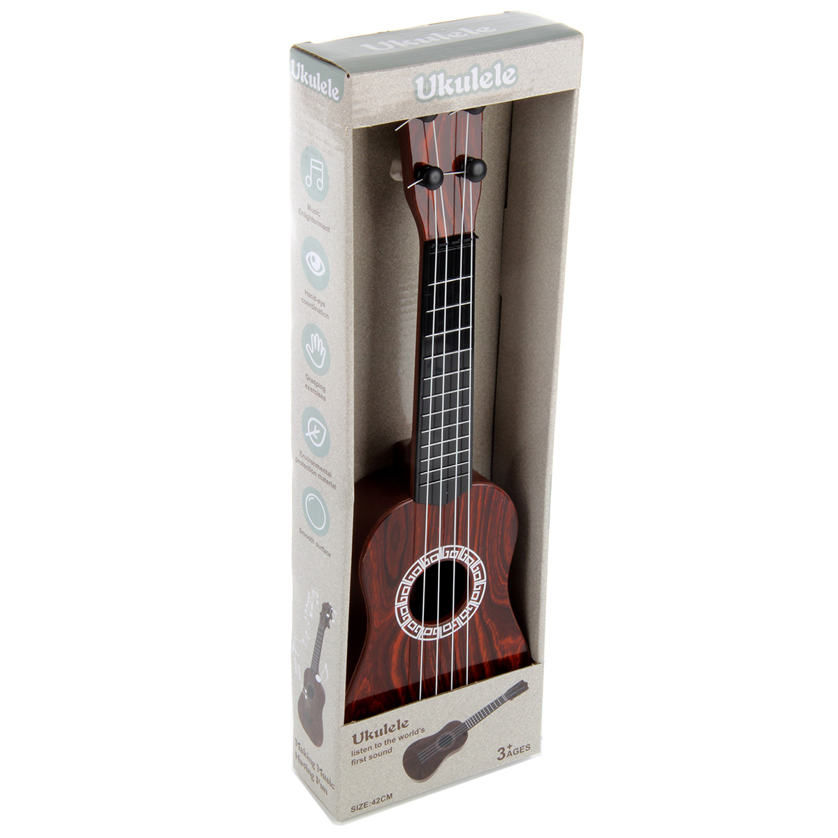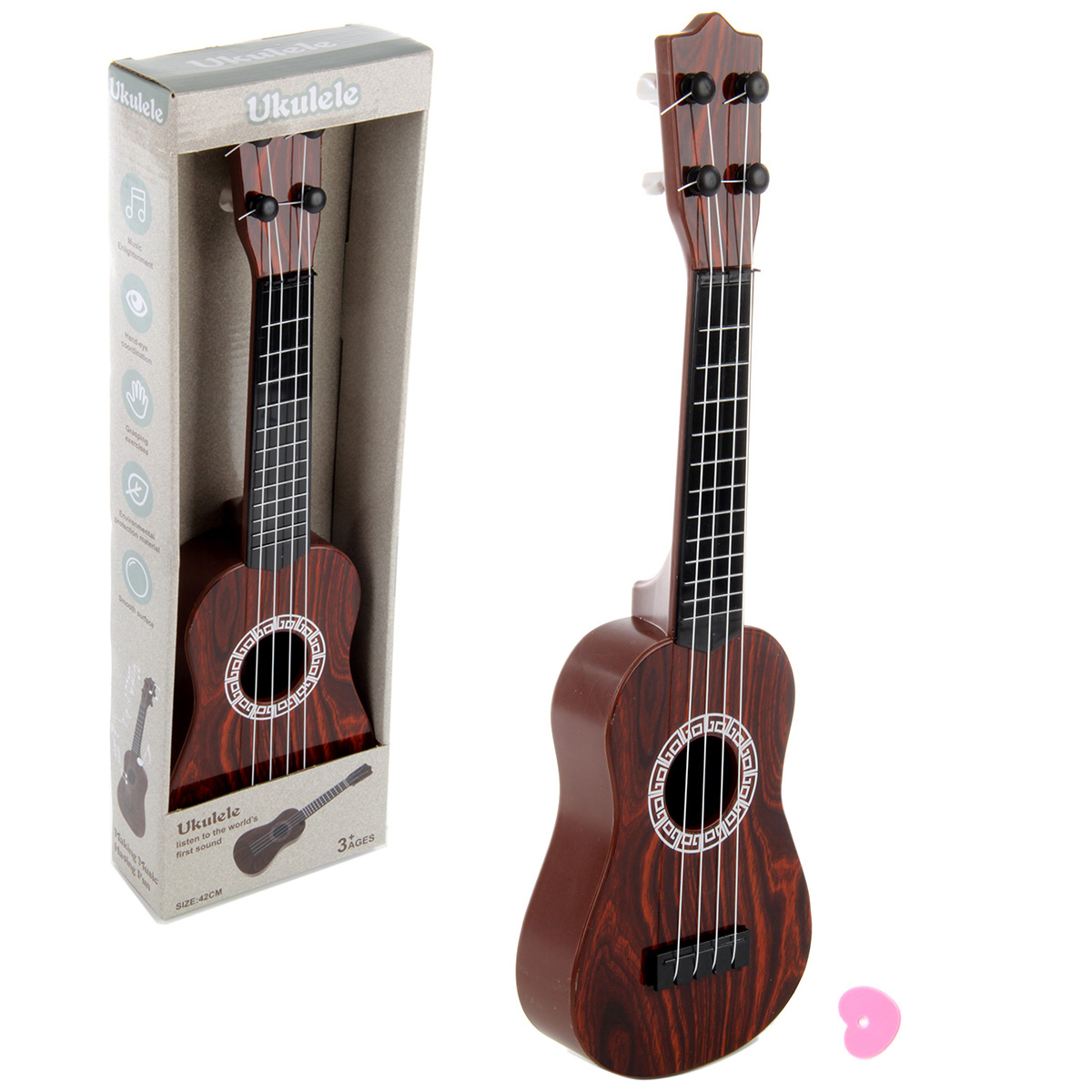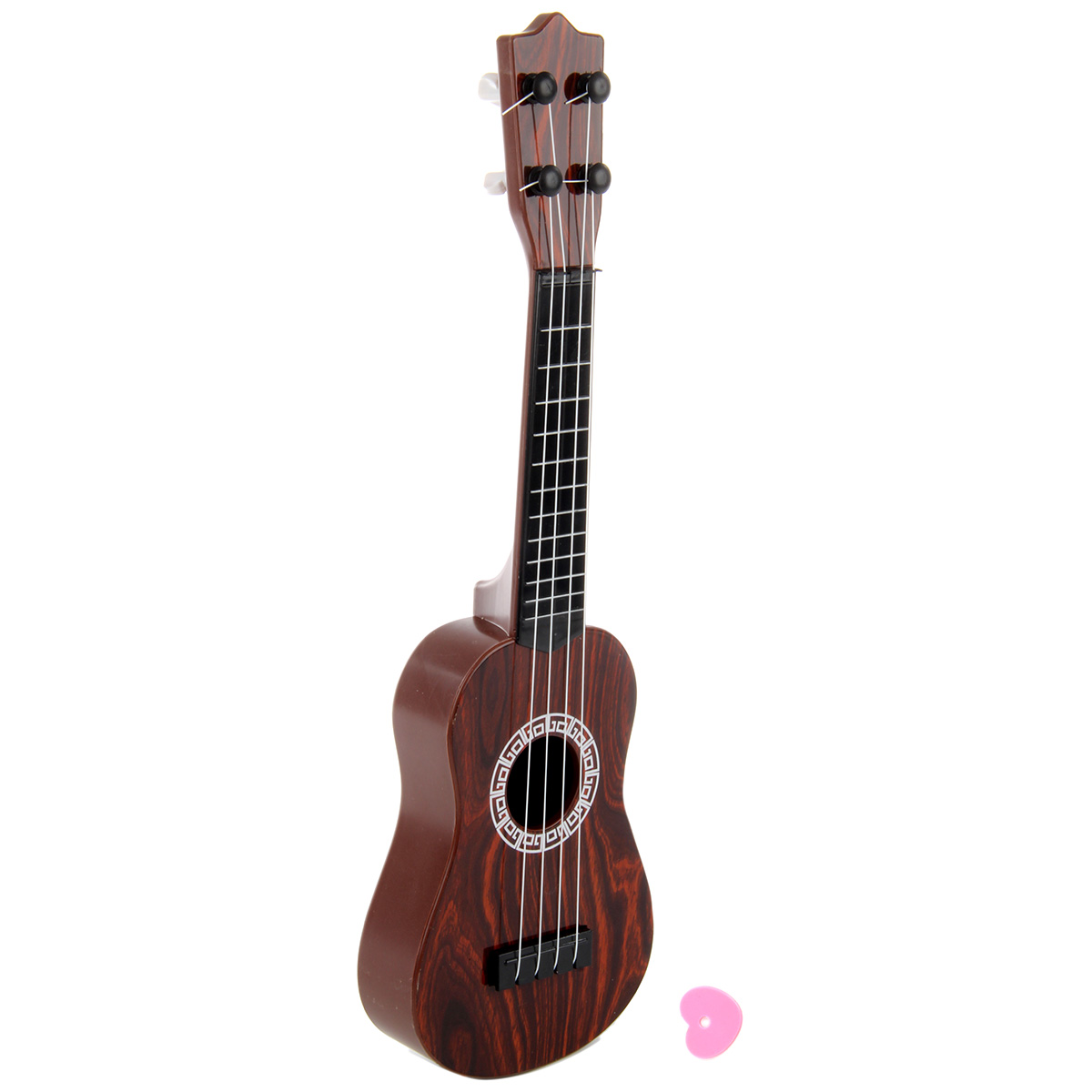 Игрушка укулеле с нейлоновыми струнами, 4 струны. Реалистичный дизайн, красивая и насыщенная расцветка, удобно ложится в руки. В комплект входят укулеле и медиатор. Подкручивая колки, можно настраивать инструмент. Играть следует, как на обычном инструменте, издает соответствующие звуки.