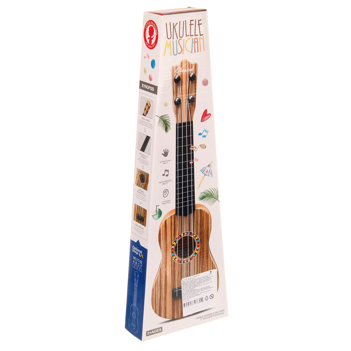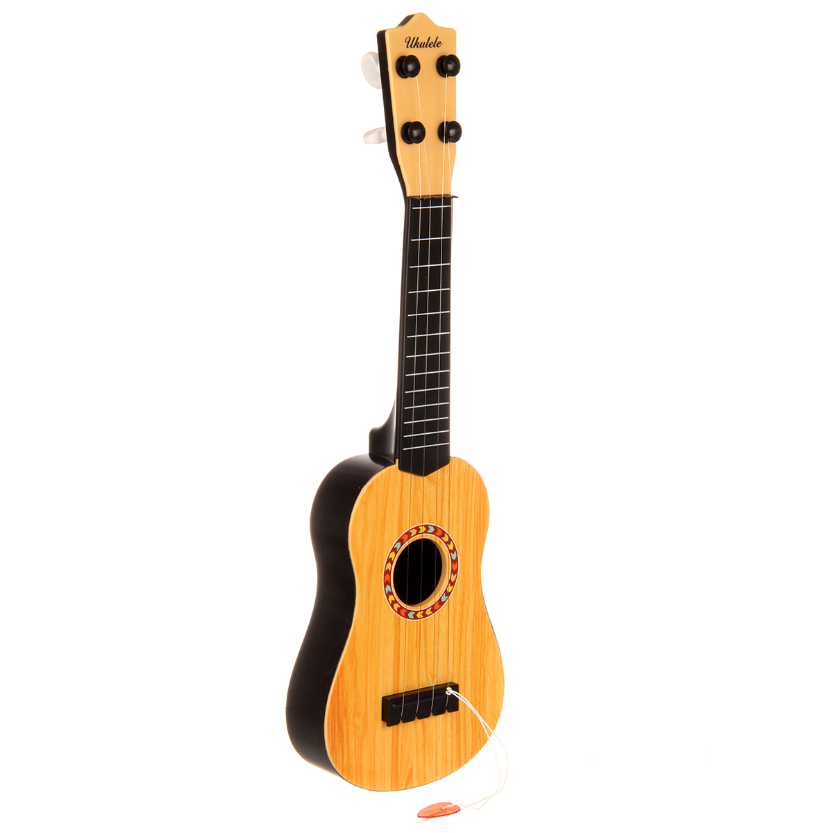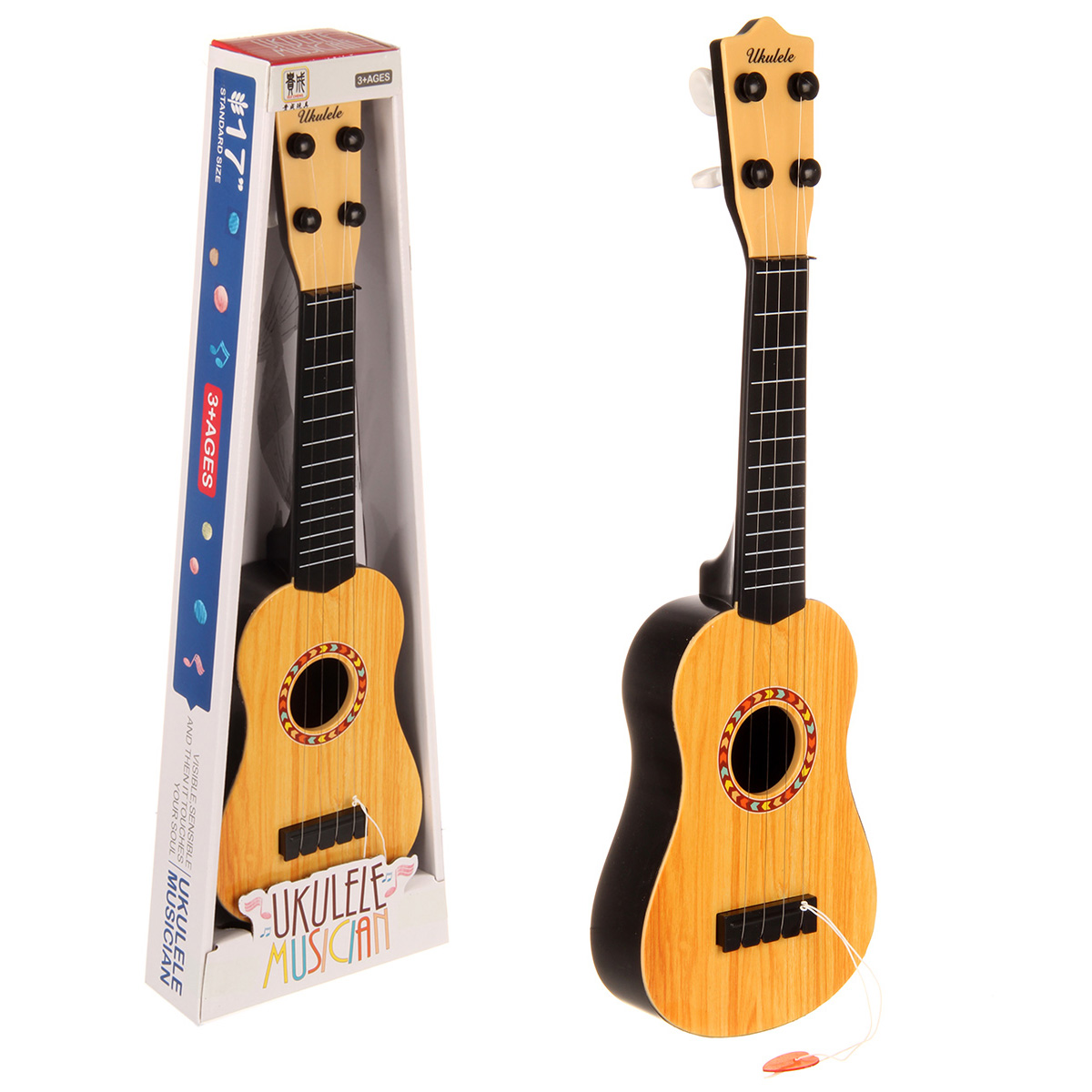 Игрушечная гитара с нейлоновыми струнами, 4 струны. Реалистичный дизайн, красивая и насыщенная расцветка, удобно ложится в руки. В комплект входят гитара и медиатор на веревочке. Подкручивая колки, можно настраивать инструмент. Играть следует, как на обычном инструменте, издает соответствующие звуки.
