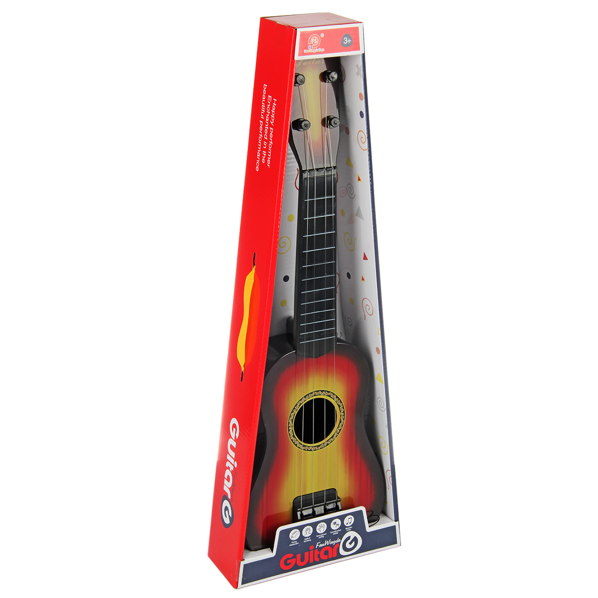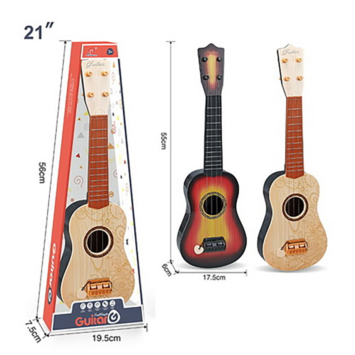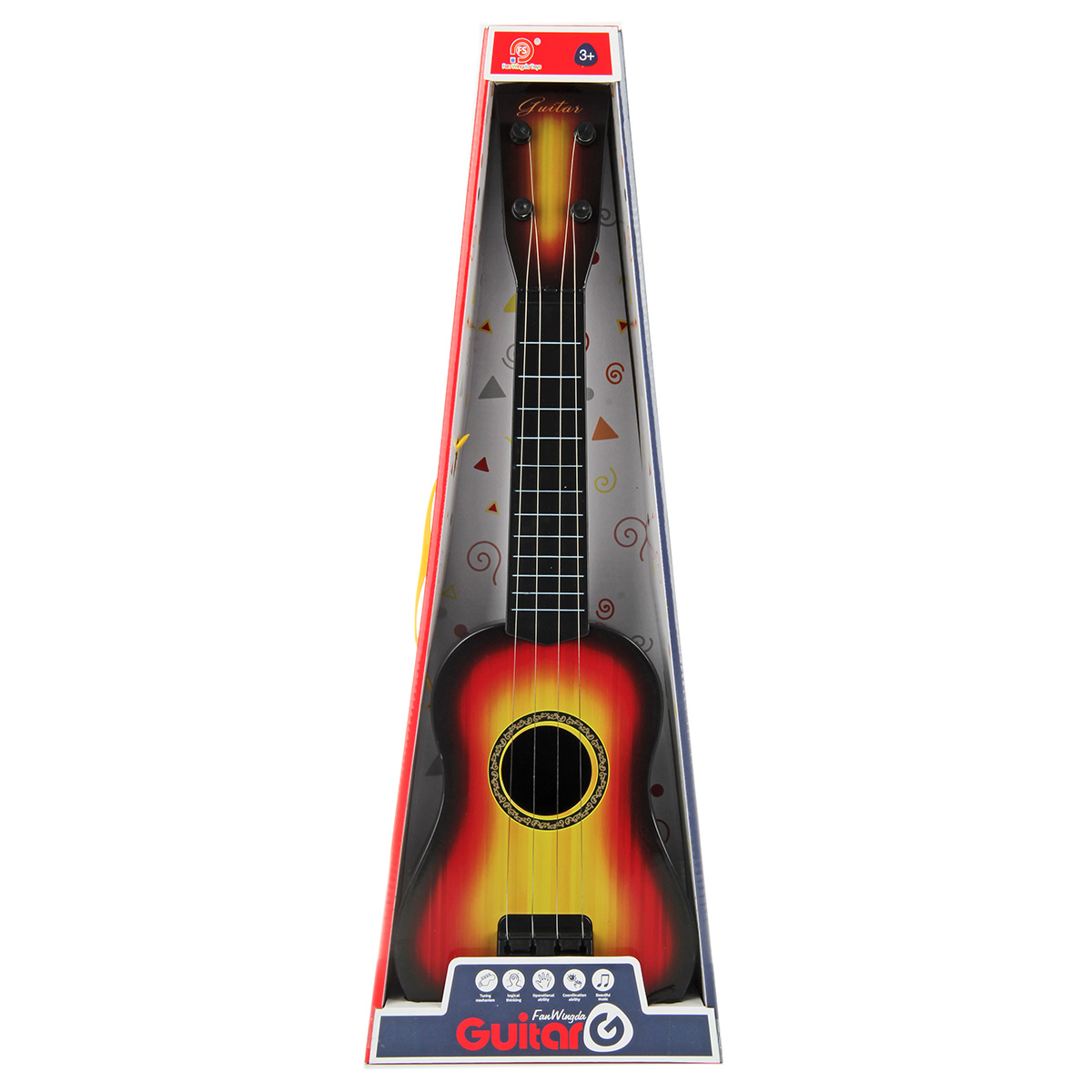 Игрушечная гитара в классической расцветке и качественном исполнении. Металлические струны, гарантирующие более звонкое, мелодичное и яркое звучание, также у металлических струн более долгий срок эксплуатации в отличие от нейлоновых. Музыкальный инструмент имеет медиатор на веревочке, всегда под рукой, не потеряется. Музыкальная игрушка в компактном размере, удобно держать в руках и брать с собой, изготовлена из прочных и долговечных материалов, отличается вниманием к деталям. Игрушка станет замечательным подарком мальчику и девочке на Новый год и День рождения.