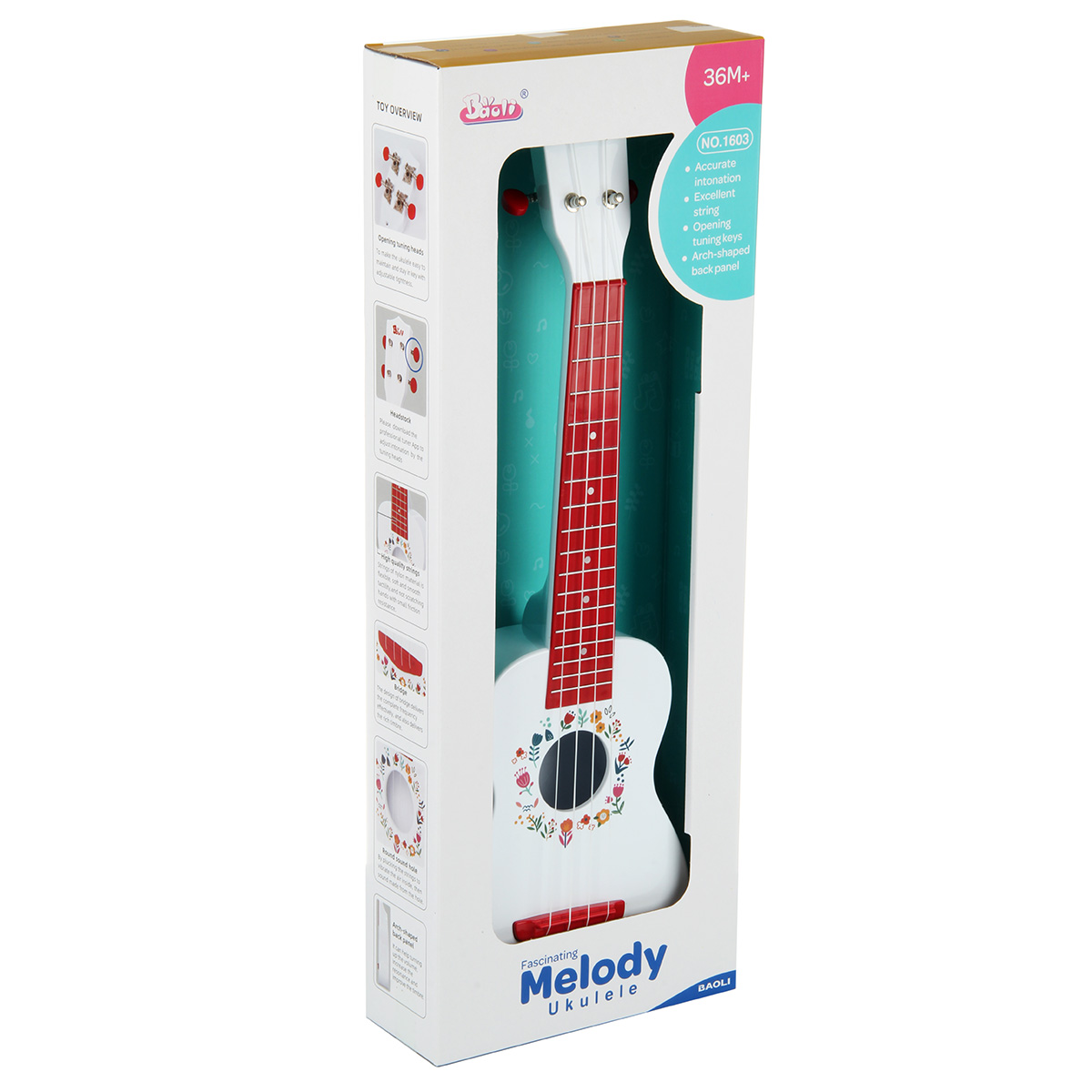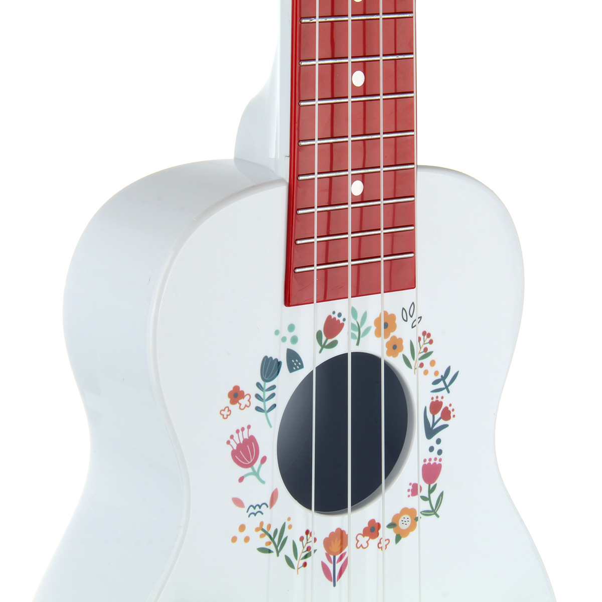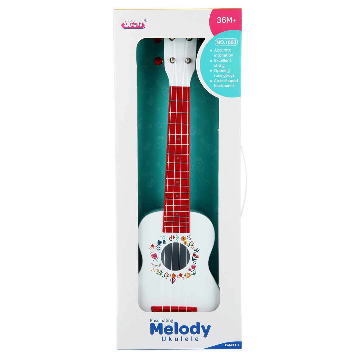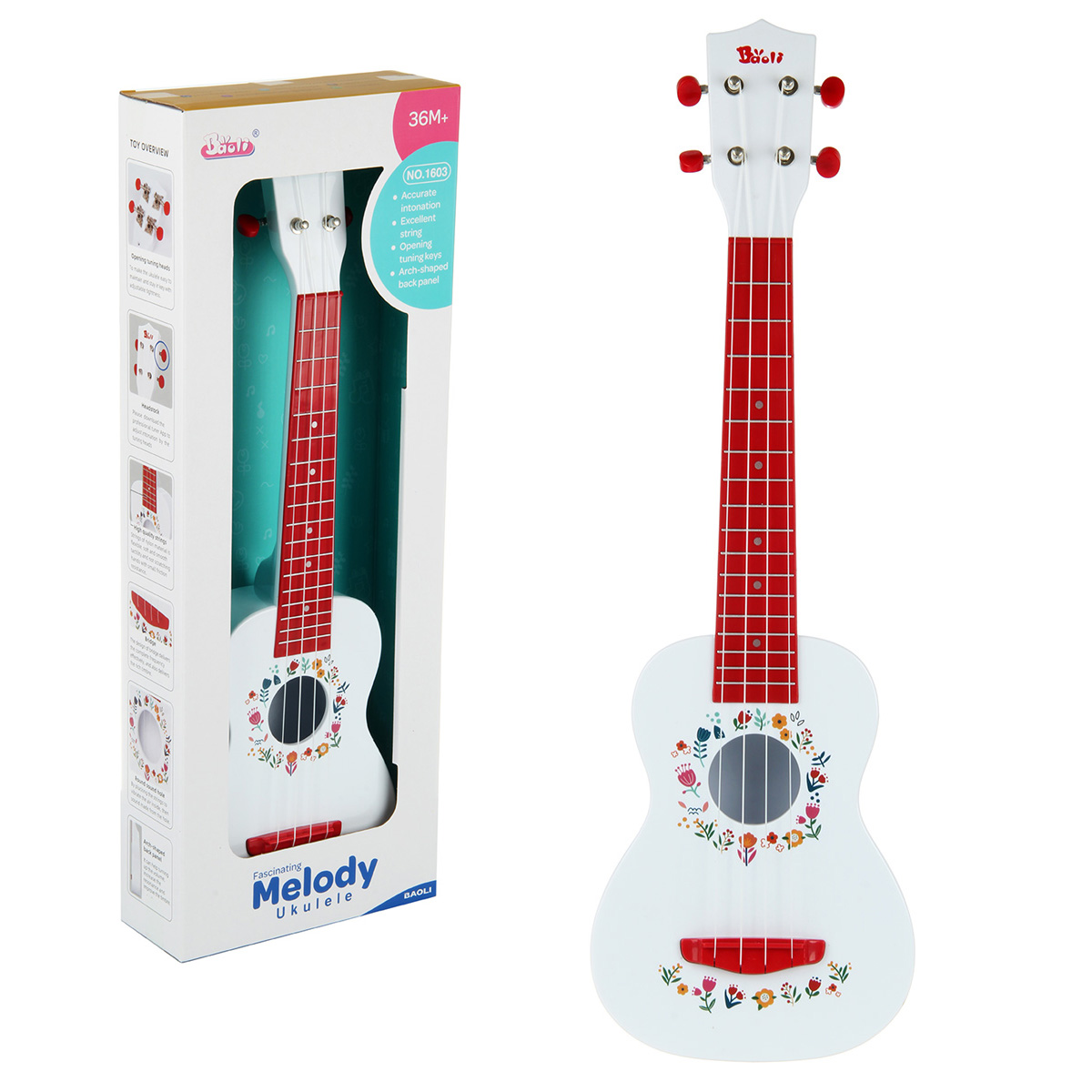 Игрушка укулеле в благородном белом цвете и классическом элегантном дизайне. Имеет высоту инструмента концерт укулеле, который отличается более широким диапазоном звучания, чем укулеле сопрано. Большое количество ладов и компактные размеры, длинный гриф, позволяющий более широкое расположение ладов, что дает более плавное ощущение игры. Силиконовые струны, комфортно для детских пальчиков, идеальный инструмент для начального обучения игре. Высокое качество исполнения и долговечные материалы, прочные металлические колки, гарантирующие лучшую настройку укулеле, надежная фурнитура. Музыкальный инструмент станет замечательным подарком для детей на Новый год и День рождения.